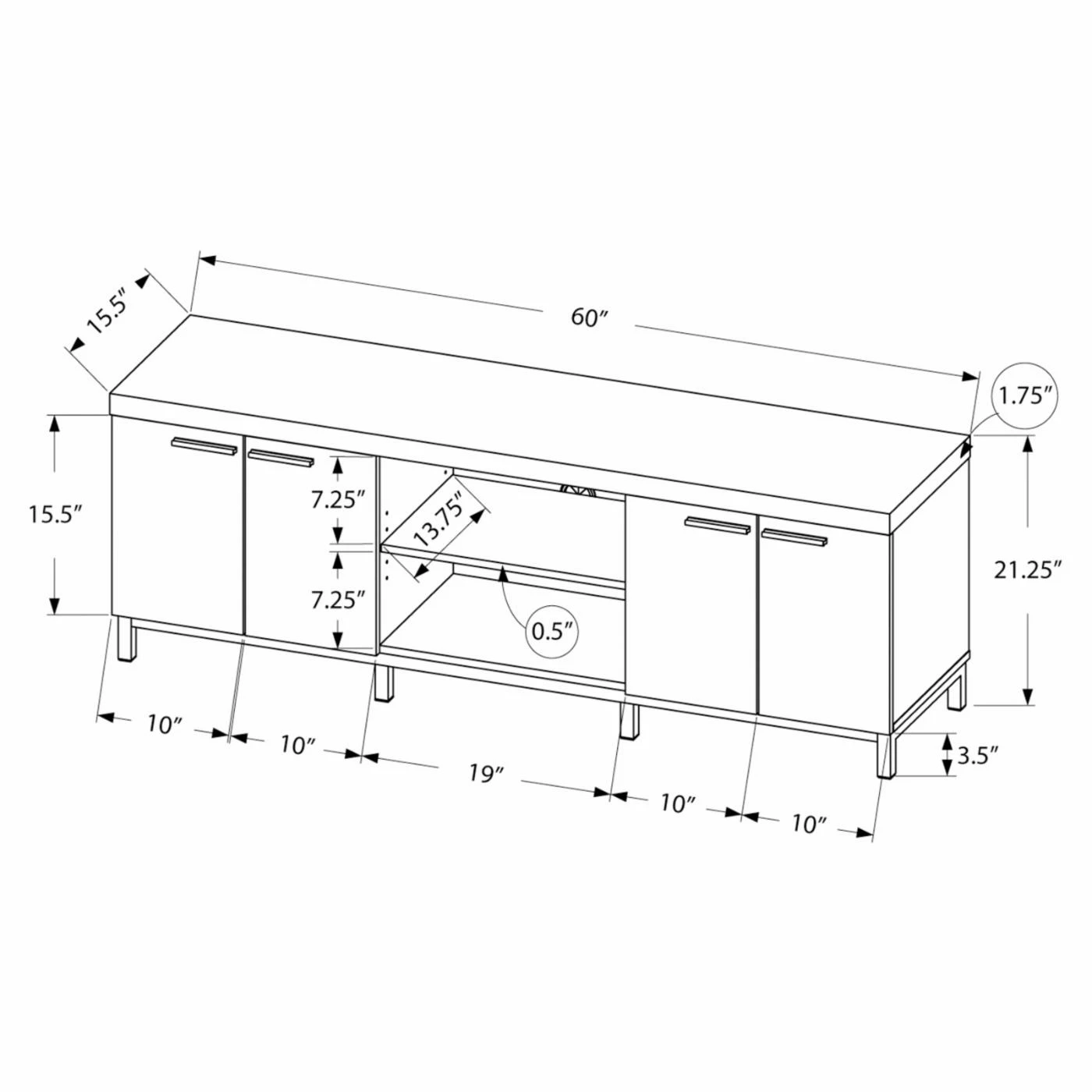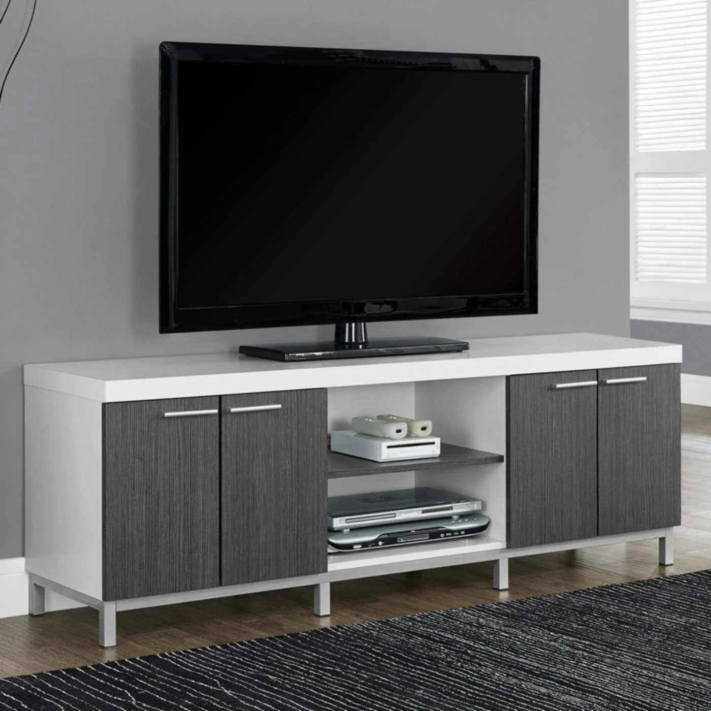 Keep your living room organized and full of contemporary style with the Monarch 60 in. TV Console. This beautiful console is constructed of durable particle board, metal, and laminate in your choice of finish. The thick paneled frame and cabinet doors are accented with sleek silver colored handles and supported by modern-style silver legs. The console can accommodate flat-panel televisions up to 66 inches and has loads of storage space. The center has two open storage shelves, the perfect place for your electronic components. Store your additional media, games, accessories, and more in the outer double-door cabinets with adjustable shelves. Its two-tone modern style makes a big impression in any space.
