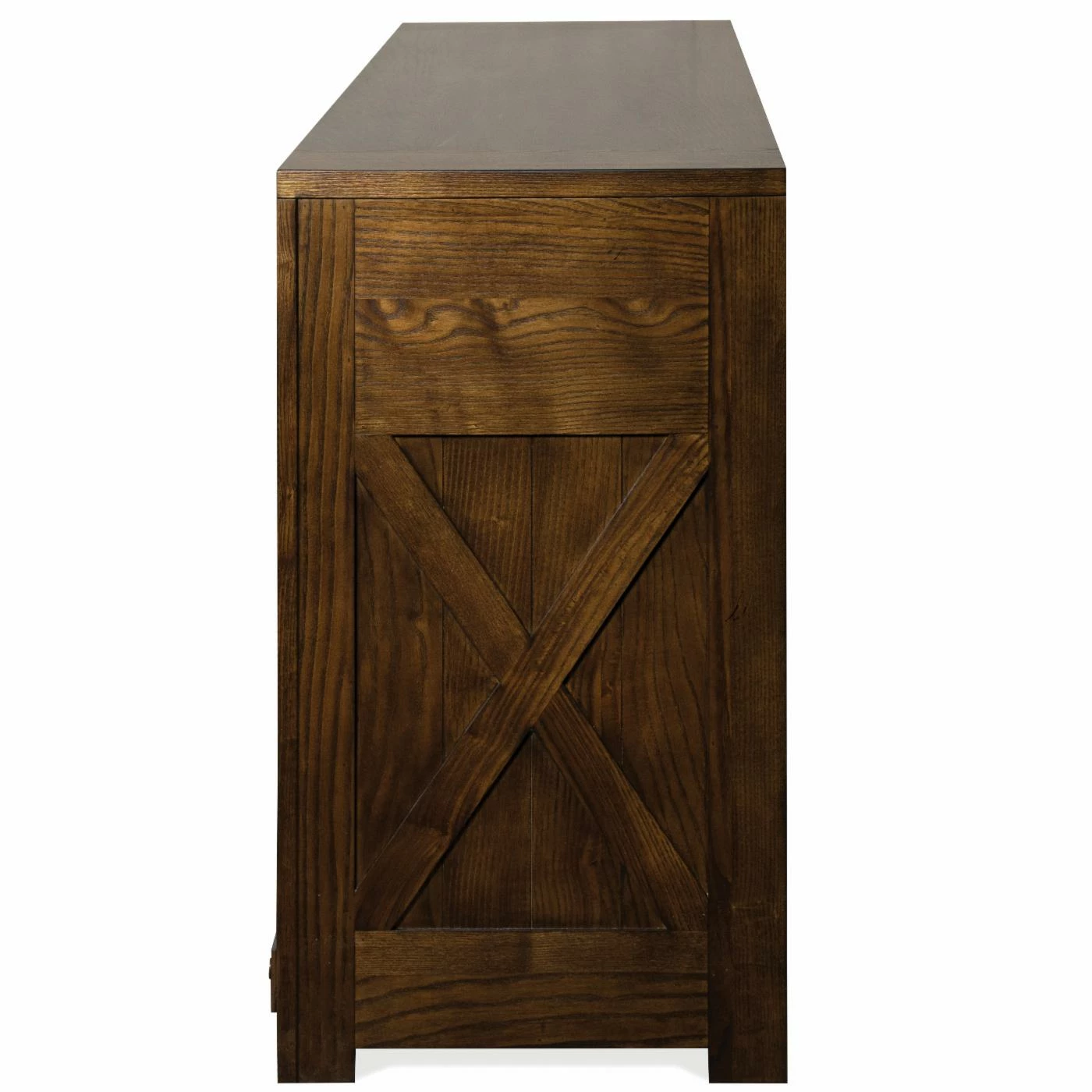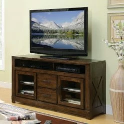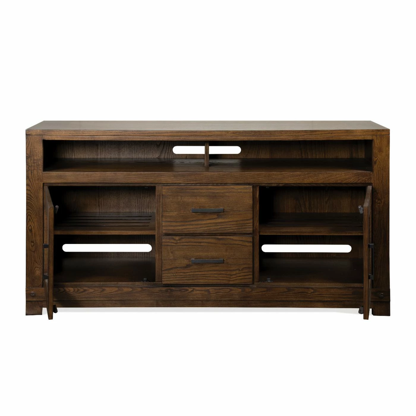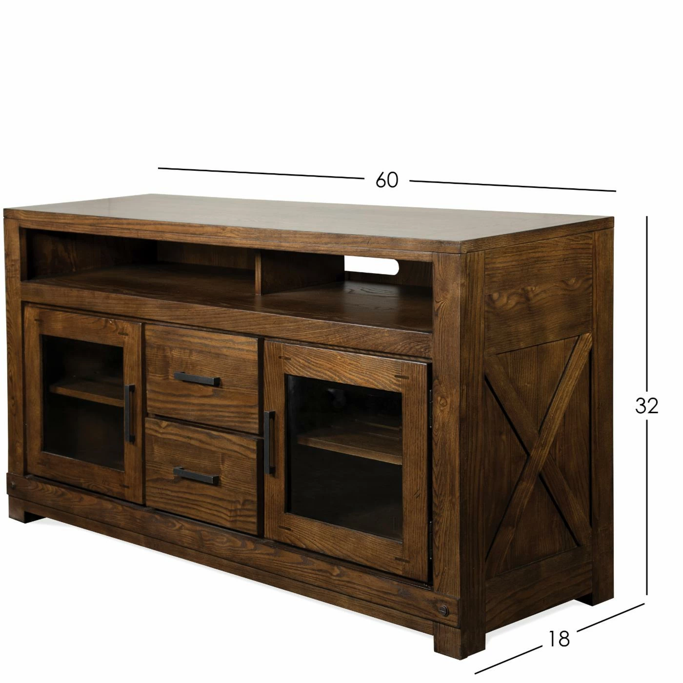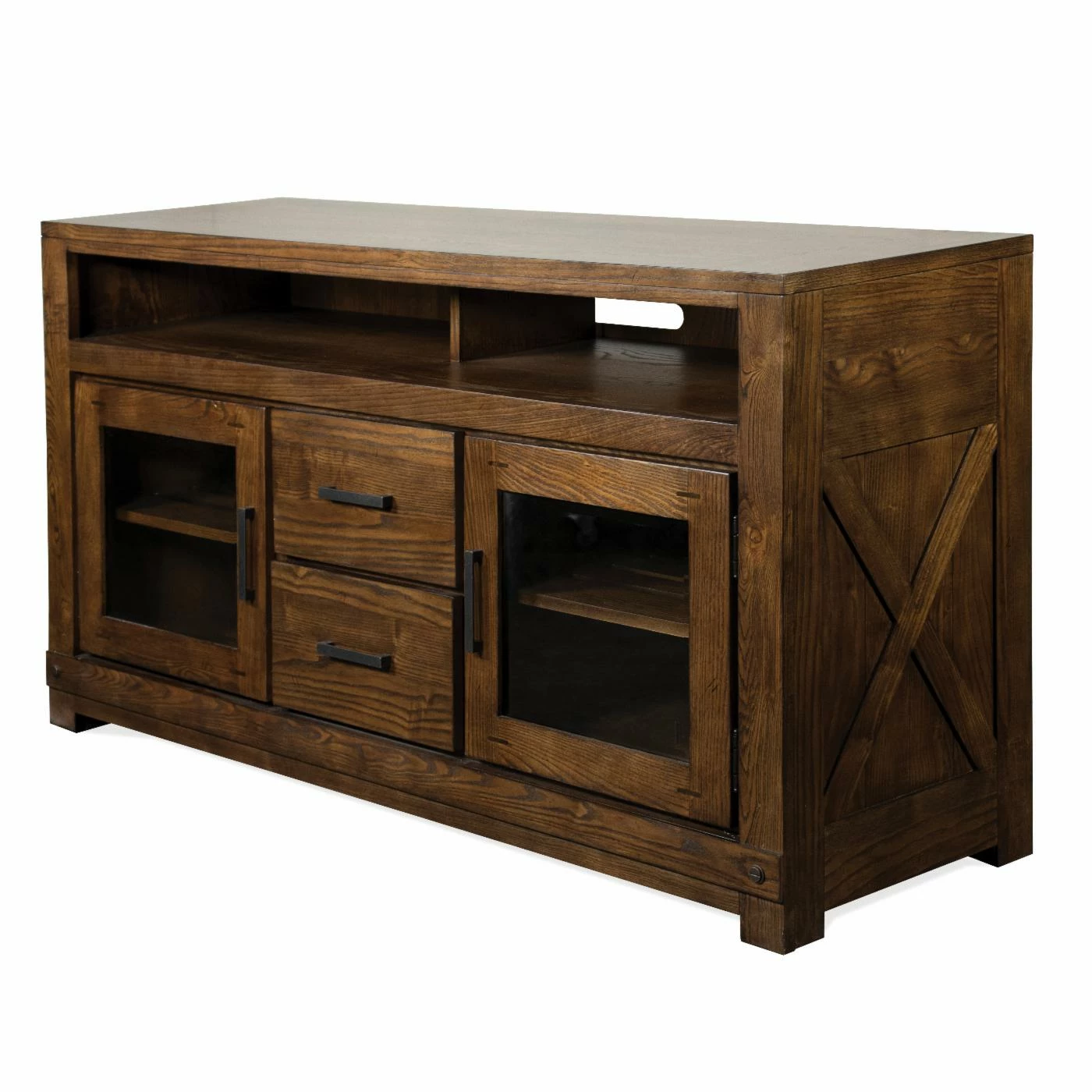 The substantial design provided by the Riverside Windridge TV Console with Glass Door β Sagamore Burnished Ash accentuates its high-quality construction. Featuring ash solid hardwood and veneers in a Shaker/Mission style, this piece is durable and long lasting.