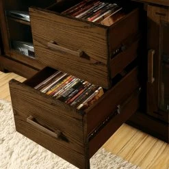 The included storage space offers two drawers for storing unsightly DVDs and gaming controllers, and the two beveled door cabinets each offer an adjustable shelf for tucking away media boxes and consoles, and whatever else you may need to stow. A top shelf provides exposed storage space for speakers or something you need easy access to. For easy setup, wiring access and ventilation is provided.