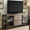 Like you, the Acme Furniture Aberdeen TV Stand is inspired by vintage movies. This TV stand is carefully crafted with a wood frame and retro brown top-grain leather. Its generous top offers room for your wide screen TV and decorative items. Storage features include two media openings plus wire management, two roomy drawers, and two spacious cupboards. Design details include top-grain leather edging, wood trim with brass nail heads, and leather handles with brass-finished hardware.