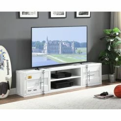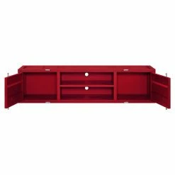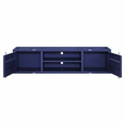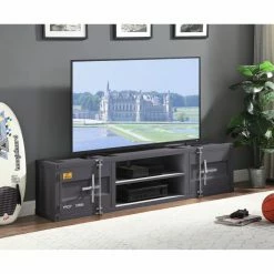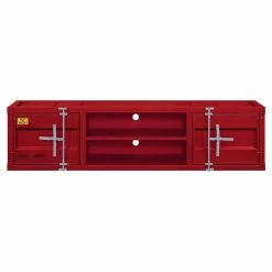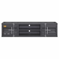Offset your televisionโs sharp modern lines with something just as modern and more dynamic thanks to the Acme Furniture Cargo TV Stand. This TV stand is made from corrugated metal, making it look like a repurposed cargo container. Two open console shelves (with vented backing) sit at the center, perfect for installing your game console or video player. Two bolt-latched cabinets are incorporated into the sides, offering secure, concealed storage. Customize the stands look with your choice of available color option.