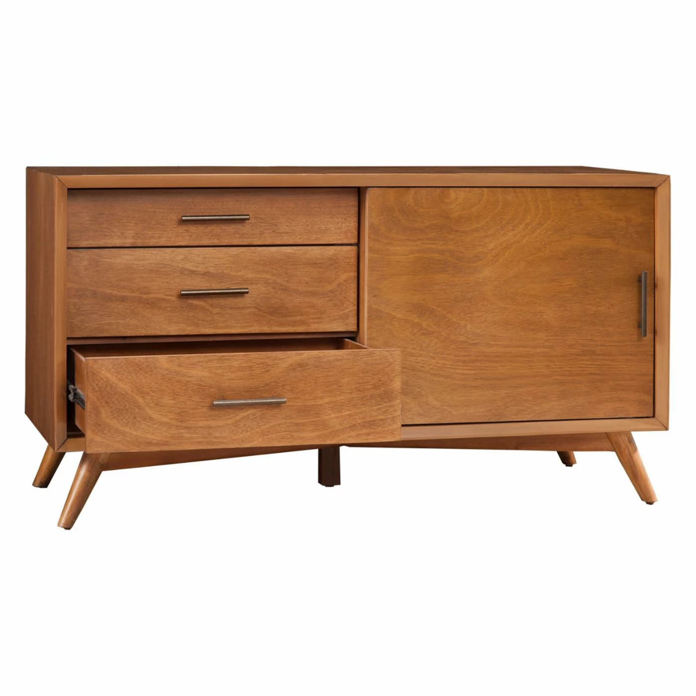 Three side drawers are perfect for storing DVDs, books, manuals, games, remotes, and more. Each drawer features quality English dovetail construction for strength and generous storage capacity, as well as ball-bearing metal drawer glides for smooth opening and closing. Part of the Flynn Collection, this TV console is accented with sleek hardware, tapered, mid-century modern legs, and brings welcoming style to your entertainment area or living room.
