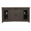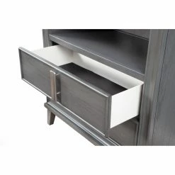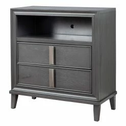 The Alpine Furniture Lorraine TV Media Chest is combines style and storage. Constructed of solid and engineered wood, this media chest is in a chic, dark gray finish. An open shelf sits above two drawers. A wire management hole allows you to keep your electronics neat and organizes. Each drawer has a vertical metal drawer pull in a silver finish, adding visual interest to the piece. Some assembly required.