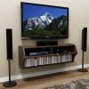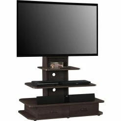 Sleek, contemporary, and loaded with storage options, the Altra Furniture Galaxy 70 in. TV Stand – Dark Walnut is the perfect media solution for the modern home. This sleek TV stand is constructed of durable engineered wood, particle board, and solid wood, and comes in a rich, dark walnut finish. It features a center spine for mounting your flat-screen TV, which also has a cord management system to keep wires tucked away and untangled. There are two drawers for tucking away clutter, and three fixed, floating shelves that offer space for holding gaming consoles, TV components, stereo systems, and decorative items. This beautiful TV stand adds a hint of modern style to any room in your home.
