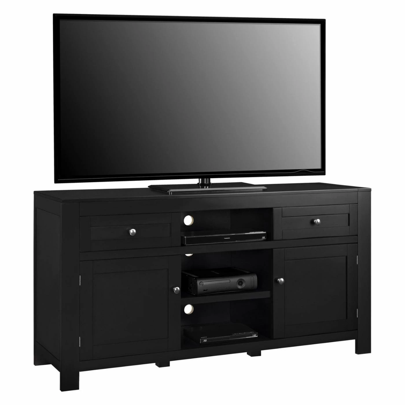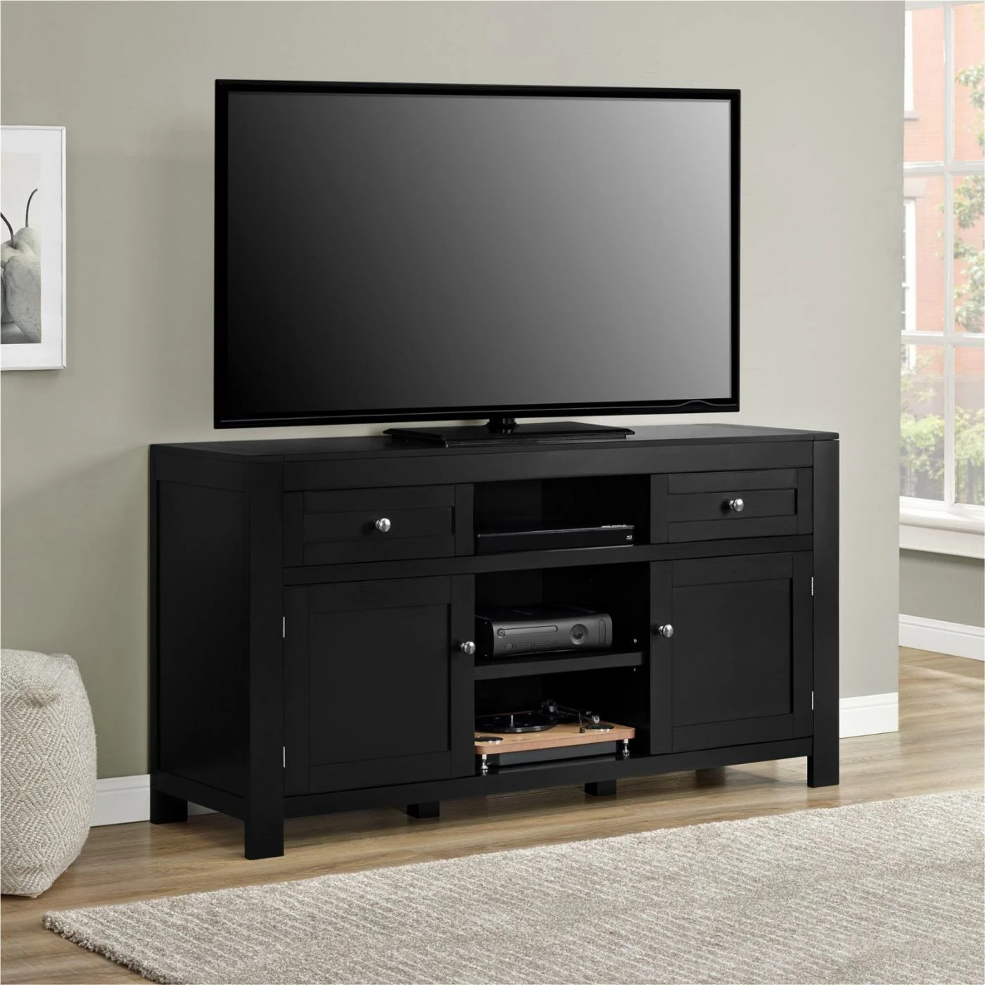 The clean lines and sleek design of the Altra Furniture Hadley 60 in. TV Stand make it a stunning addition to your entertainment space. This piece is made with engineered wood in a black finish to suit any space and dΓ©cor. Store your media components and accessories with the included three open shelves, two drawers, and two cabinets with adjustable shelves inside. Wire management is included to cut down on clutter from cords.