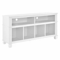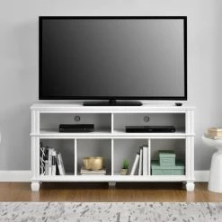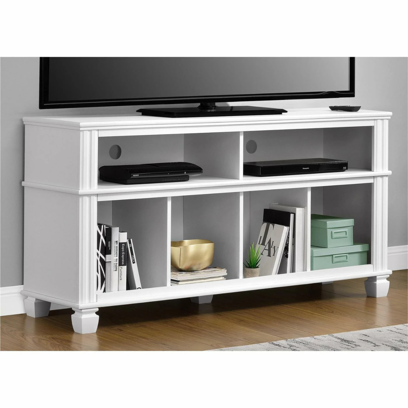 Fluted details, tapered legs, and a white finish give the Ameriwood Home Woodcrest TV Stand its cottage appeal. More than just a designer piece, this TV stand accommodates your 55-inch flat screen TV on top and boasts two media openings as well as cord management holes. Four generous open cubbies below offer room for display pieces, media storage, and more.