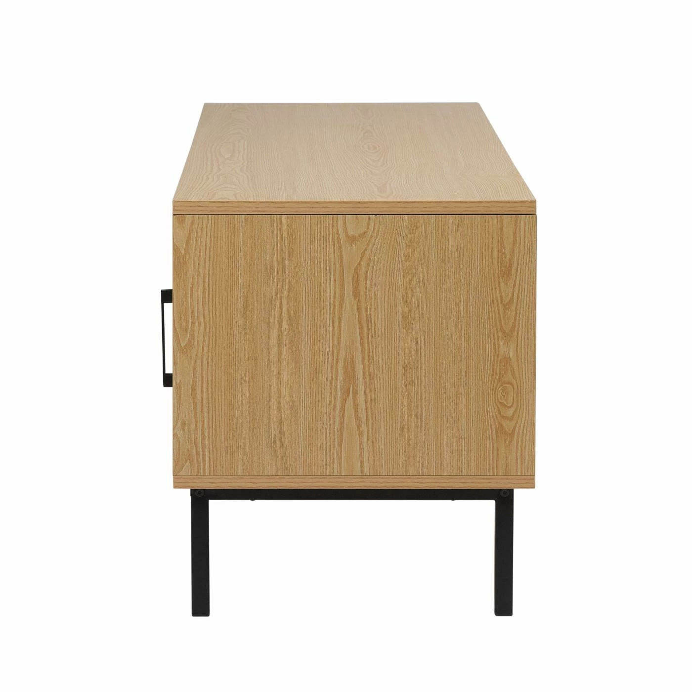 - Warm honey-tone woodgrain cabinet and doors on a modern black metal base