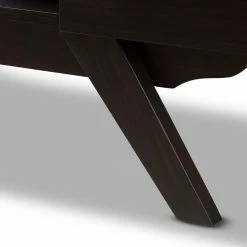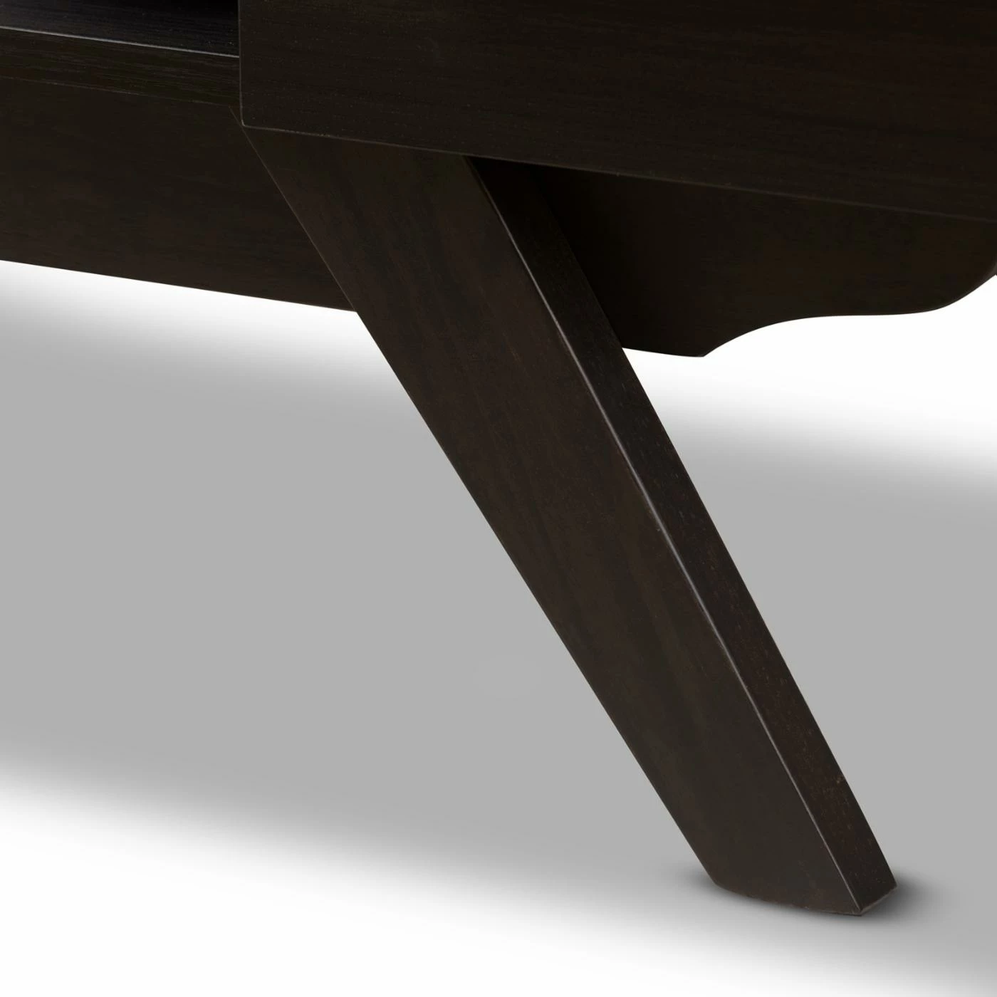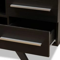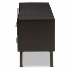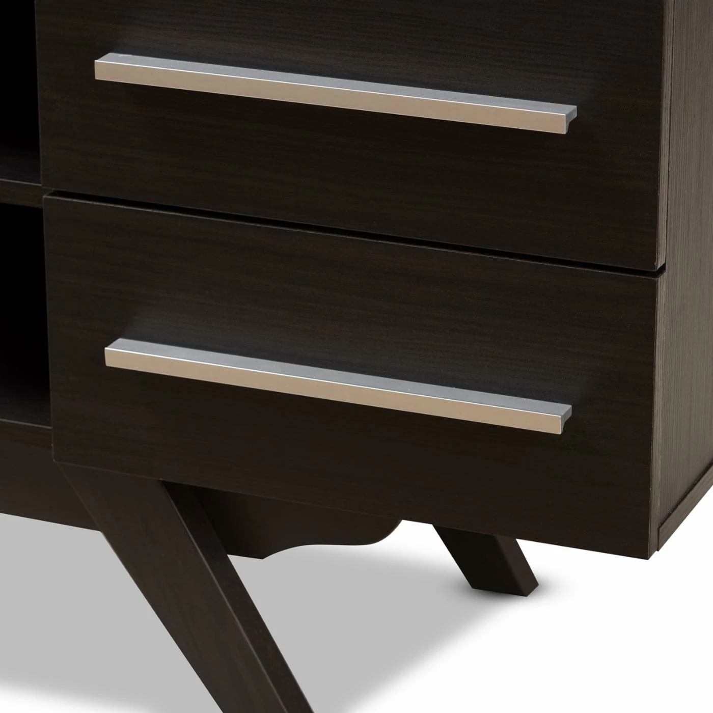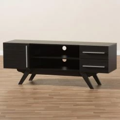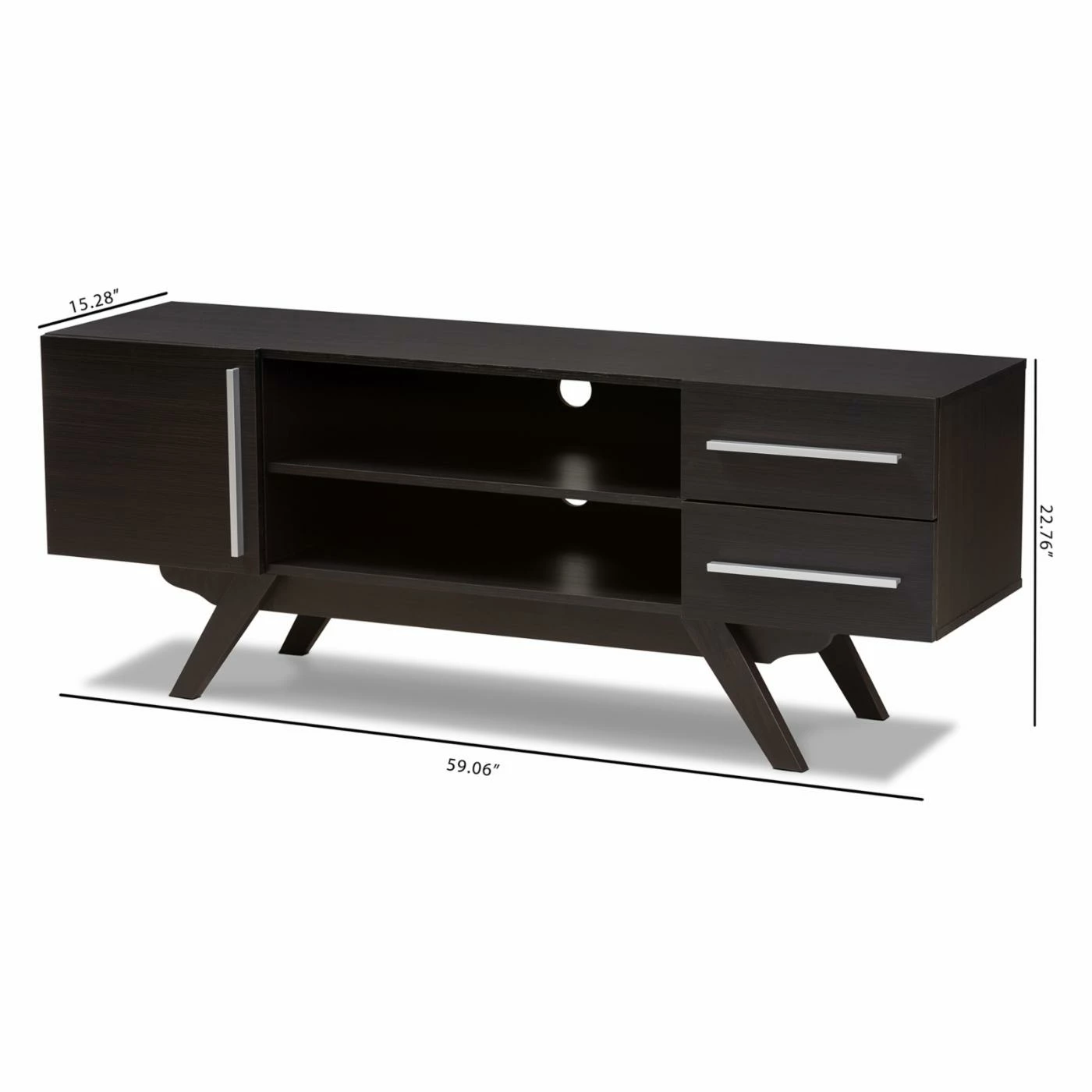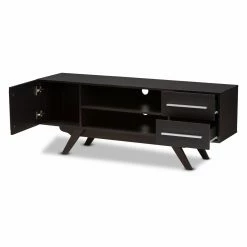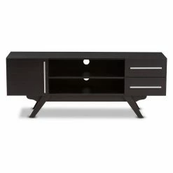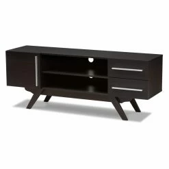 TVs have come a long way from the 1950s, but storage and display stands like the mid-century-inspired Baxton Studio Ashfield TV Stand havenβt needed much updating at all. This one preserves the eraβs classic low-lying, artfully angled lines in a fresh, super-durable material. The warp-resistant engineered wood and solid rubberwood legs are finished in a sleek dark brown hue. At the center, two open shelves can hold gaming and DVR systems. On one side, two drawers catch remotes and guides, and on the other side, a door opens to internal storage space for additional units, game cartridges, music, and more. Wire management holes at the back manage cord clutter, and sleek silver powder-coated linear handles finish the front. Assembly is required, and a 30-day manufacturerβs warranty is included.