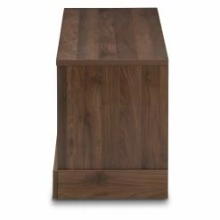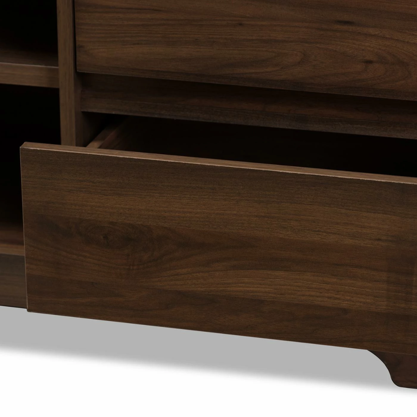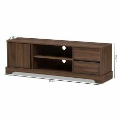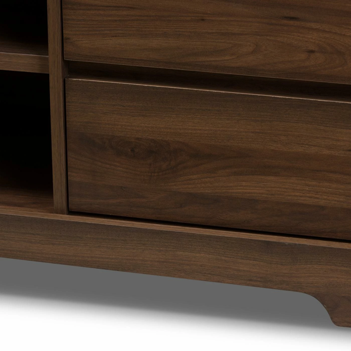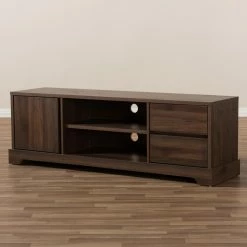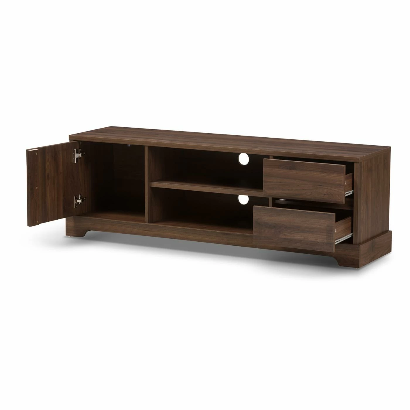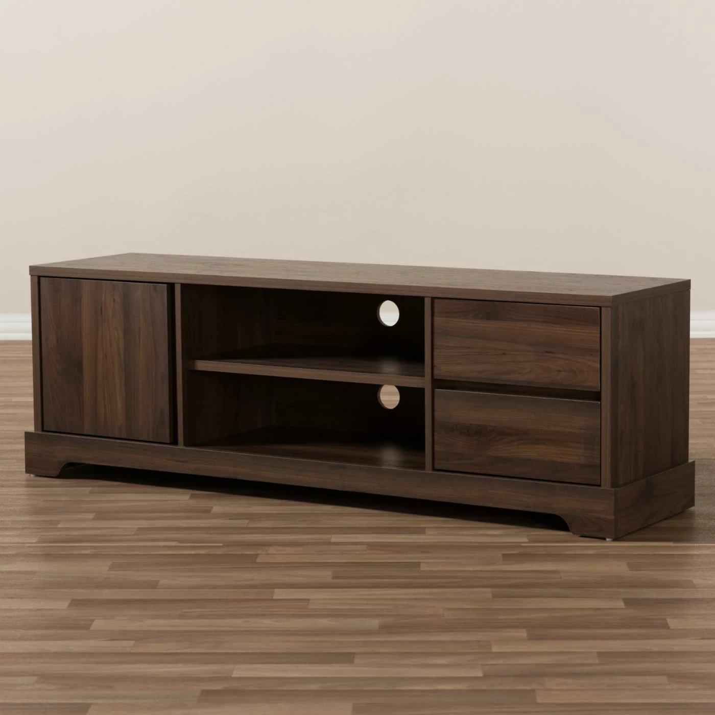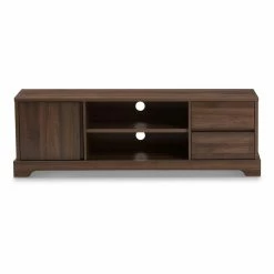 Clean, contemporary style makes the Baxton Studio Burnwood Modern and Contemporary Wood TV Stand – Walnut a welcomed addition to any space. This durable engineered wood TV stand accommodates TVs with screens up to 59 inches wide, and offers plenty of storage for media with a cabinet, two open shelves, and two drawers. The streamlined design is complemented by a walnut finish laminate.