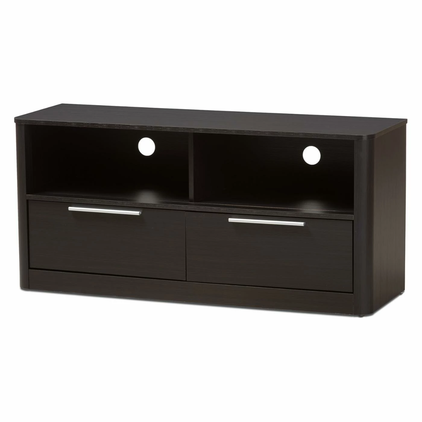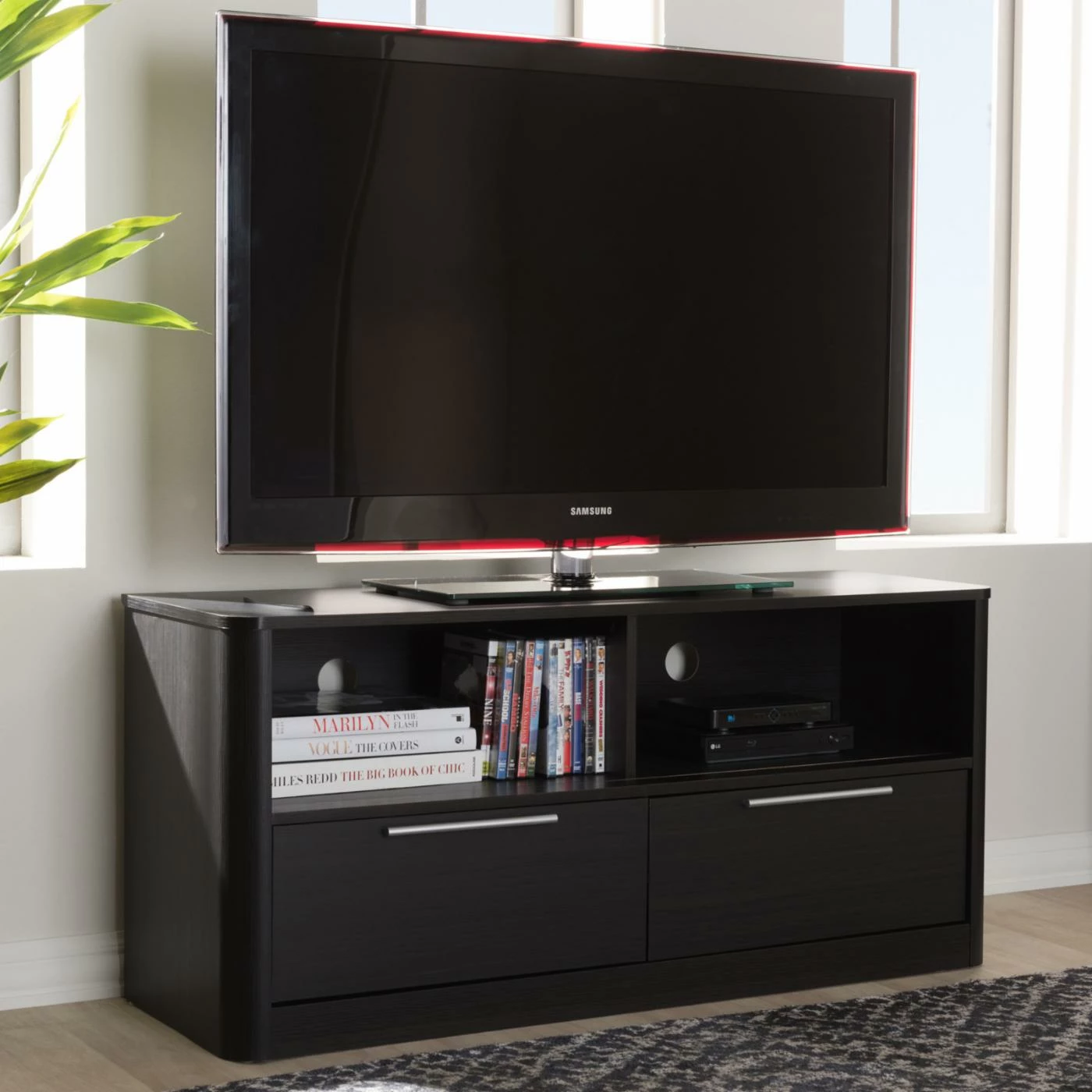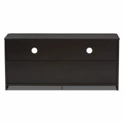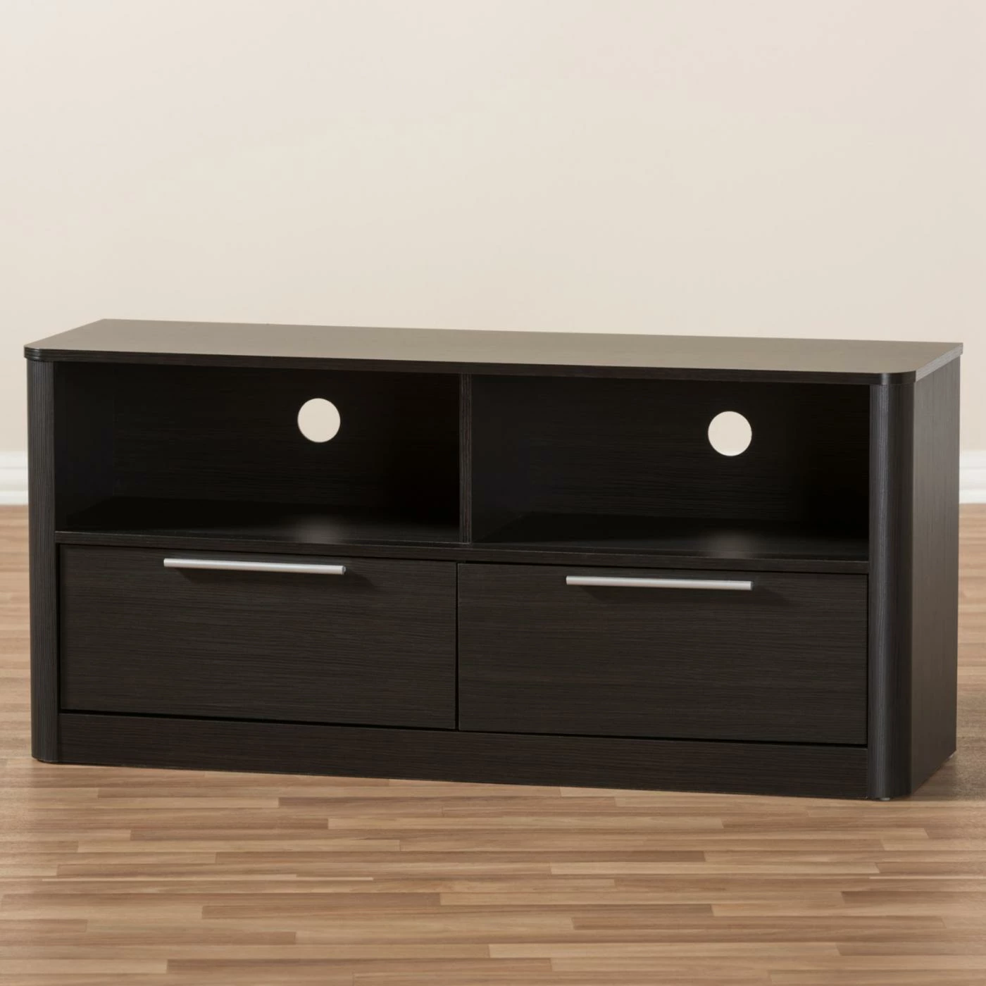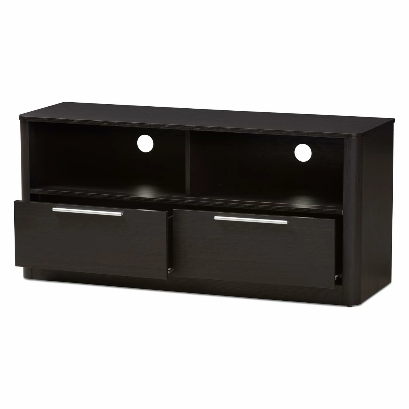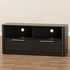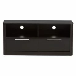 Give your entertainment area a makeover when you add the Baxton Studio Carlingford Modern and Contemporary Wood 2-Drawer TV Stand. This sturdy engineered wood TV stand offers plenty of storage for consoles and media with two open shelves and two drawers. Cord management holes in the back keep things neat. Choose the available finish option that suits your dรฉcor.
