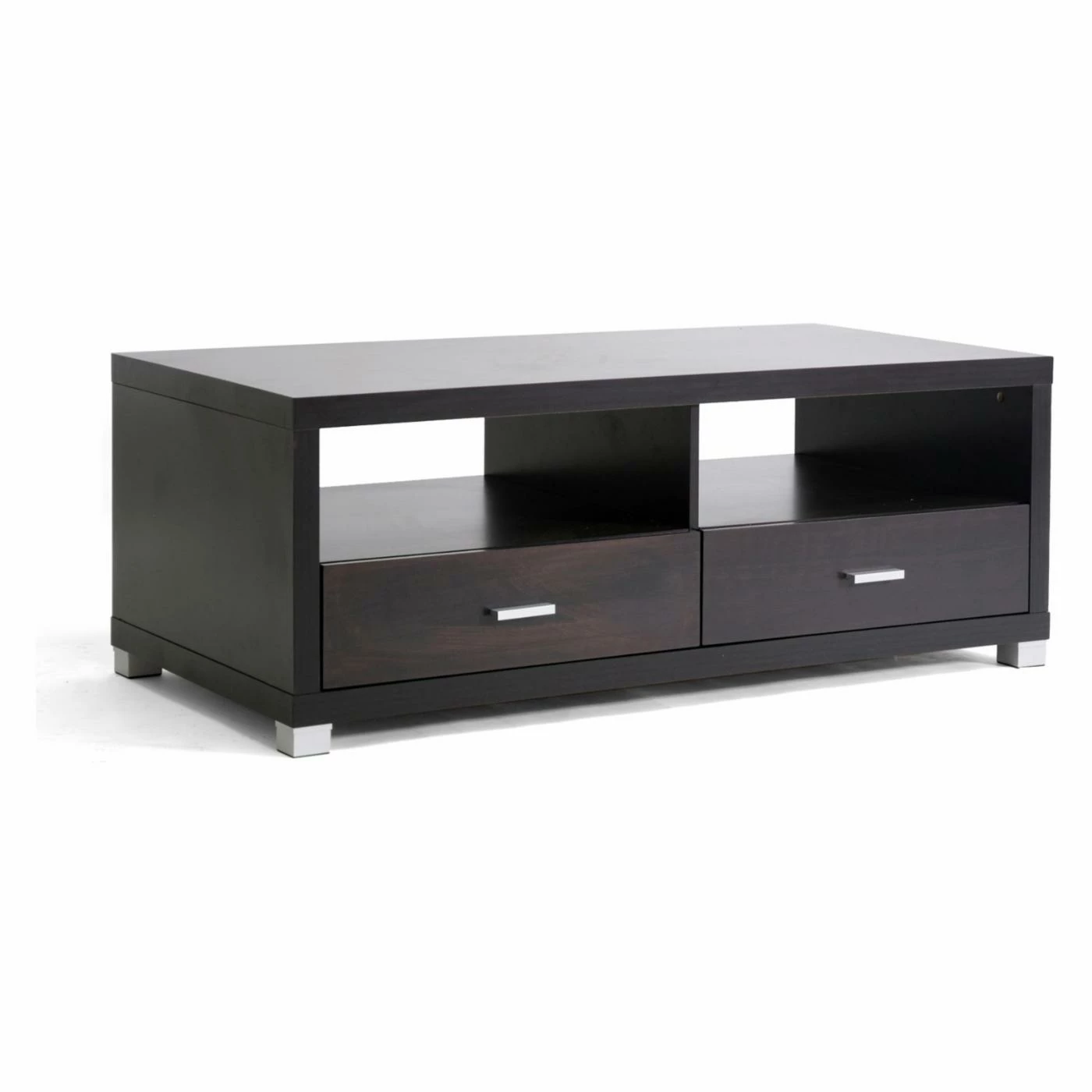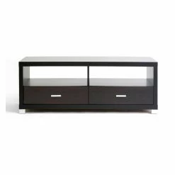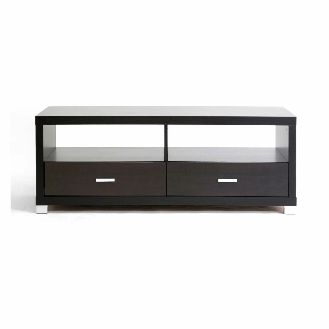 Setup your home theater system with ease on the Baxton Studio Derwent TV Stand. With its sleek clean lines, the television stand will look at home in any modern living space, and its dark brown paper veneers give the piece the look of authentic solid hardwood. An open back makes it easy to feed cords through the two open shelves, which are ideally sized for DVD players, cable boxes, and video game consoles. Two sliding drawers with chromed handles are positioned below and ready to store your remote controls, instruction guides, media, and more.