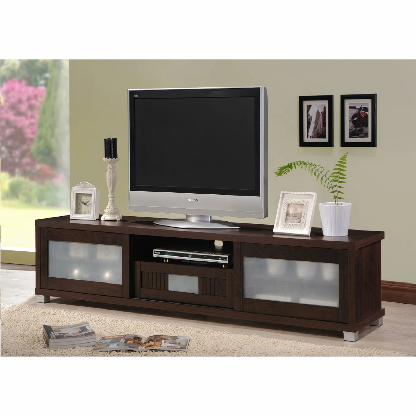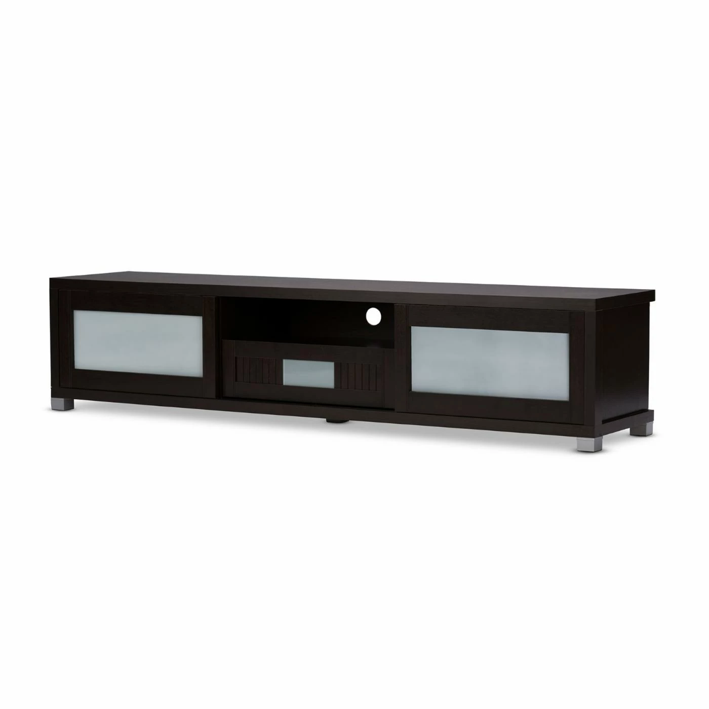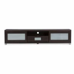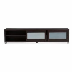 Maybe youβve got a movie-theater-sized TV screen, or maybe you just have a lot of media accessories to wrangle. Either way, the Baxton Studio Gerhardine 85 in. TV Cabinet – Espresso holds it all with sophisticated style that makes any space look chic. This beautiful TV cabinet is constructed of durable engineered wood and MDF and comes in a lovely rich espresso finish that warms up any space. It has five open shelves along the top, perfect for holding cable boxes, gaming consoles, sound systems, gaming systems, or to put your favorite decorative items on display. For those items youβd like to keep out of sight, tuck them away in the spacious slide-out drawer, which is outfitted with an elegant frosted glass feature on its front. Whether youβre a gamer, a TV lover, or a movie buff, youβll love the space, storage, and style this gorgeous cabinet adds to your home.