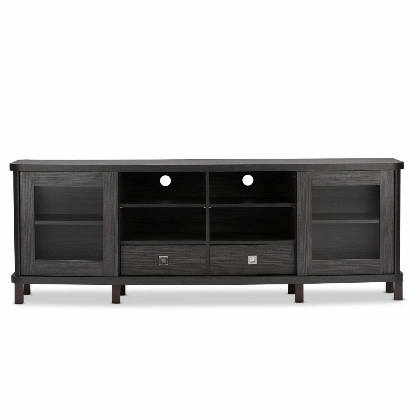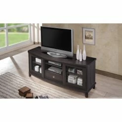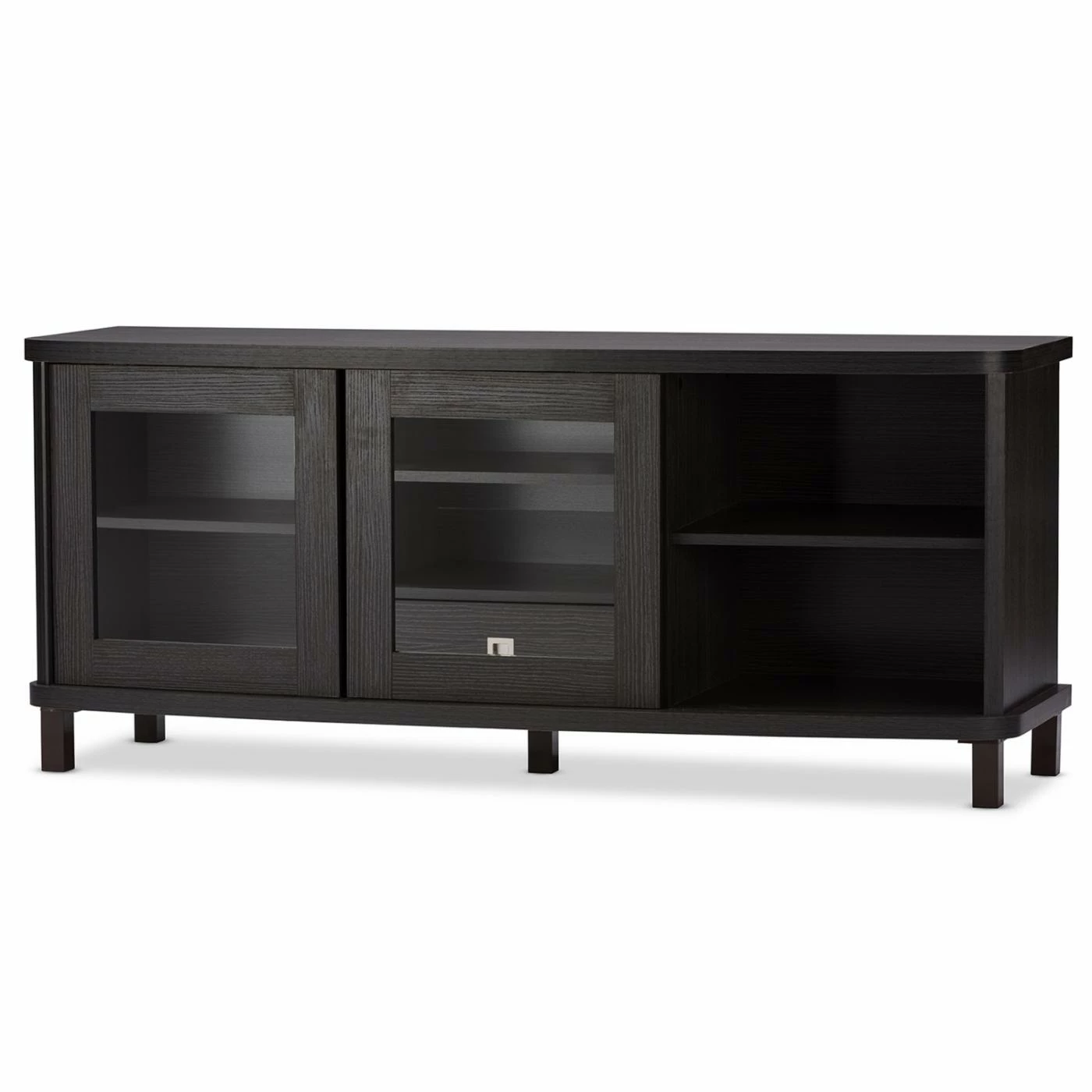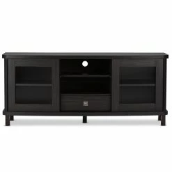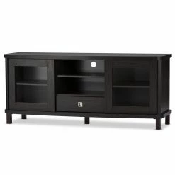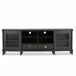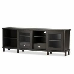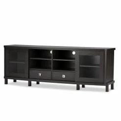 Classic styling with a touch of modern accenting makes the Baxton Studio Walda TV Cabinet a gorgeous addition to your living or media room. This beautiful TV cabinet is constructed of durable engineered wood and comes in a rich, grayish-dark brown finish that warms up any space. It’s truly the entertainment lover’s dream TV cabinet, offering plenty of space to store all your media components and accessories, and is available in two sizes. The 70-in. cabinet features four open shelves in the center, the perfect space for storing cable boxes, movie players, gaming consoles and more. There are two slide-out drawers underneath the open shelves, a handy spot to tuck away media clutter like extra cords and owner’s manuals. The cabinet also has two sliding glass doors with a shelf behind each, a great place for keeping movies, video games, books, or your favorite decorative items proudly on display. This stunning cabinet is the perfect blend of traditional style with a modern twist, and makes any room look that much more sophisticated.
