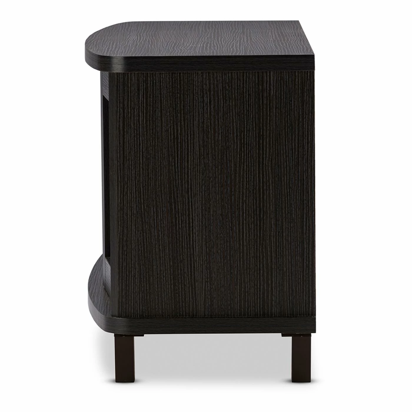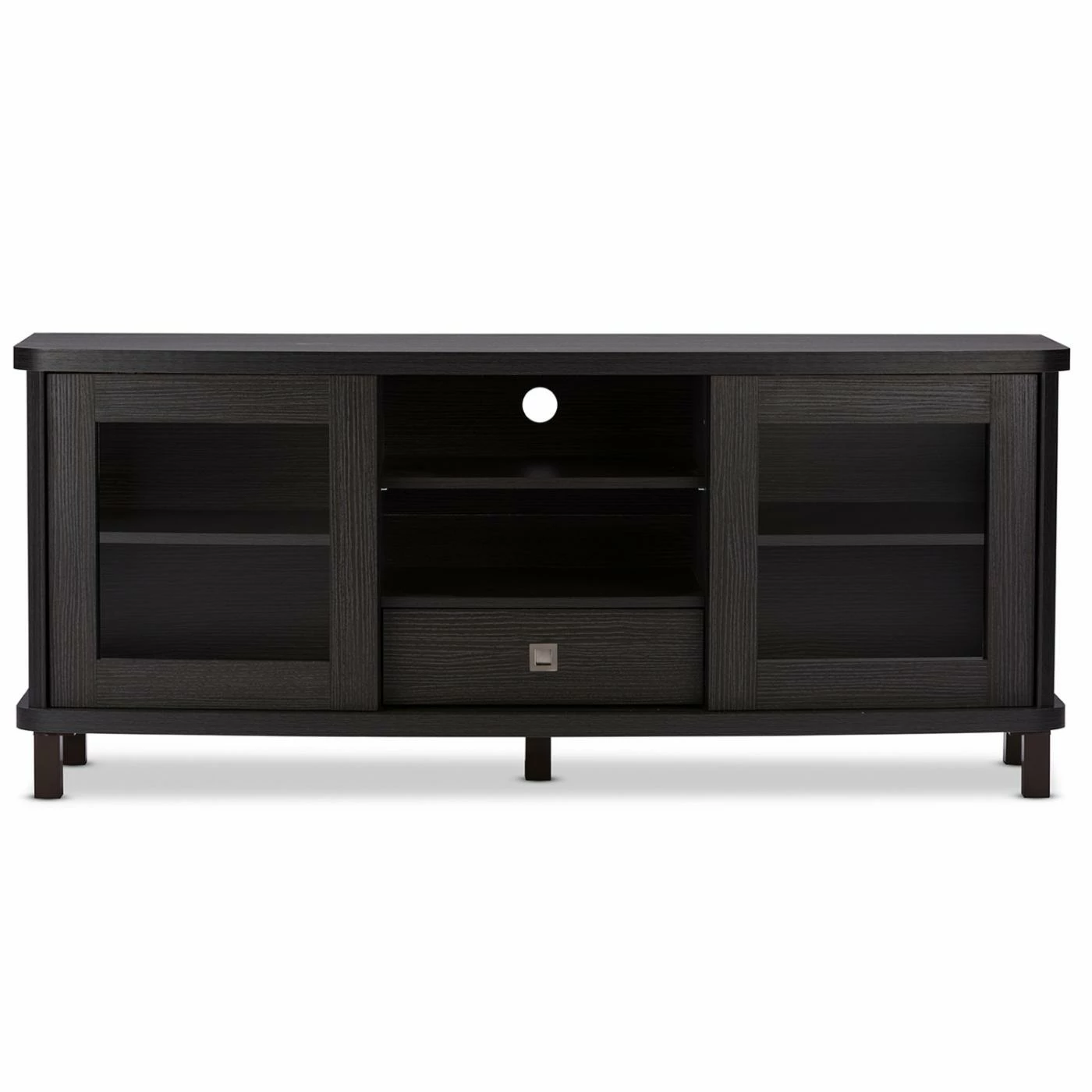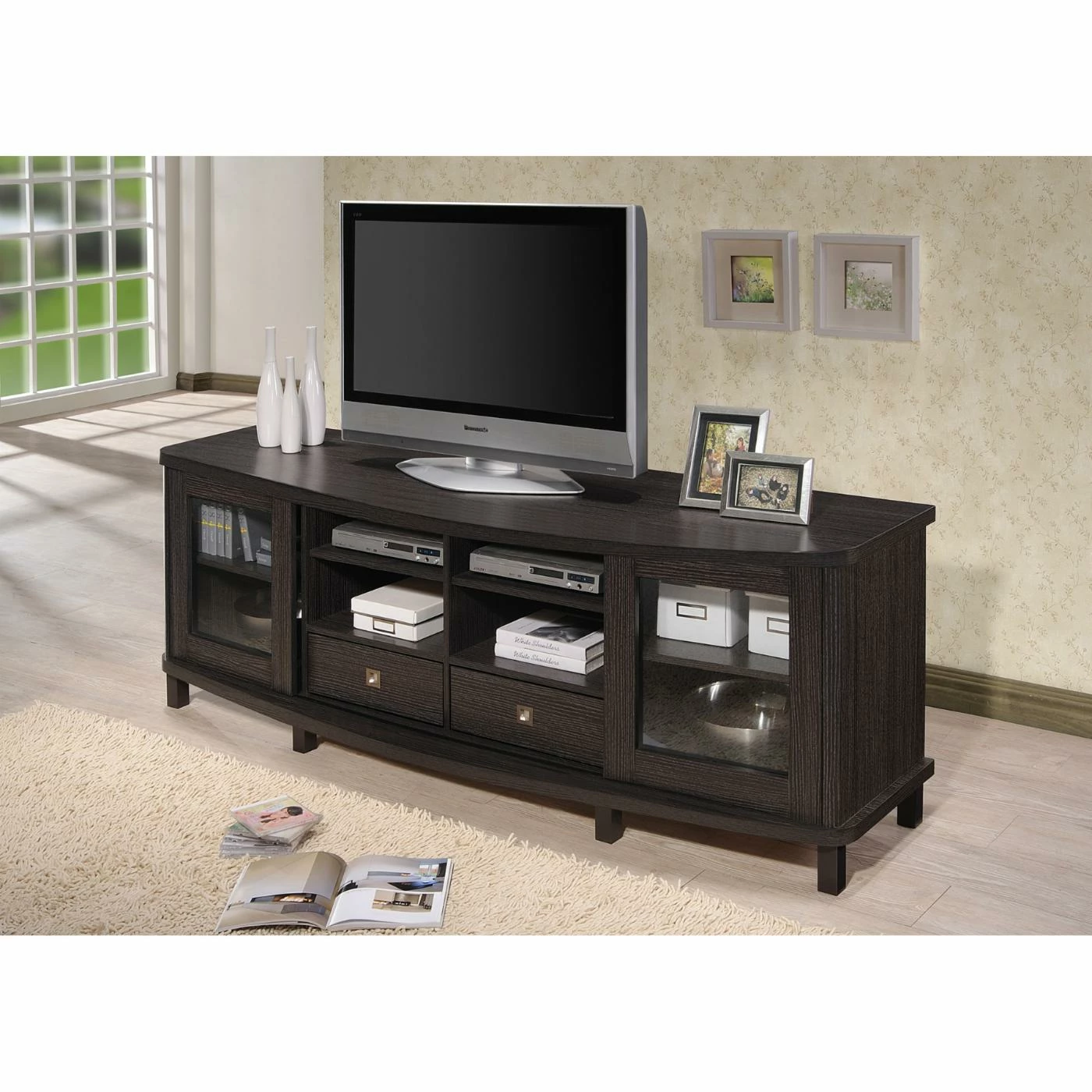 Classic styling with a touch of modern accenting makes the Baxton Studio Walda TV Cabinet a gorgeous addition to your living or media room. This beautiful TV cabinet is constructed of durable engineered wood and comes in a rich, grayish-dark brown finish that warms up any space. It’s truly the entertainment lover’s dream TV cabinet, offering plenty of space to store all your media components and accessories, and is available in two sizes. The 70-in. cabinet features four open shelves in the center, the perfect space for storing cable boxes, movie players, gaming consoles and more. There are two slide-out drawers underneath the open shelves, a handy spot to tuck away media clutter like extra cords and owner’s manuals. The cabinet also has two sliding glass doors with a shelf behind each, a great place for keeping movies, video games, books, or your favorite decorative items proudly on display. This stunning cabinet is the perfect blend of traditional style with a modern twist, and makes any room look that much more sophisticated.
