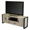 The 58-in. cabinet has the same construction and beautiful grayish dark-brown finish. It features two open shelves in the center, along with 1 slide-out drawer underneath. The cabinet also has one sliding glass door with a shelf behind.