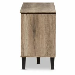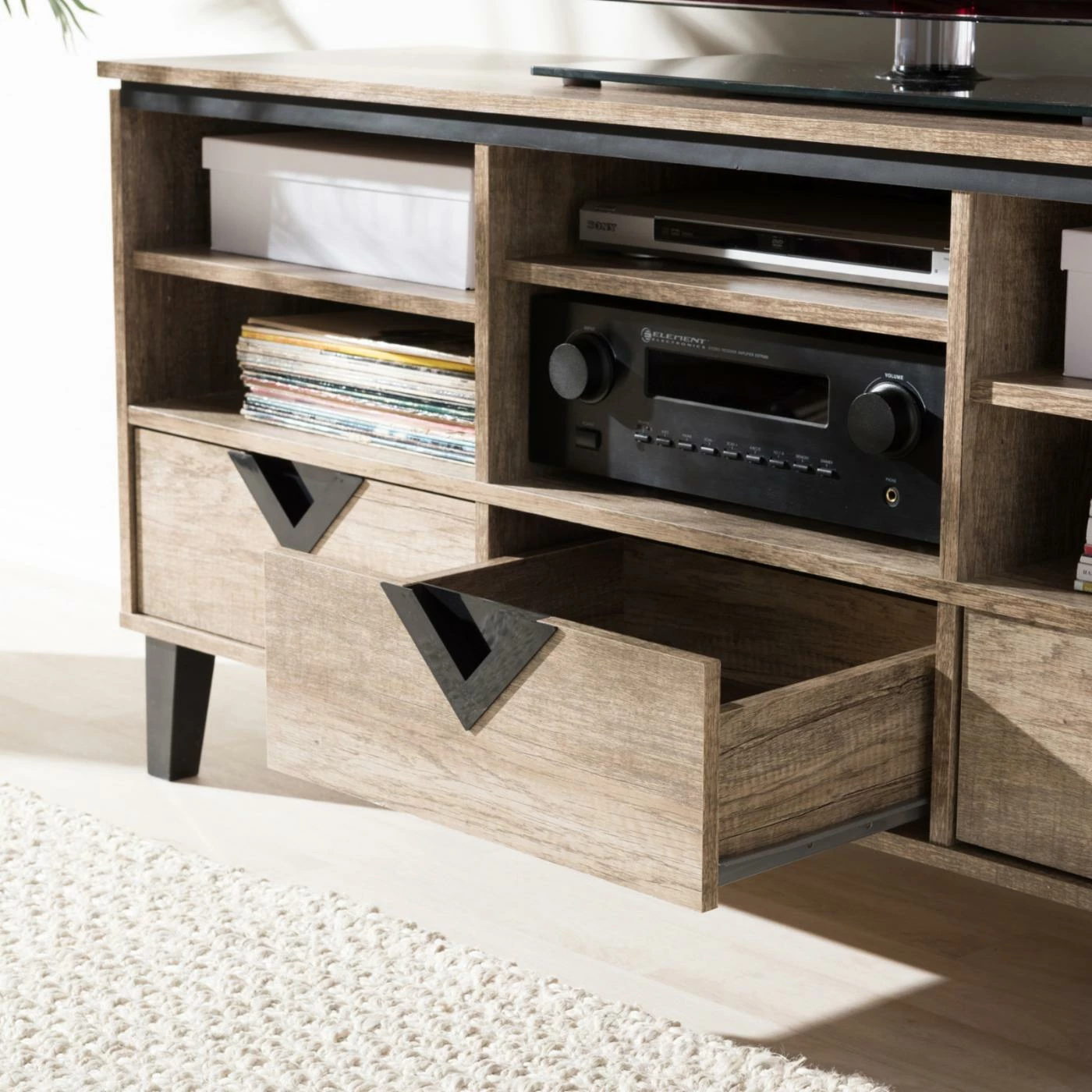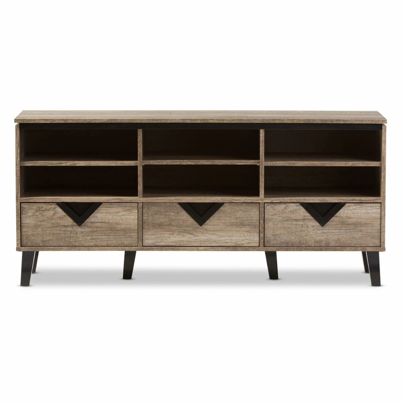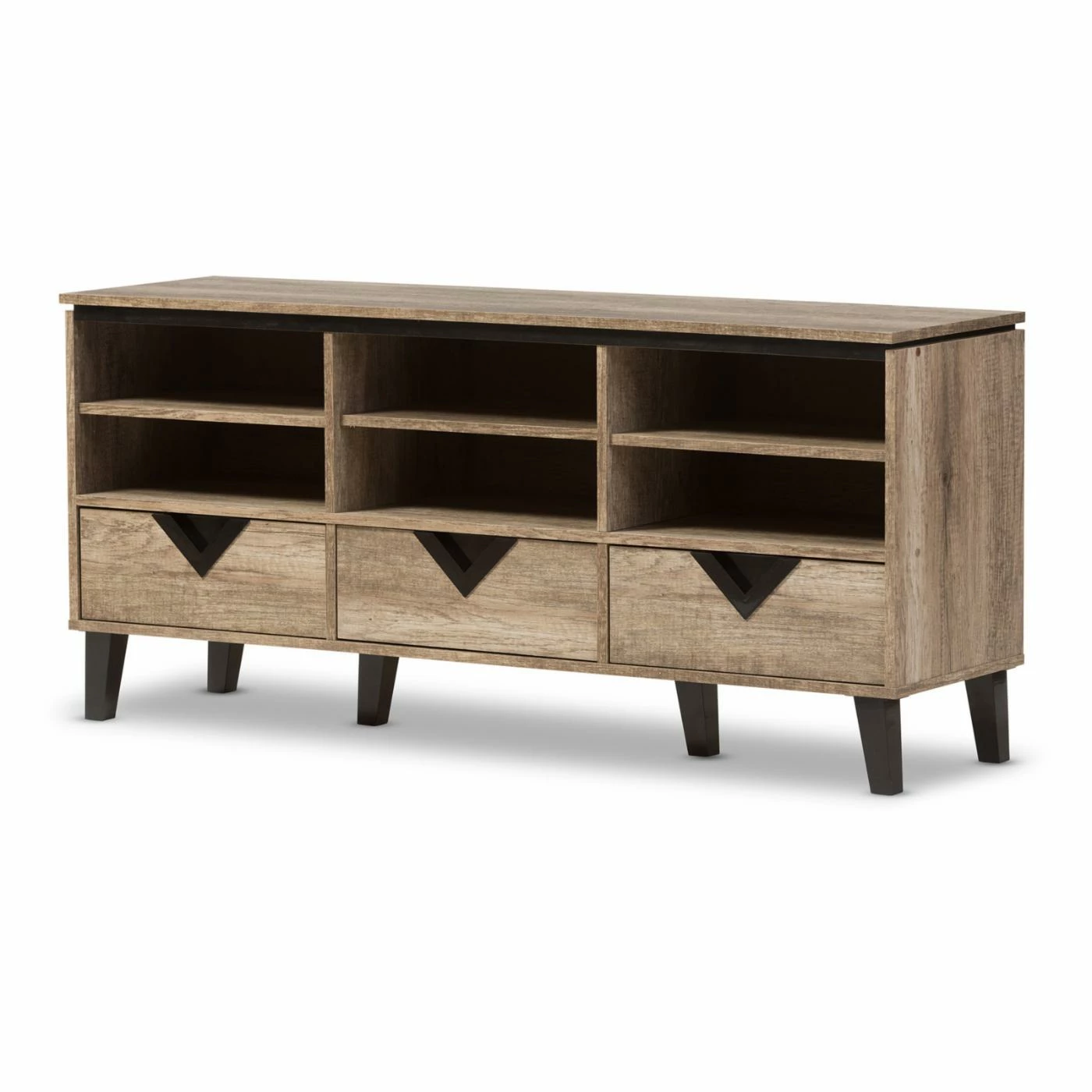 Give your viewing area a rustic, modern vibe with the distressed light brown finish of the Baxton Studio Wales TV Stand. With six storage compartments, the engineered wood television stand has plenty of space for your audio visual components. Wire management openings make setting up your home theater system simple, and the piece is stabilized by non-marking plastic feet. Three deep drawers with matching plastic handles can be used to stow your media, remote controls, and other essentials.