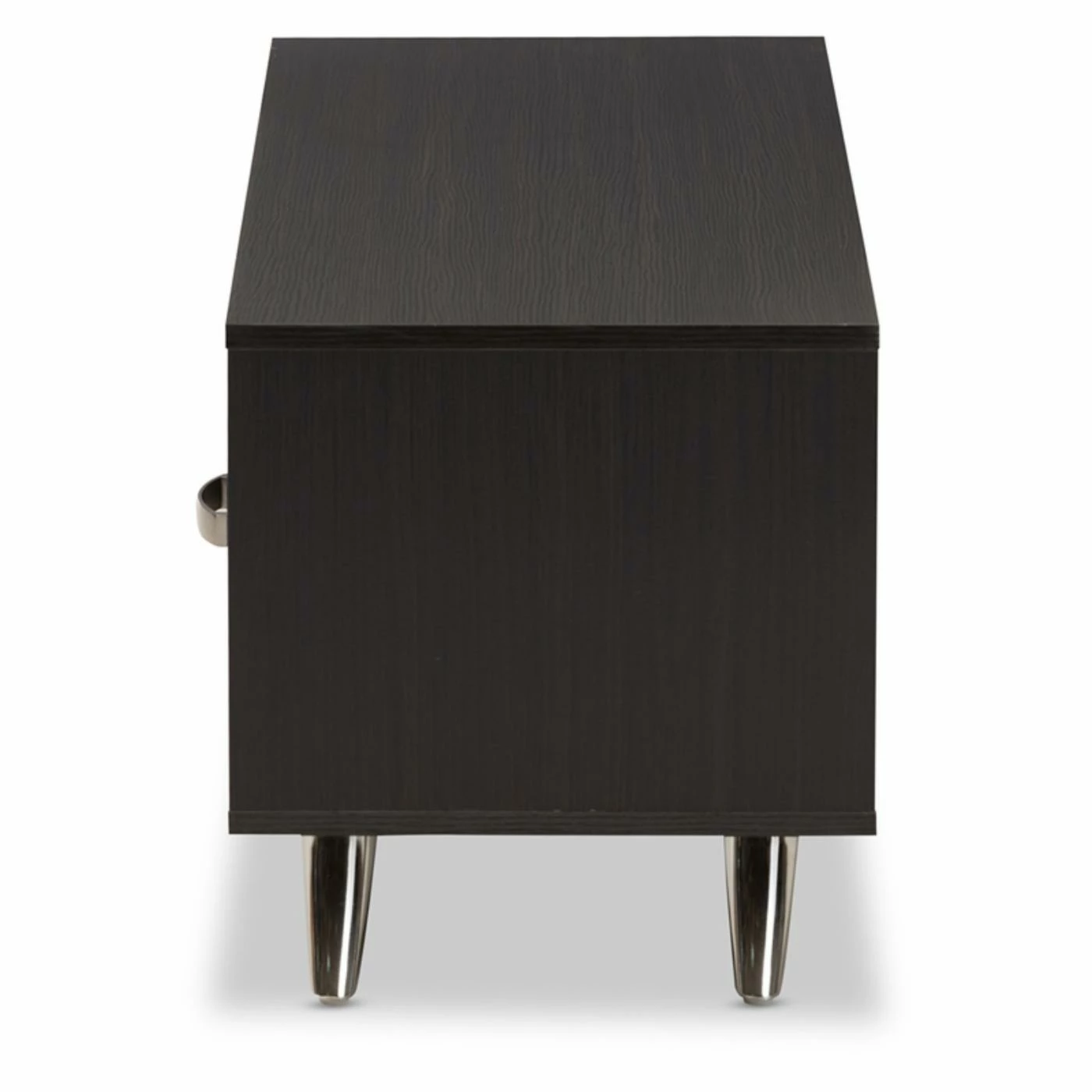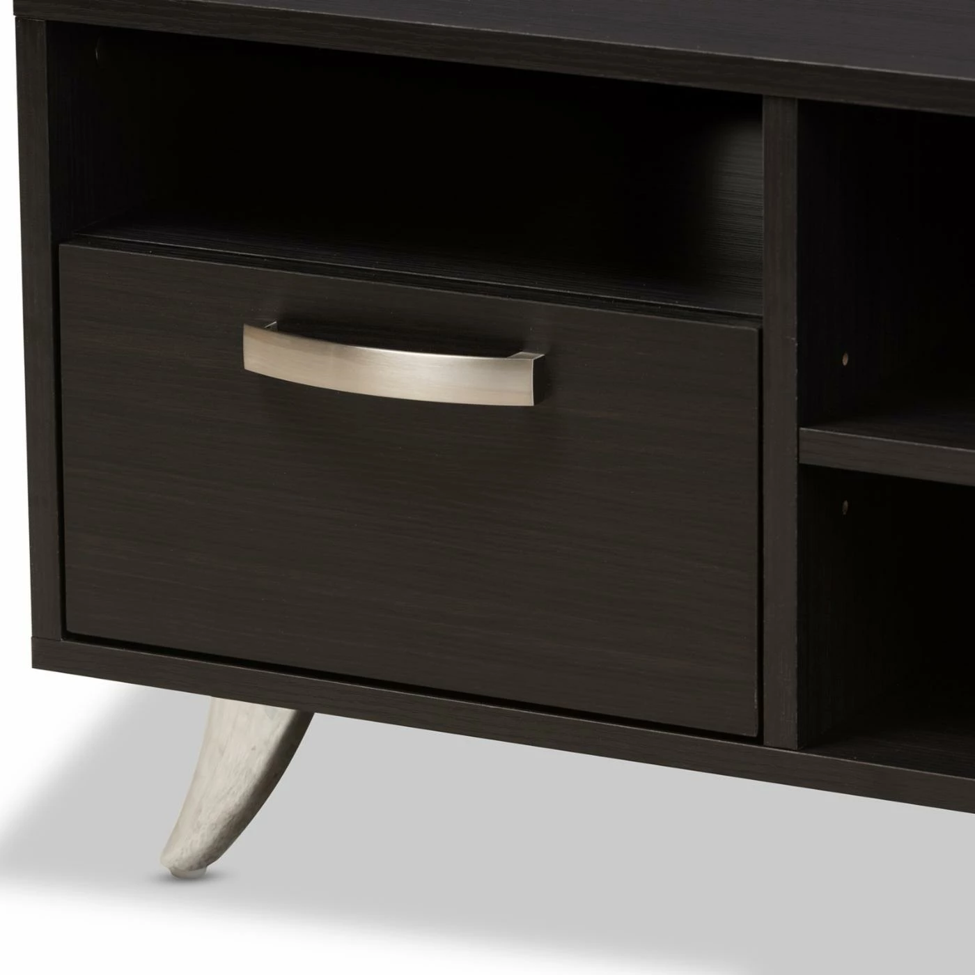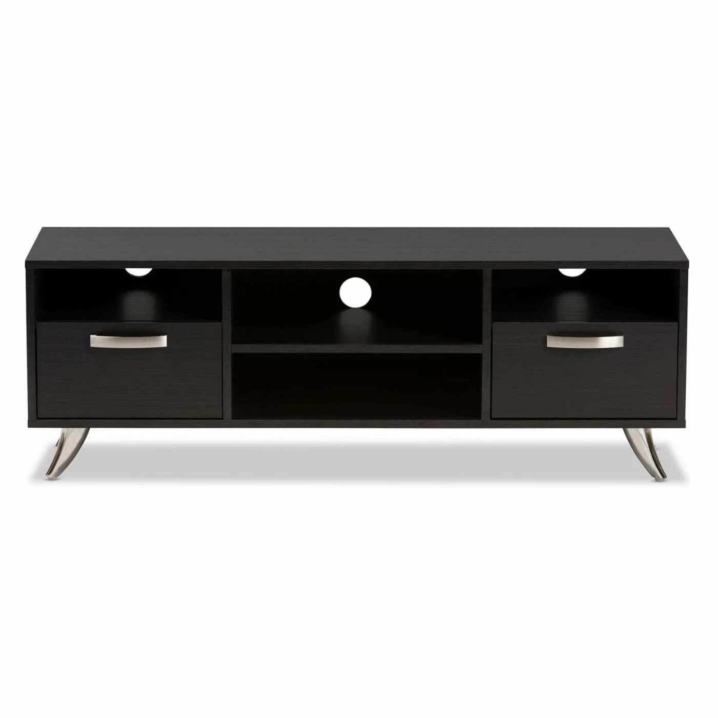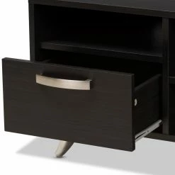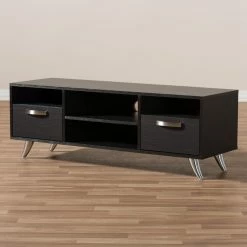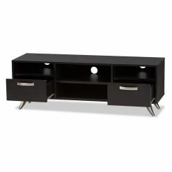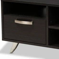 The Baxton Studio Warwick Modern and Contemporary Wood TV Stand – Espresso gives your space an updated, modern look while providing storage for your media. This TV stand holds TVs up to 47 inches wide. The engineered wood frame with laminate surfaces provides support for your TV, while the deep espresso finish and metal accents lend modern style. Two drawers and four open shelves give you all the storage you need.