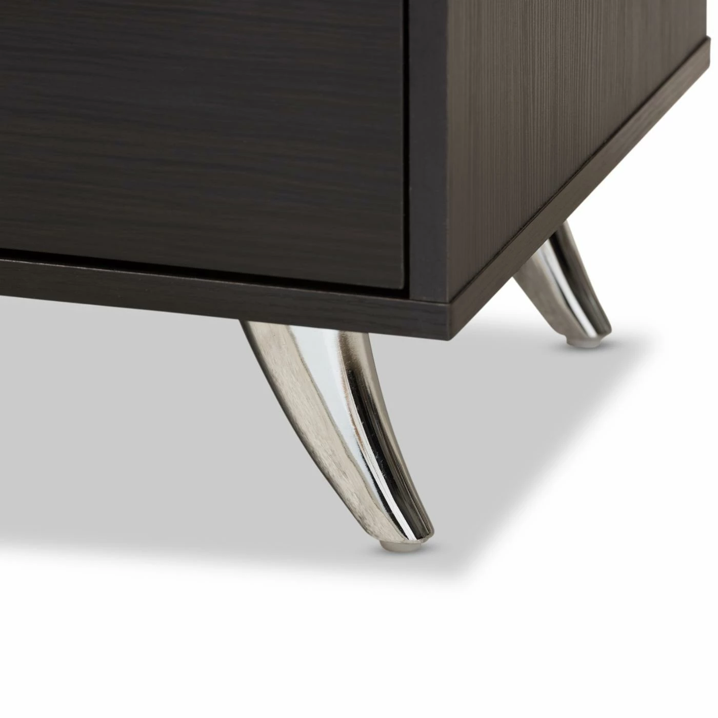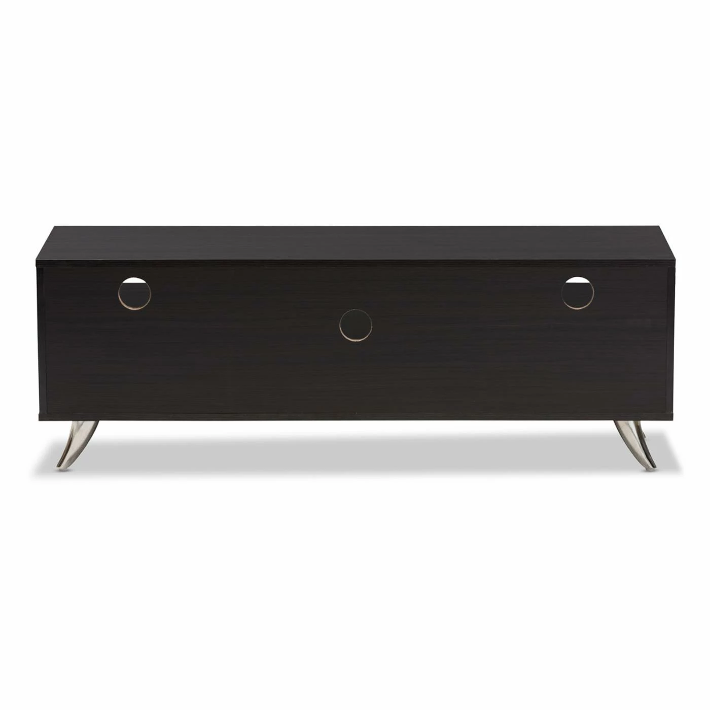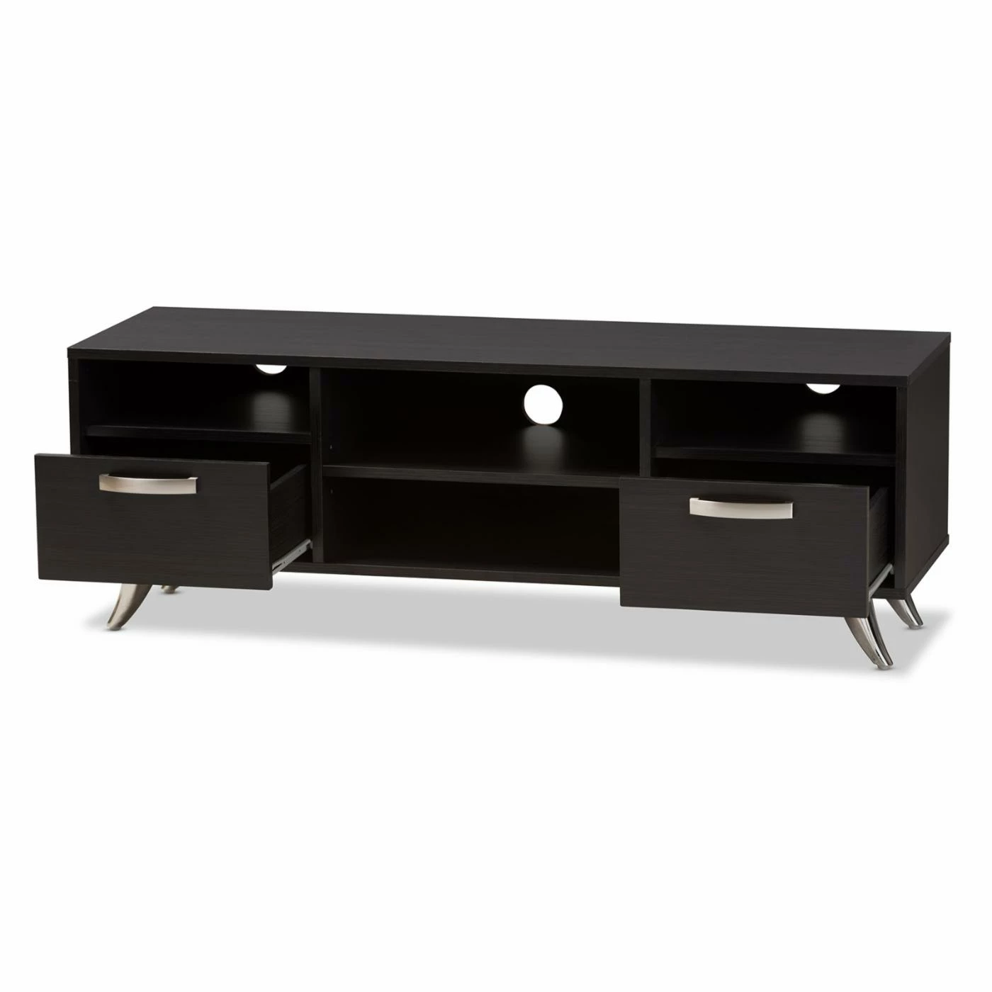 The Baxton Studio Warwick Modern and Contemporary Wood TV Stand – Espresso gives your space an updated, modern look while providing storage for your media. This TV stand holds TVs up to 47 inches wide. The engineered wood frame with laminate surfaces provides support for your TV, while the deep espresso finish and metal accents lend modern style. Two drawers and four open shelves give you all the storage you need.