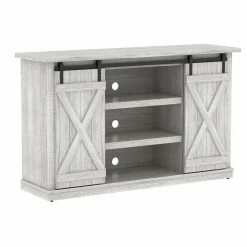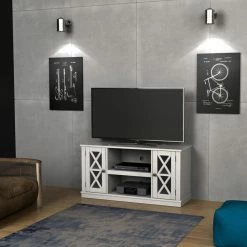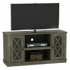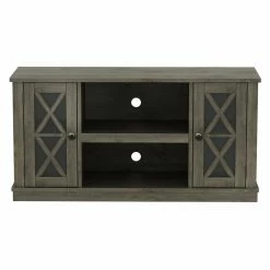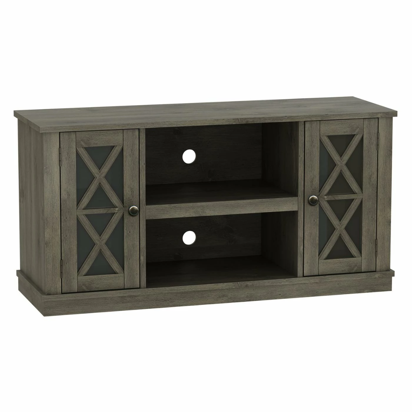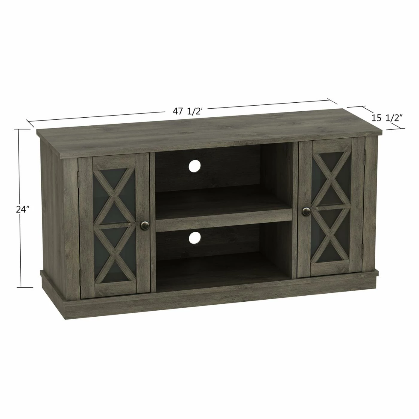 The BellO Bayport 47.5 in. TV Stand – Spanish Gray updates your living room dΓ©cor and adds valuable storage and display space. Made solid wood and veneers, this sturdy stand features two open shelves and two X-patterned glass cabinets to store all your media equipment. It can easily hold most TVs up to 55 inches wide and comes with all the necessary hardware for quick and easy set-up.