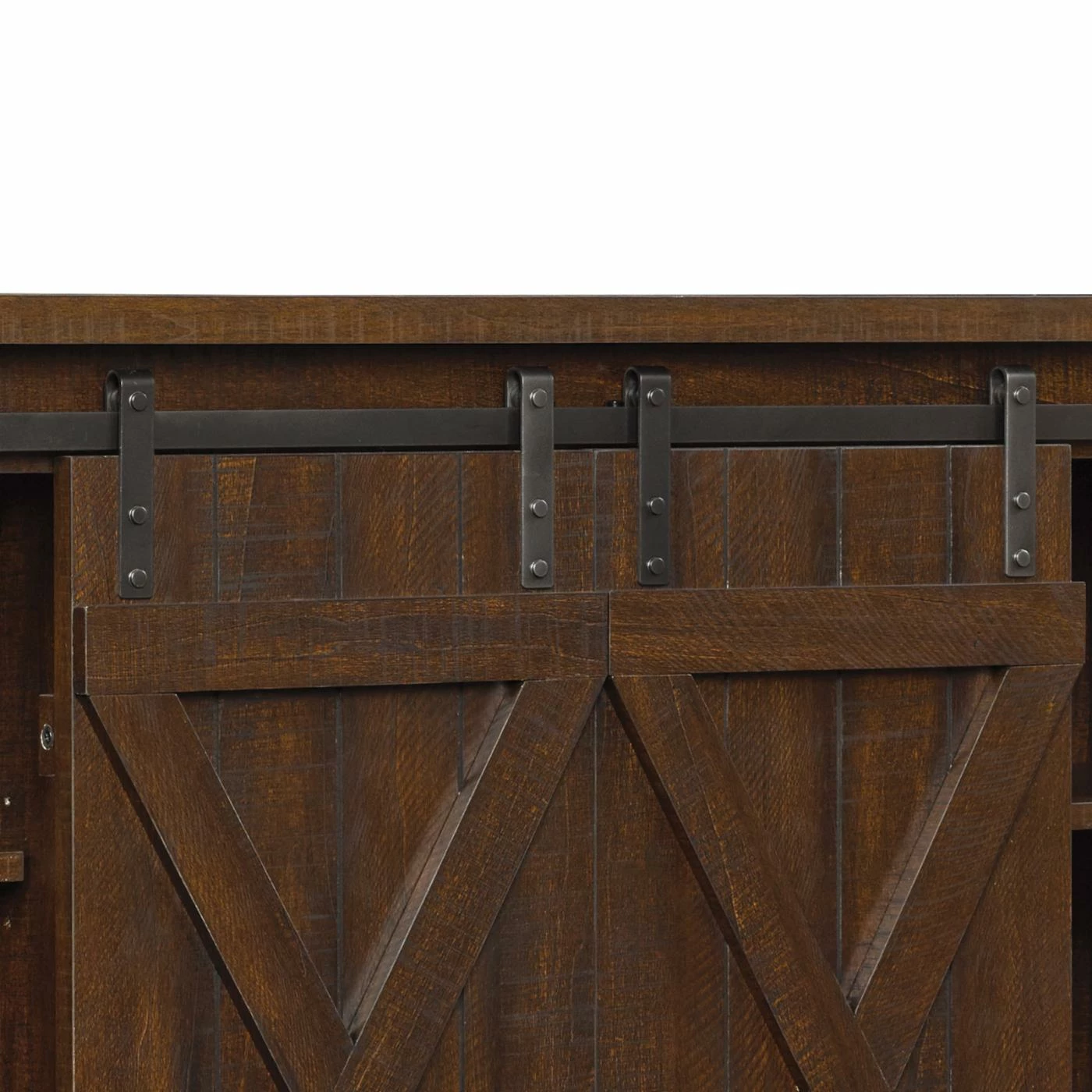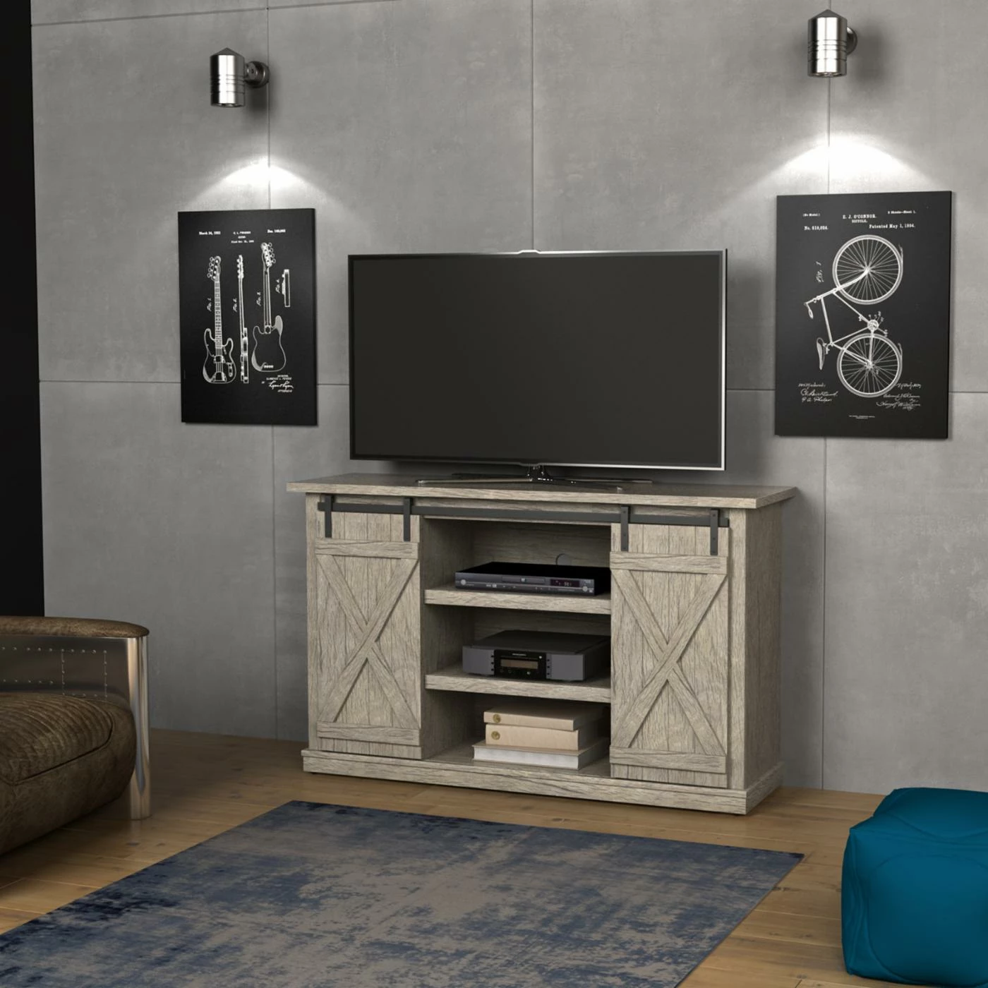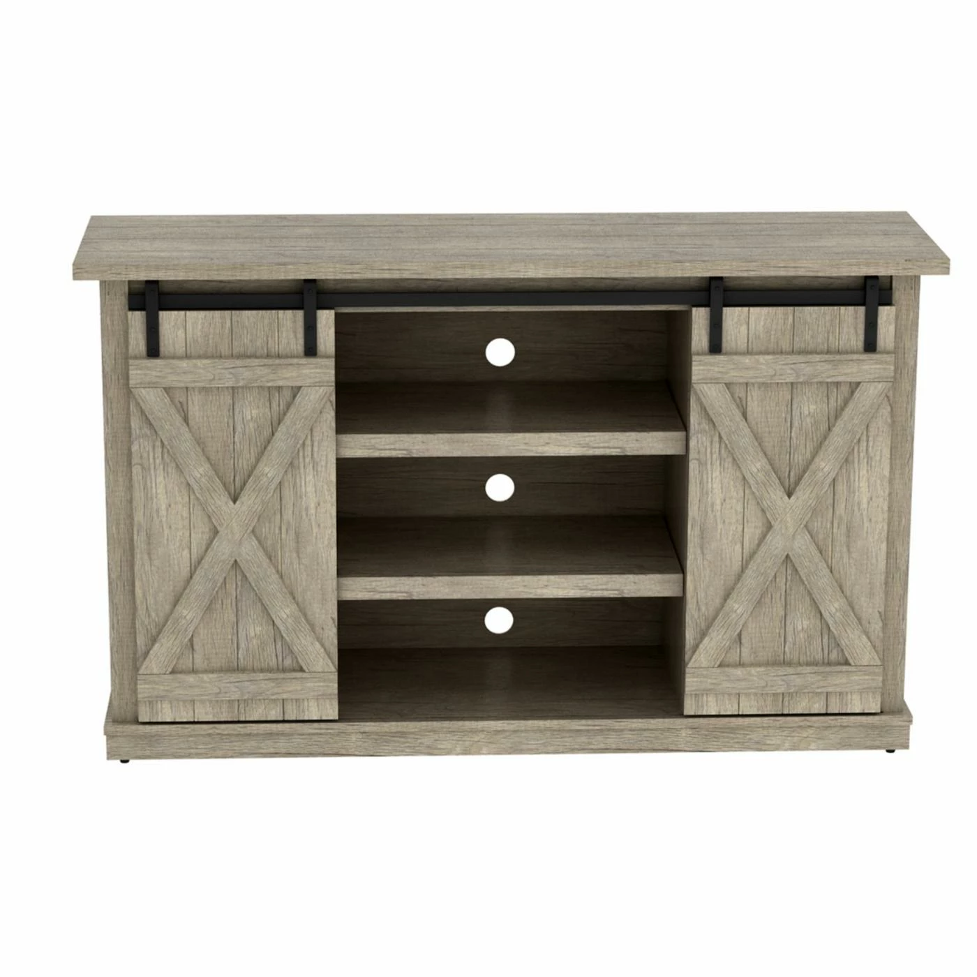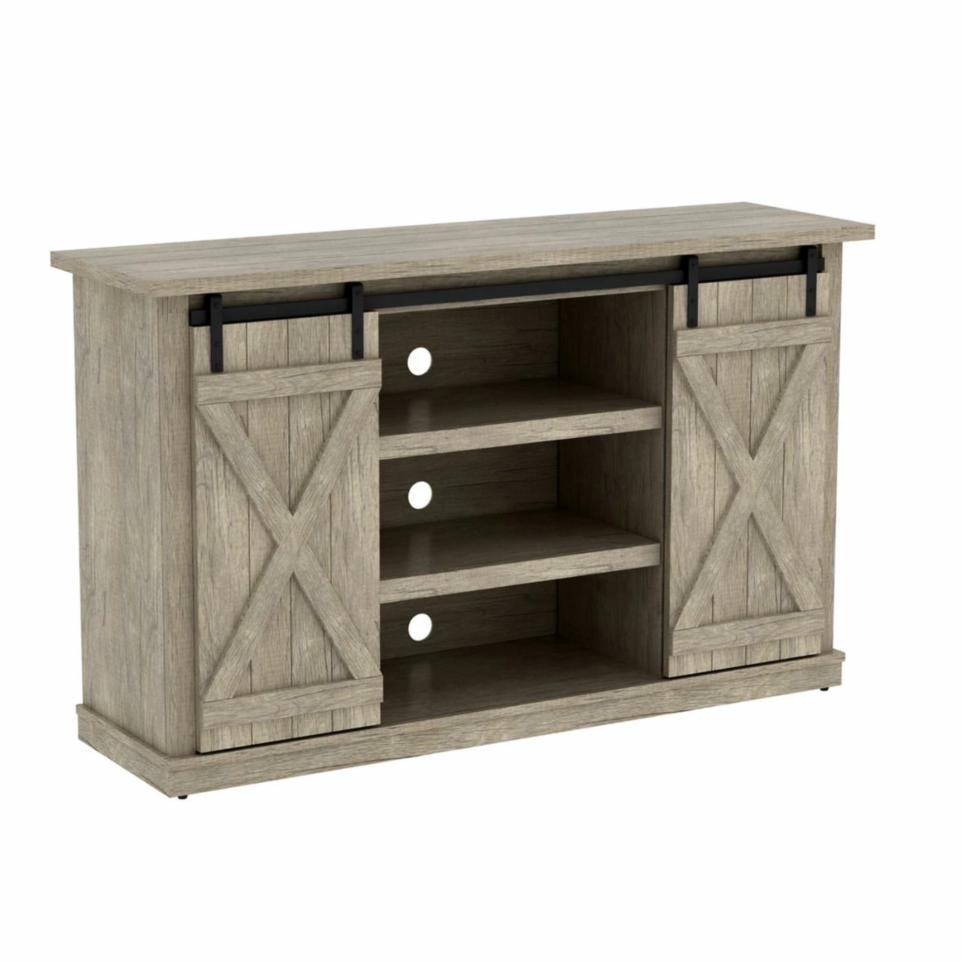 Entertain in style with the BellO Cottonwood 54 in. TV Stand. Finished with barn-style sliding doors and pewter hardware, this TV stand adds rustic beauty to your home. It has three adjustable shelves to accommodate gaming consoles, DVDs and more. The integrated cable management system hides unsightly cables and wires. It easily holds TVs up to 60 inches wide and comes with all the necessary hardware for easy assembly.