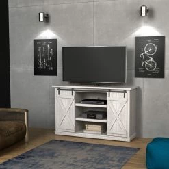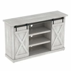 Tune the look of your entertainment area to farmhouse chic with the BellO Cottonwood Two-Tone TV Stand 60 in.. This inclusive stand features a plank top for displaying your TV, and plenty of open and concealed storage. The center section includes two adjustable shelves and integrated cable management for storing your cable box, DVD player, gaming console, and speakers. On each side of the stand, you’ll find a charming barn-style sliding door. Glide each sliding door to conceal or access the two adjustable shelves on either side, which are perfect for stowing your books, manuals, games, DVDS, remotes, and more. Sharp black hardware stylishly accents this stand, and an included touch-up pen will keep it looking new. Choose from available finish options to best suit your space.