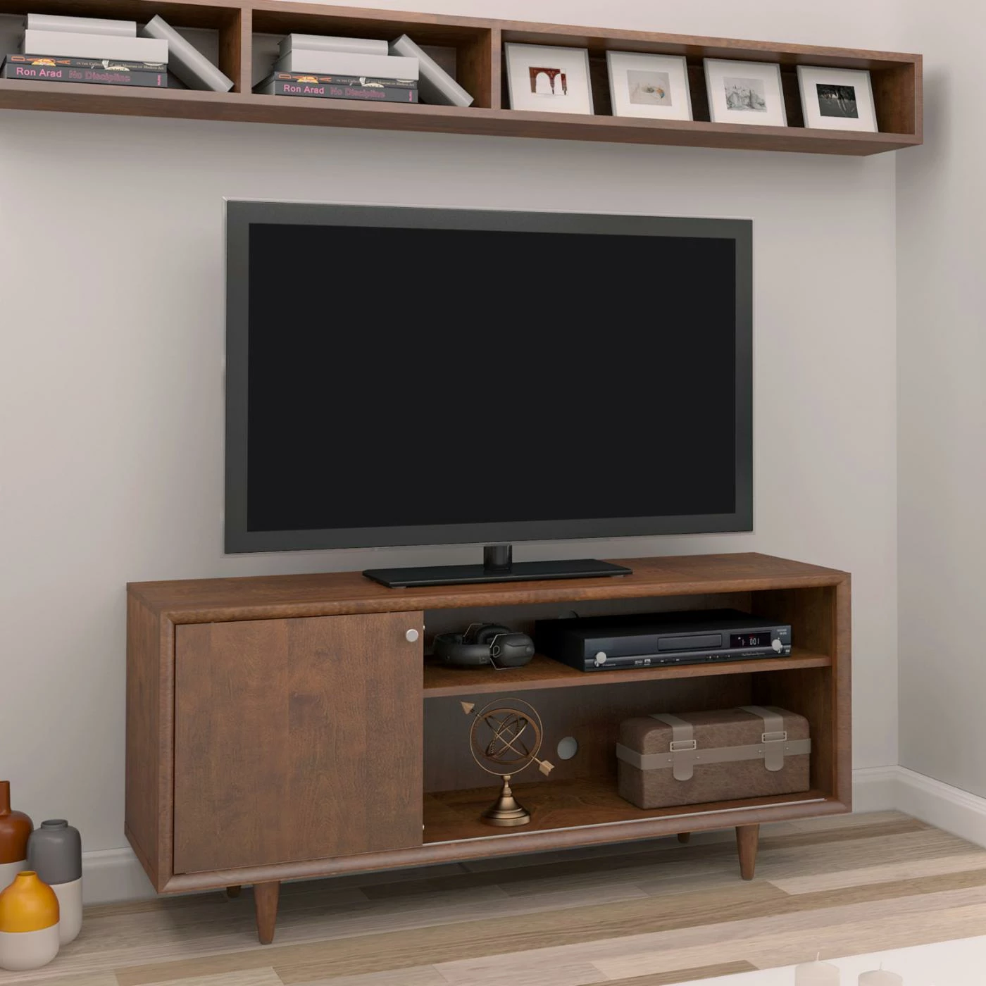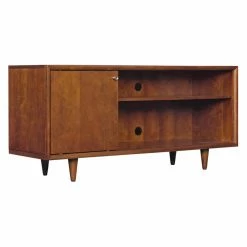 Featuring a rich cherry finish and tapered legs, the BellO Fairgrove 54 in. TV Stand – Mahogany Cherry adds mid-century flair to your living space. It boasts two open shelves and a side cabinet with an adjustable shelf to store all your media accessories. It also features an integrated cable management system that conveniently hides cables and wires from view. It comes with all the necessary hardware for easy assembly.