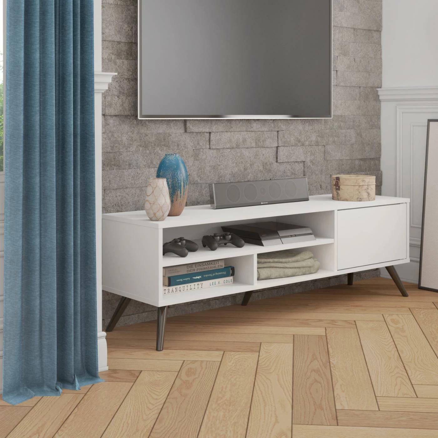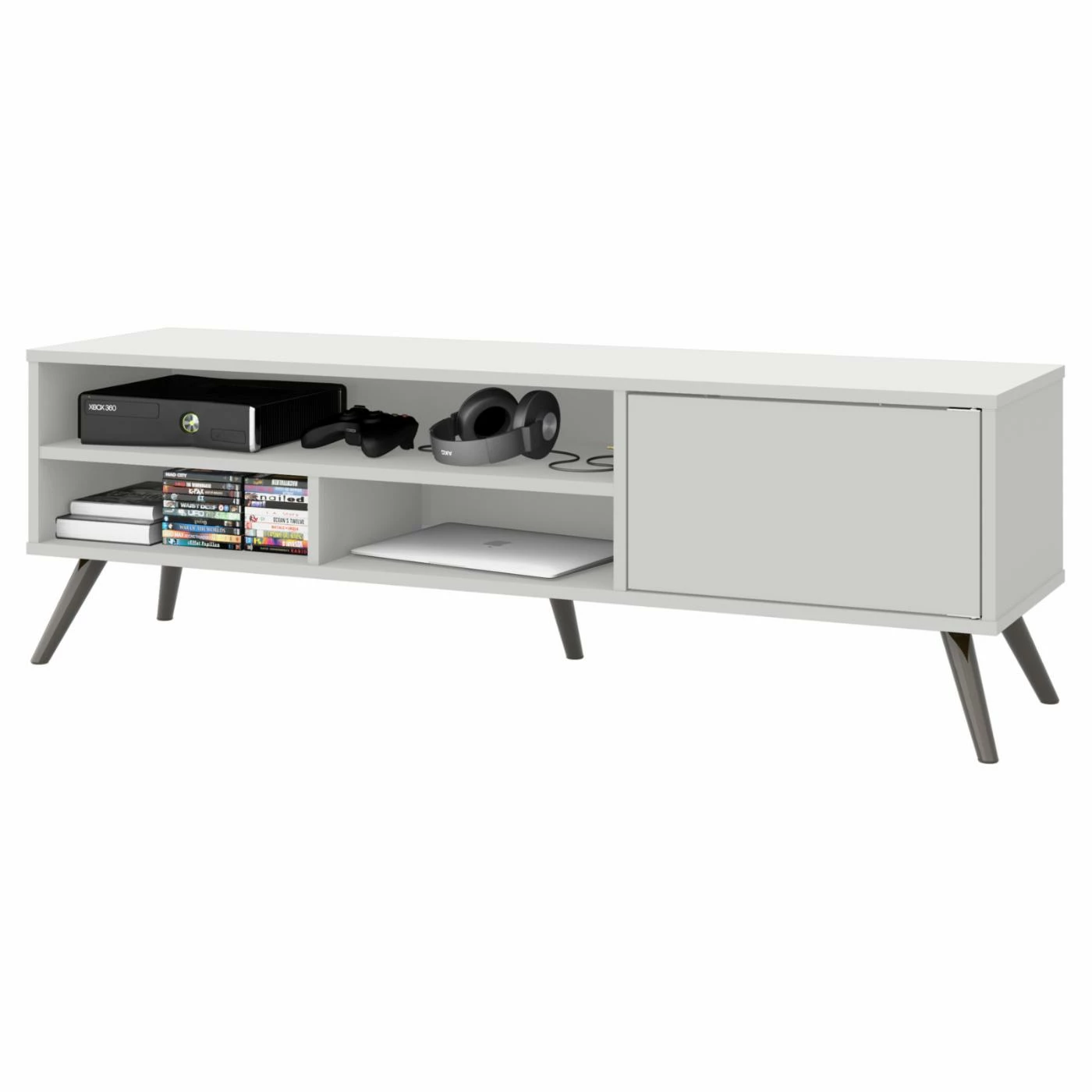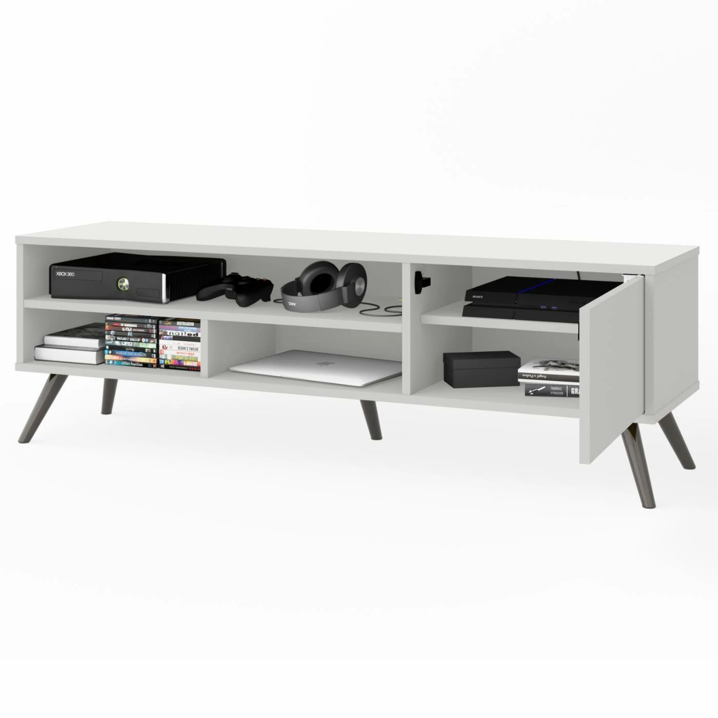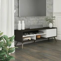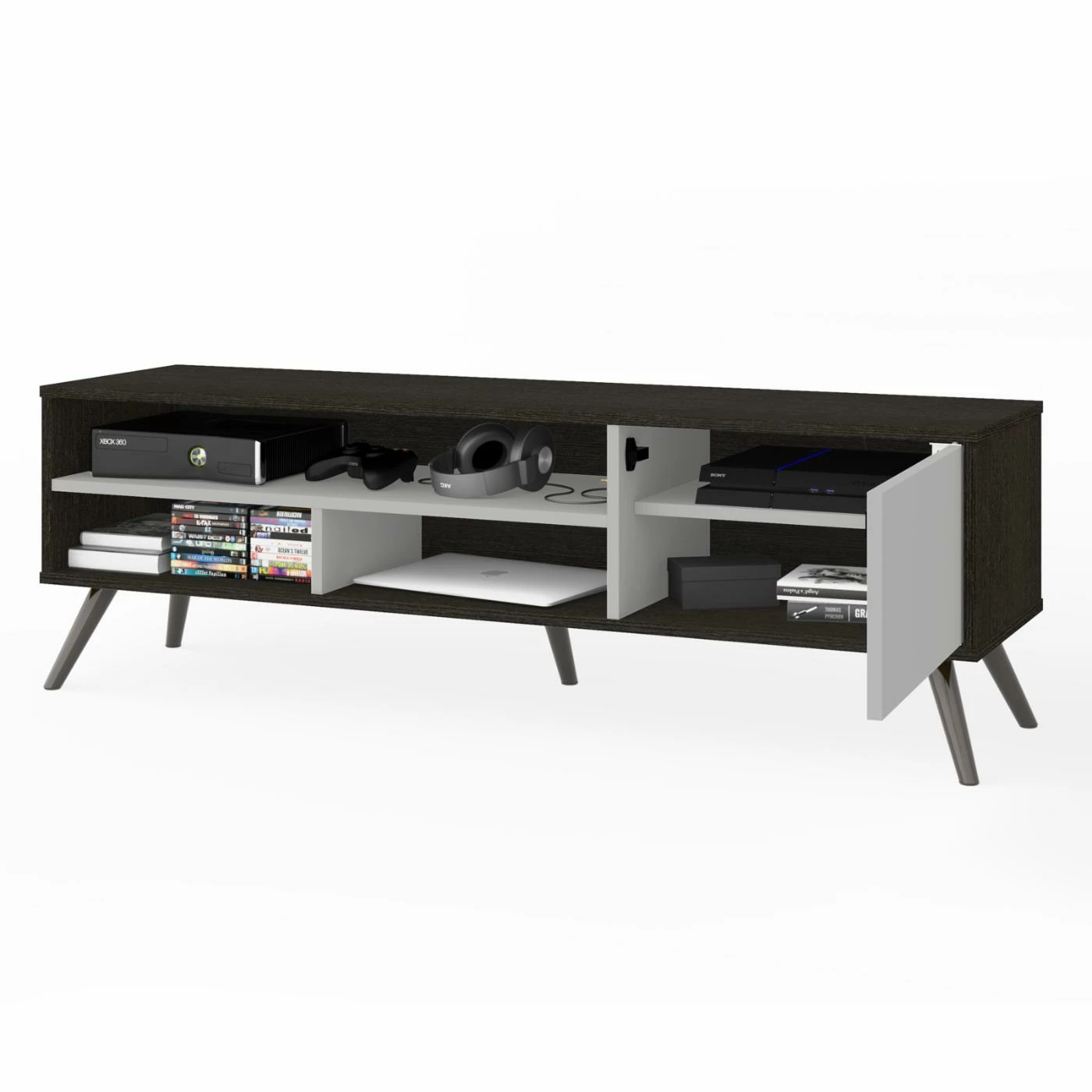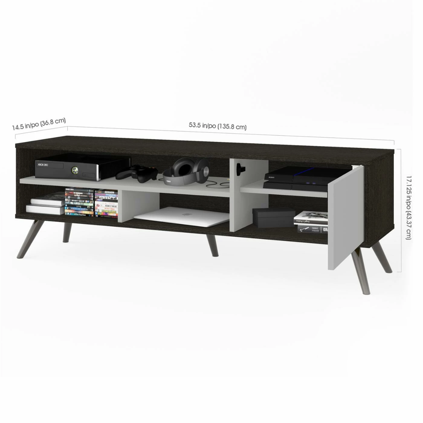 Complete your living room makeover with the Bestar Small Space Krom 53.5 in. TV Stand. Great for adding storage space and style to your home, this TV stand boasts a modern design thatβs accented by the angled metal legs with a black chrome-plated finish. Three open shelves offer plenty of space for your media devices, gaming consoles, DVDs, and more. A single cabinet with an adjustable shelf and two grommets for easy wire management completes the design. Built from durable engineered wood with a melamine surface, you wonβt have to worry about this TV stand becoming scratched, stained, or burned. Select from the available finishes to find the perfect look for your home.