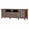 The Butler Specialty Drayton Entertainment Stand offers a mid-century modern centerpiece for your living space. This TV console is durably constructed from engineered wood and mango solids. The walnut brown finished features distressed accents around the edges and corners. One storage cabinet and two drawers have cutout handles for easy opening and closing. One fixed, open shelf offers space for display. The cord management cutout in the back panel helps to keep the stand clean and organized.