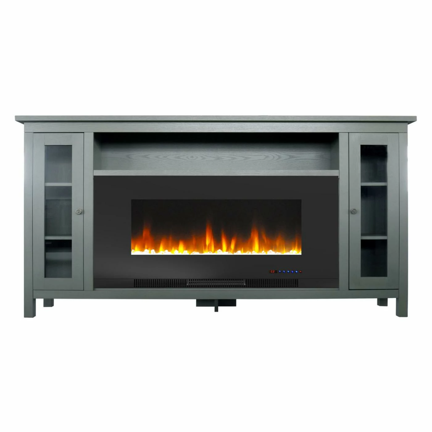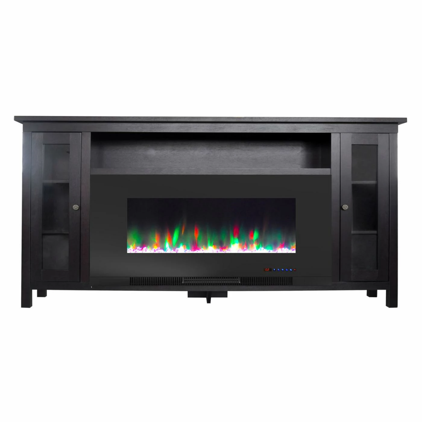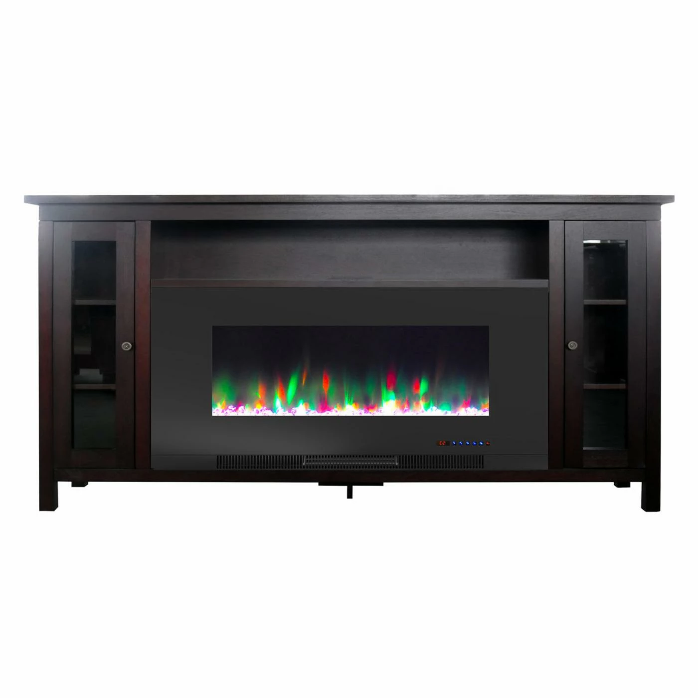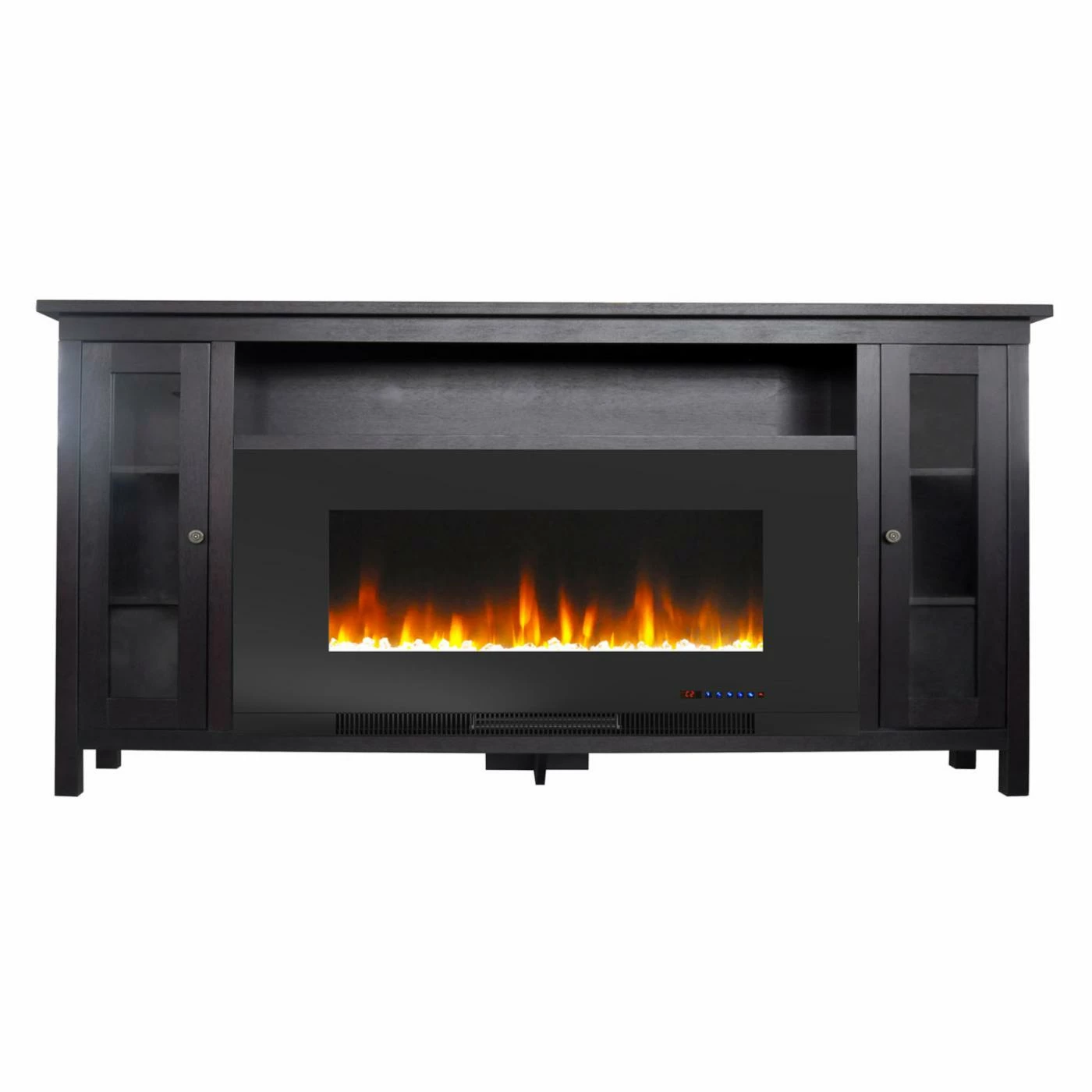 Warm up by the cozy fire and watch your favorite shows with the Cambridge Somerset 70 in. Electric Fireplace TV Stand. This stand features two vertical cabinets with two shelves each for plentiful storage. A wide media shelf stretches over a built-in LED fireplace display equipped with ten adjustable hues for completely customizable ambience. Use the included remote control to heat up your hearth, or choose to switch over to flame-only mode during the warmer months. Organize your favorite home media accessories in this modern TV stand and fireplace.