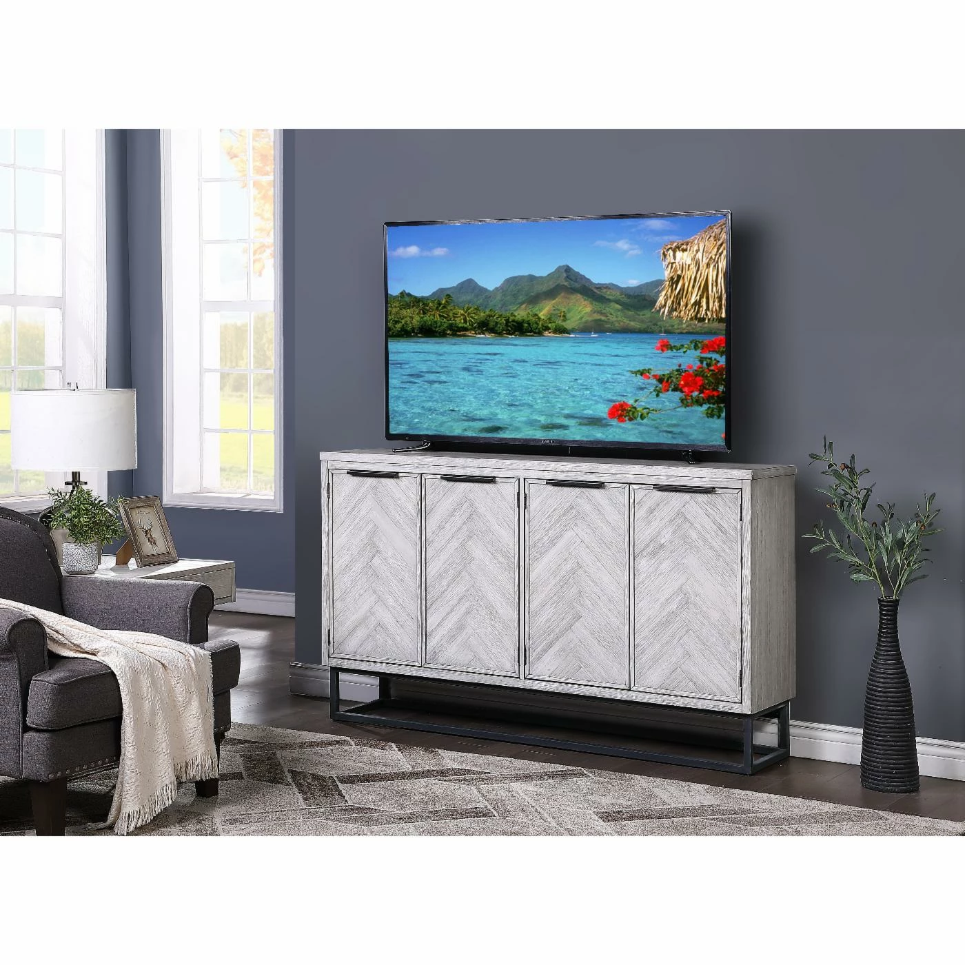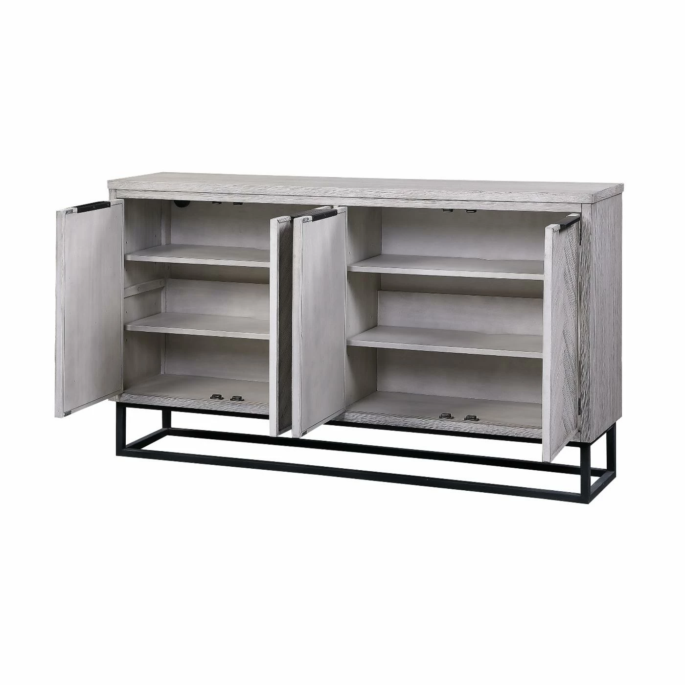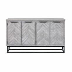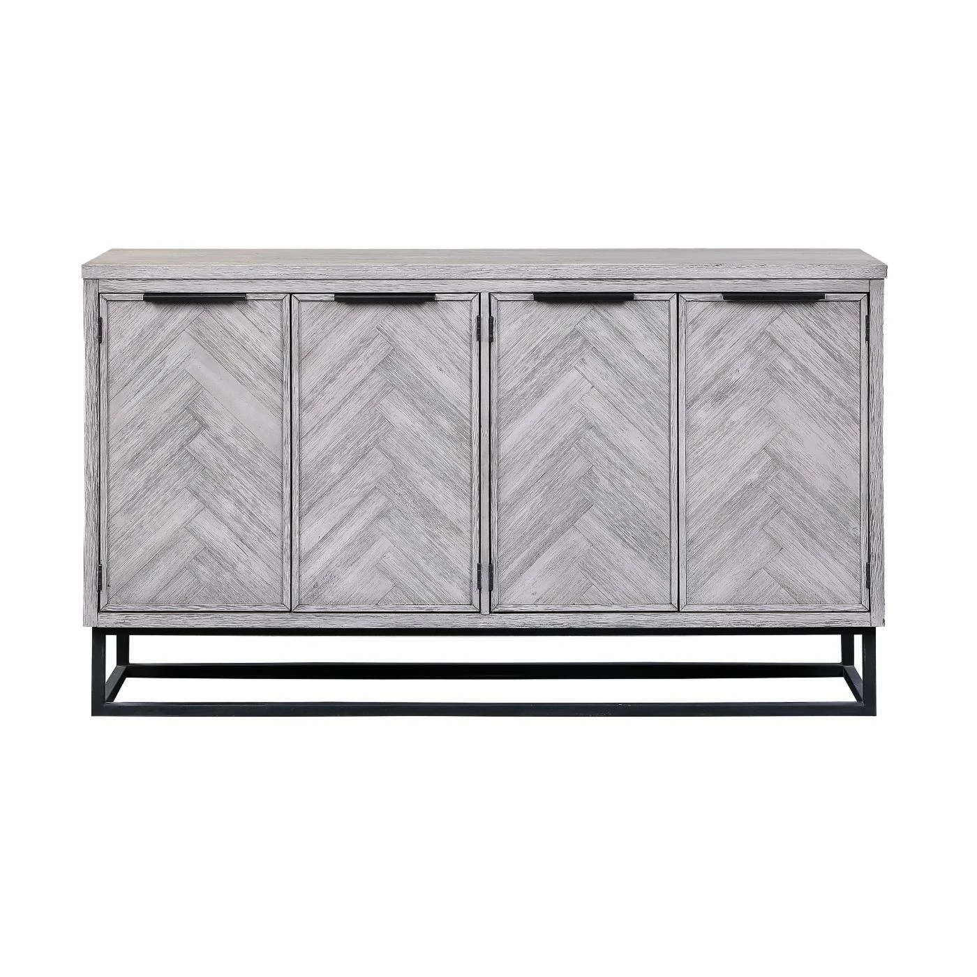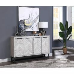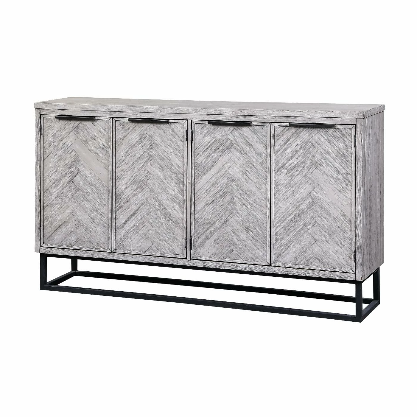 The smooth straight lines of the body beautifully frame the exquisite chevron patterns of the four door fronts on the Coast to Coast Aspen Court II 4 Door Media Credenza. Finished in our pale herringbone white rub, the tone-on-tone design is outstanding, and enhanced by the simplicity of the dark open metal framing of the base and linear hardware. With a spacious shelved interior and a large surface area for display, this beautiful Credenza is sure to be a favorite for years to come.