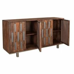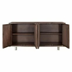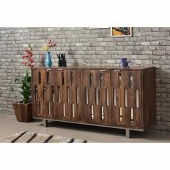 The Coast to Coast Brownstone 4 Door Credenza knows just how to mix materials and textures, and it’s going to give you a master class right in your own home. This credenza has definite Mid-Century influences, with a long, angular body and a focus on natural materials. The body of the cabinet is made from sheesham hardwood with a Brownstone nut brown finish that brings out the grain of the hardwood. Inset in the face of each door is a series of mirrored panels. This simple addition adds light and depth to your space. Discrete handles allow you to open the door to access the fully finished interior that’s divided by a fixed shelf. A simple base of powder-coated metal supports the body of the cabinet without detracting from the design.