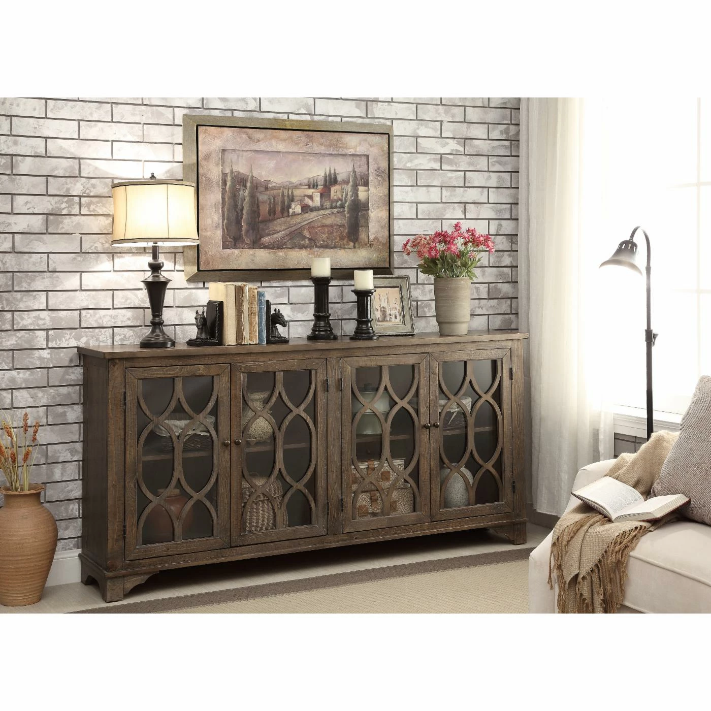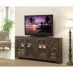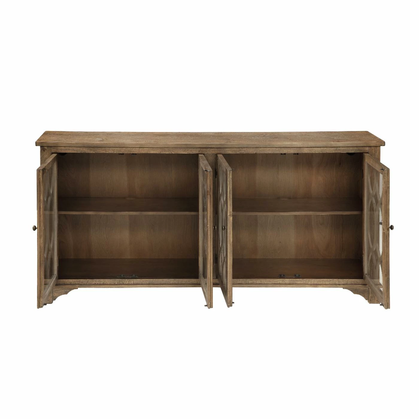Add stylish storage space to your dining room, kitchen, or living room with the Coast to Coast Cayhill Brown 4 Door Media Credenza. This media credenza features four glass-front doors overlaid with a decorative fretwork. The interior shelving and cord management system is perfect for displaying collectibles and books or electronic equipment.