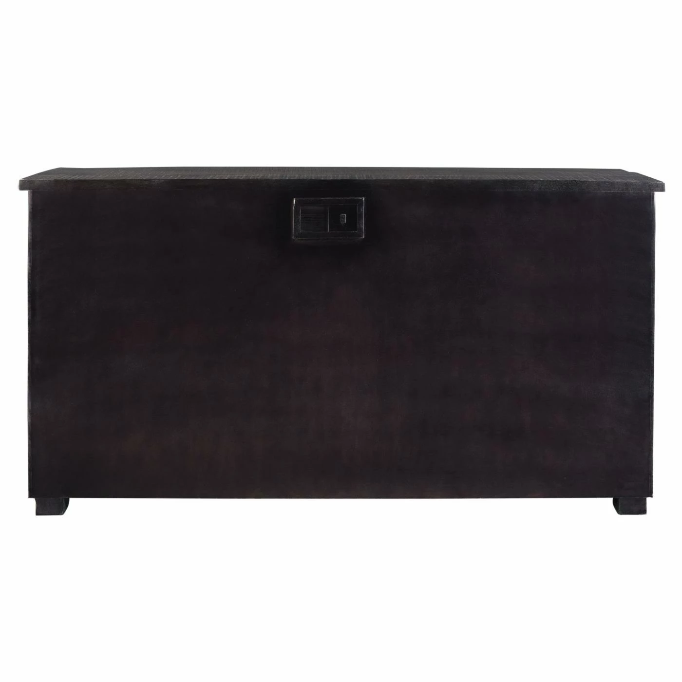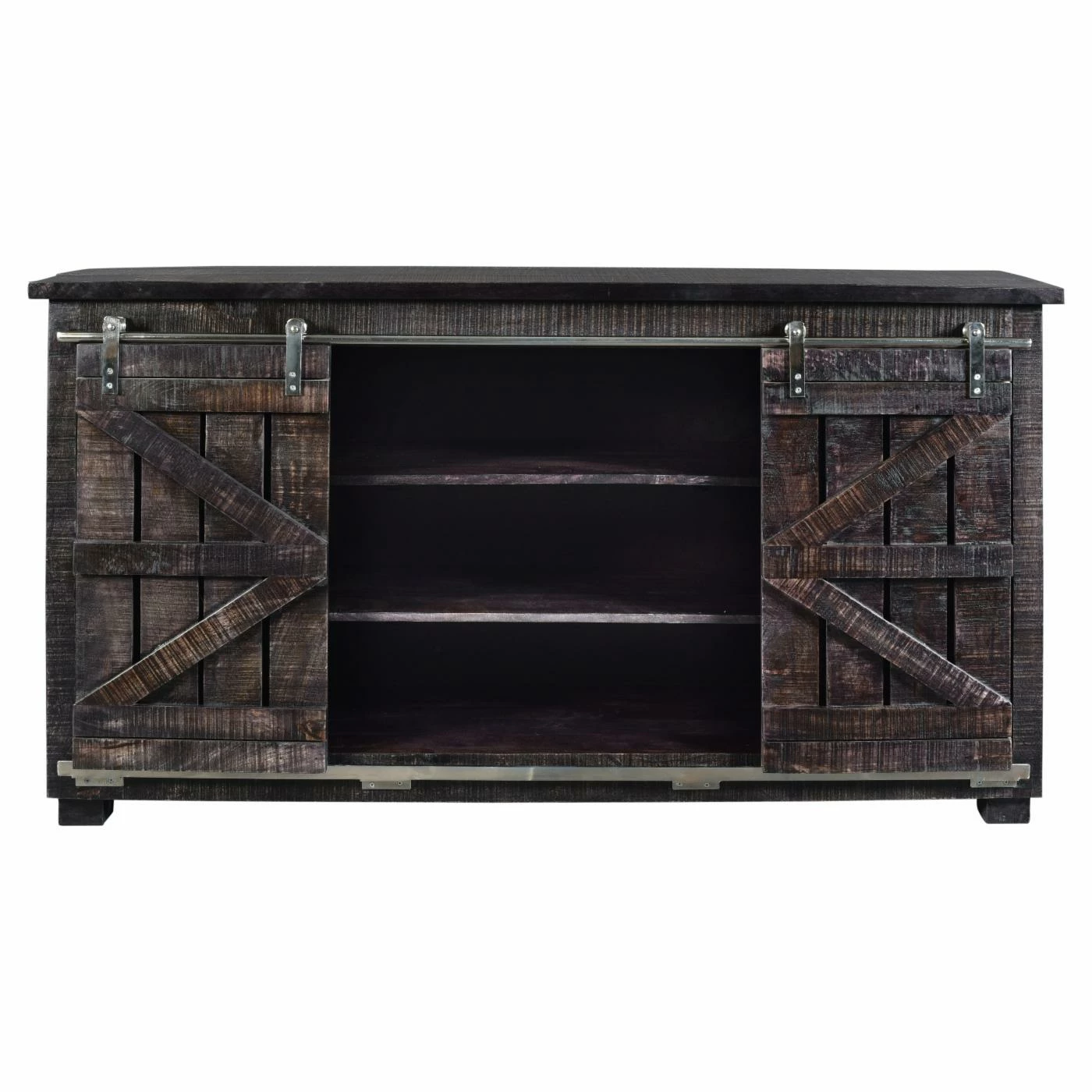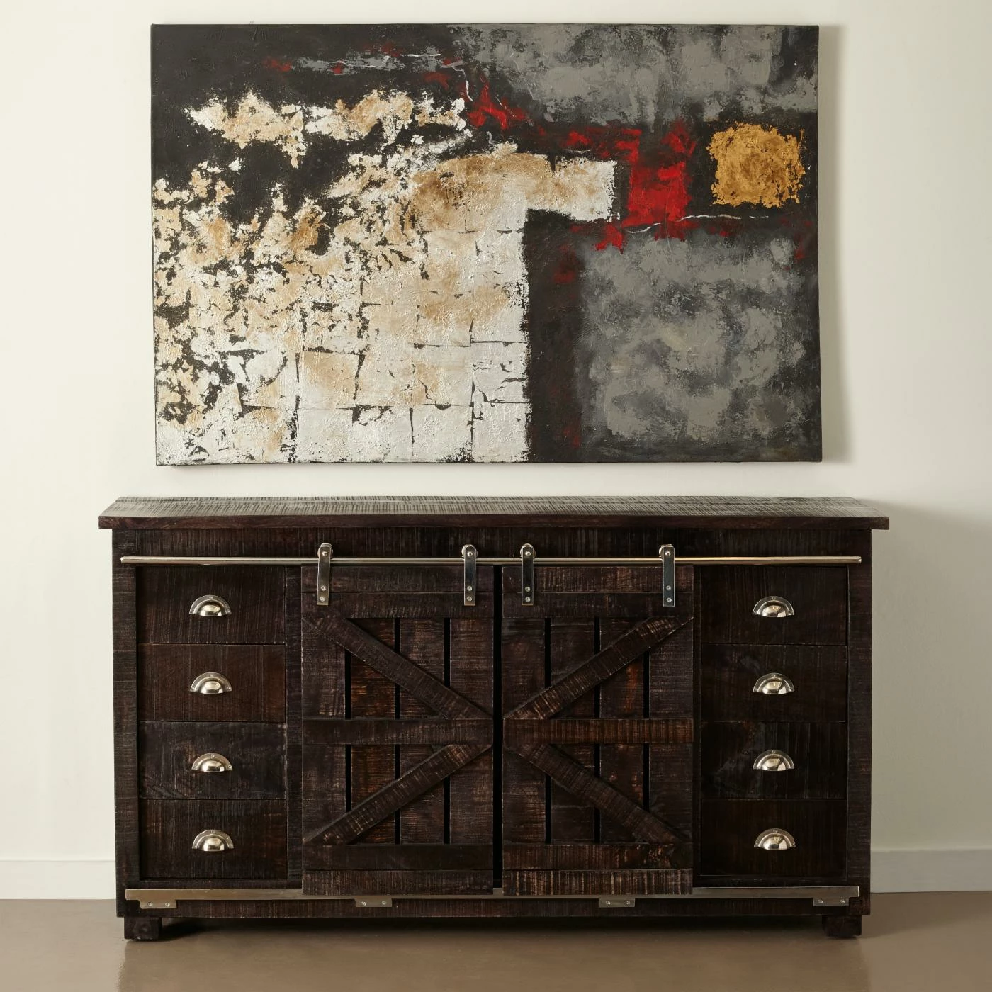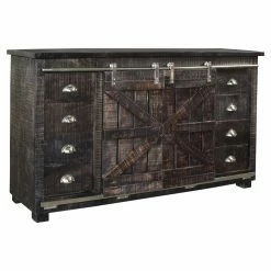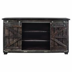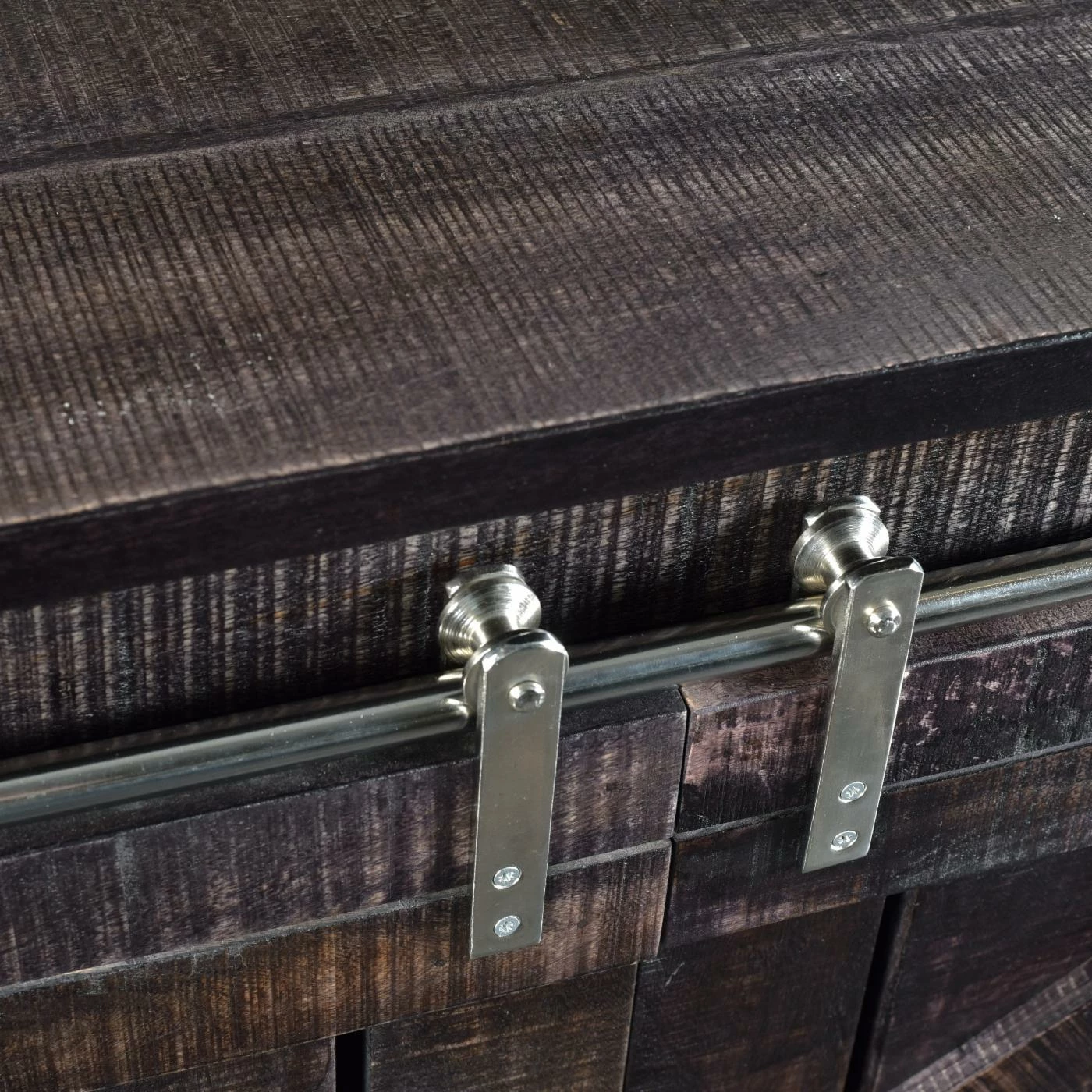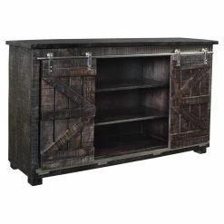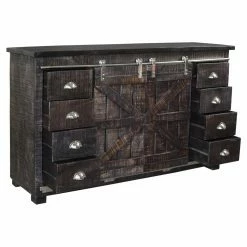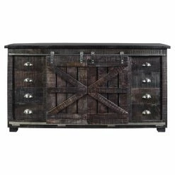The Coast to Coast Eight Drawer Two Sliding Door Credenza stands ready to handle your media needs or to serve as a uniquely rustic dining room accent. Either way, you’ll enjoy an abundance of storage space. Eight drawers can keep little things organized, and two removable shelves live behind two sliding cabinet doors. This format requires less space than typical hinged, swinging doors. Sliding doors are patterned after antique barns with planks and crossbars in a Union Jack pattern. The rear panel is fitted with cable access holes, allowing this unit to serve as a media console or TV stand. Drawers feature chrome-finished metal cup pull hardware.