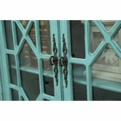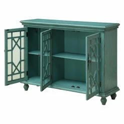 Brighten your home with the Coast to Coast Imports Three Door Media Console, which comes in a cheerful bayberry blue finish. Three doors feature a glass overlay, giving a peek of the storage space inside this piece. The interior includes two convenient shelves, along with access for cords and media cables.