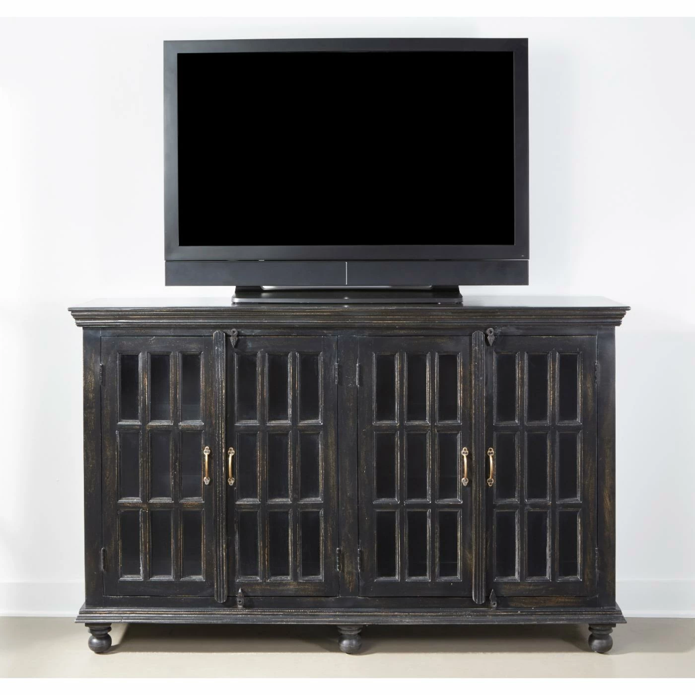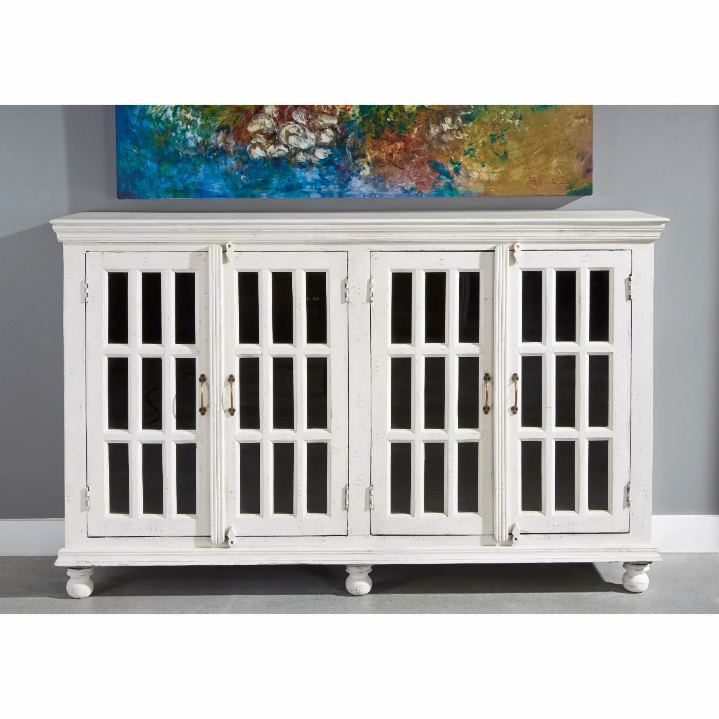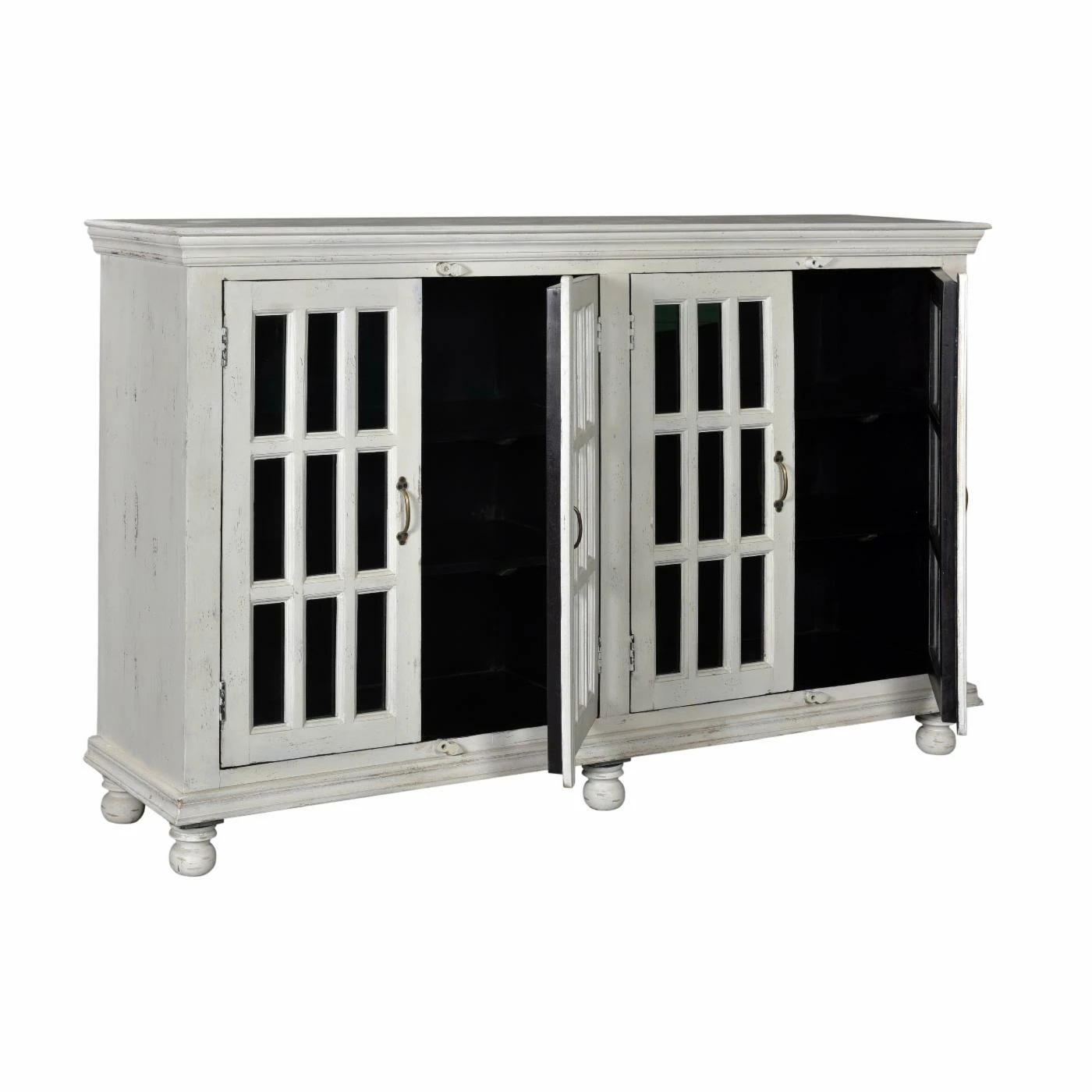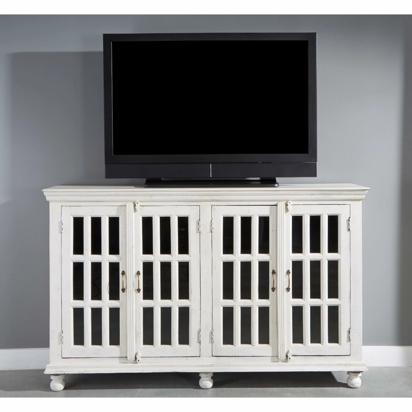 Add classic, elegant style to your living room or family room with the Coast to Coast Rustic Distressed TV Stand. Constructed of mango wood and engineered wood, this TV stand has four cabinet doors. Each door features glass windowpane fronts with fret work. Turned feet and molded details on the top and bottom of the stand add to its traditional look.