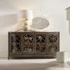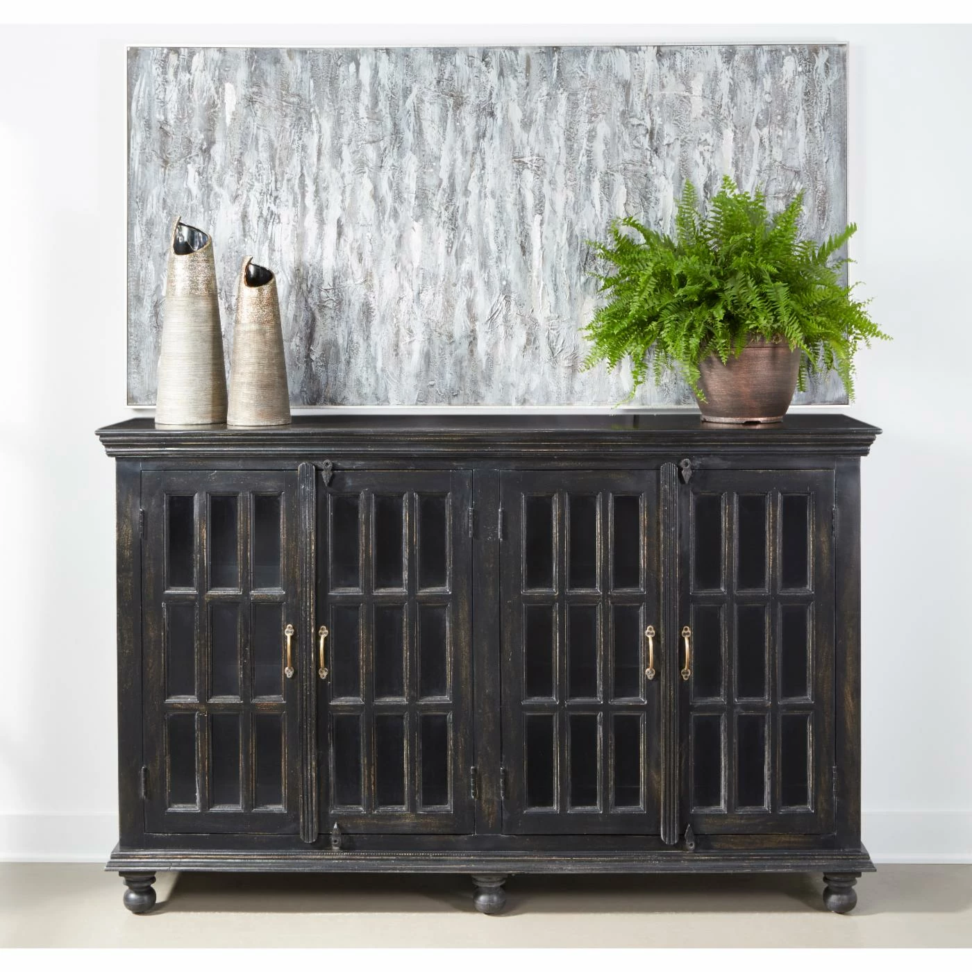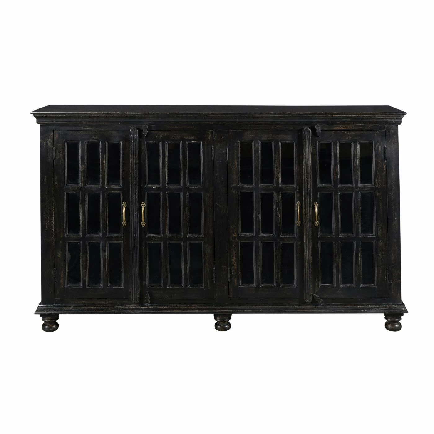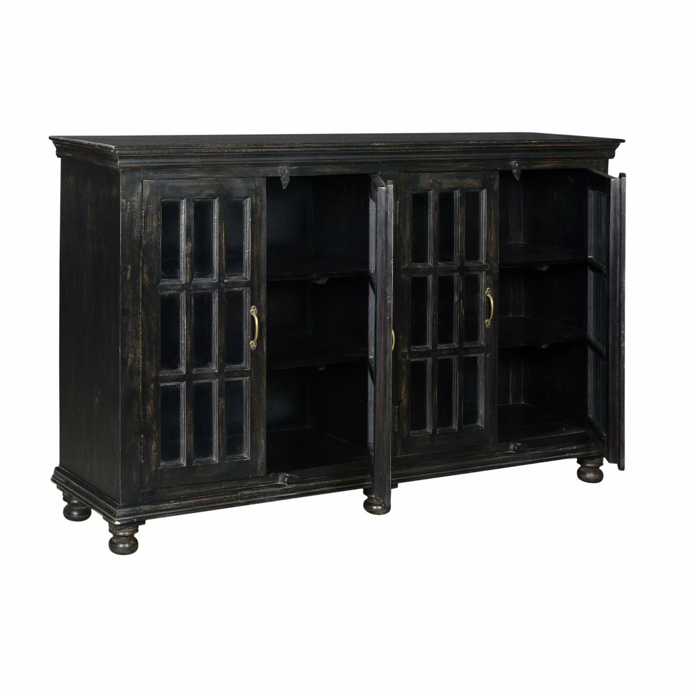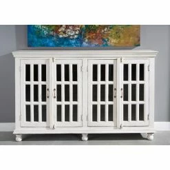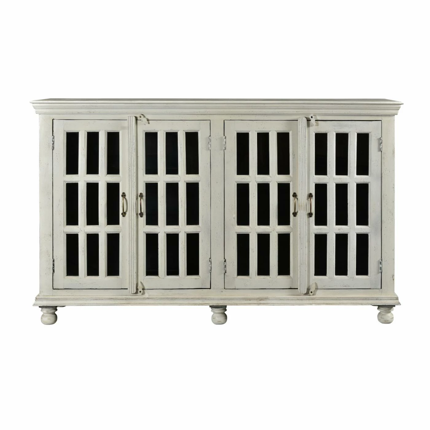 Add classic, elegant style to your living room or family room with the Coast to Coast Rustic Distressed TV Stand. Constructed of mango wood and engineered wood, this TV stand has four cabinet doors. Each door features glass windowpane fronts with fret work. Turned feet and molded details on the top and bottom of the stand add to its traditional look.