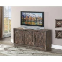 The unique geometric cube design on the front of the Coast to Coast Tumbler TV Stand – Dark Brown adds subtle dimension to your living room. Hidden storage is provided by the three cabinet spaces with fixed shelving. Fill the shelves with books, movies, games, consoles, and more. The Tumbler dark brown finish is lightly distressed for a touch of rustic appeal.
