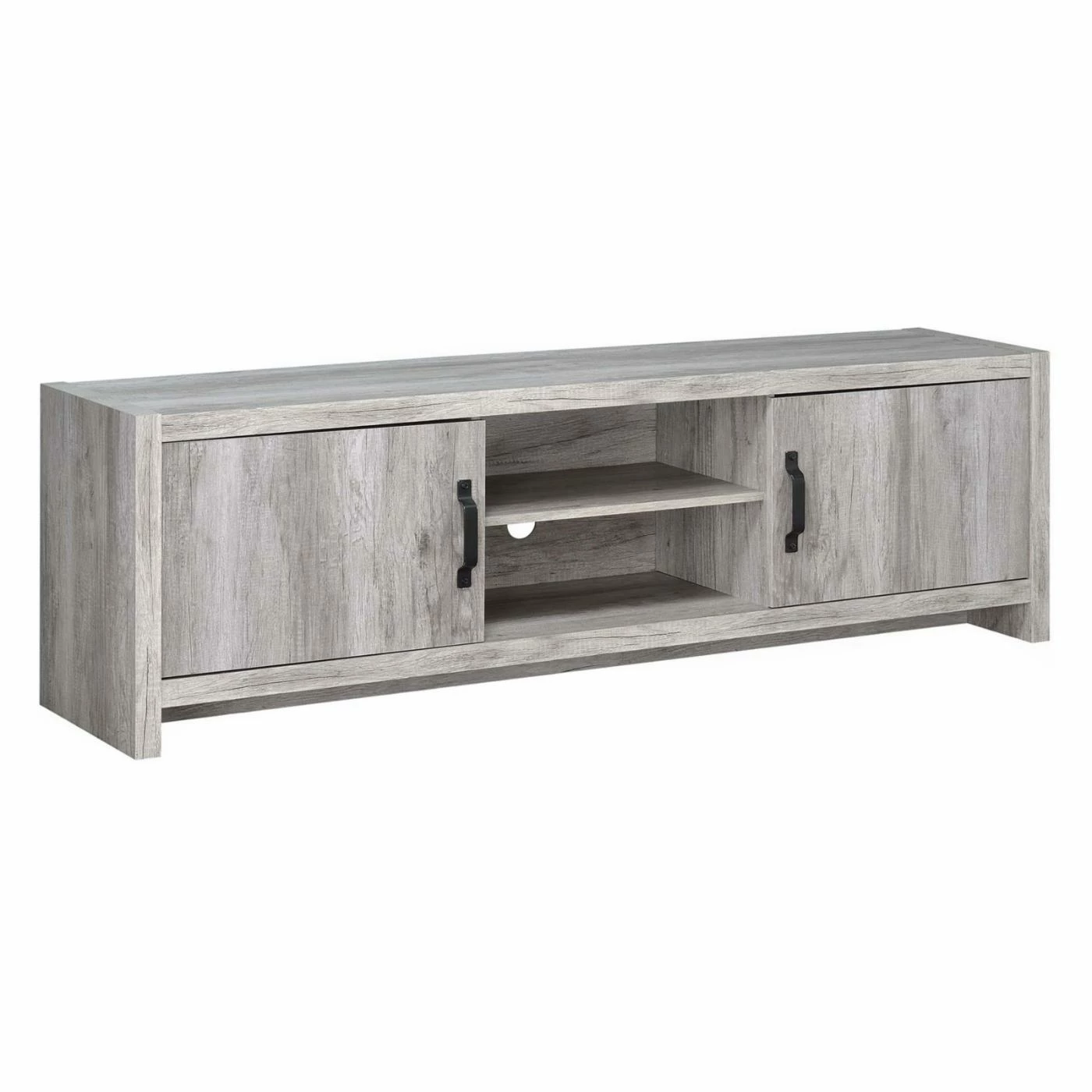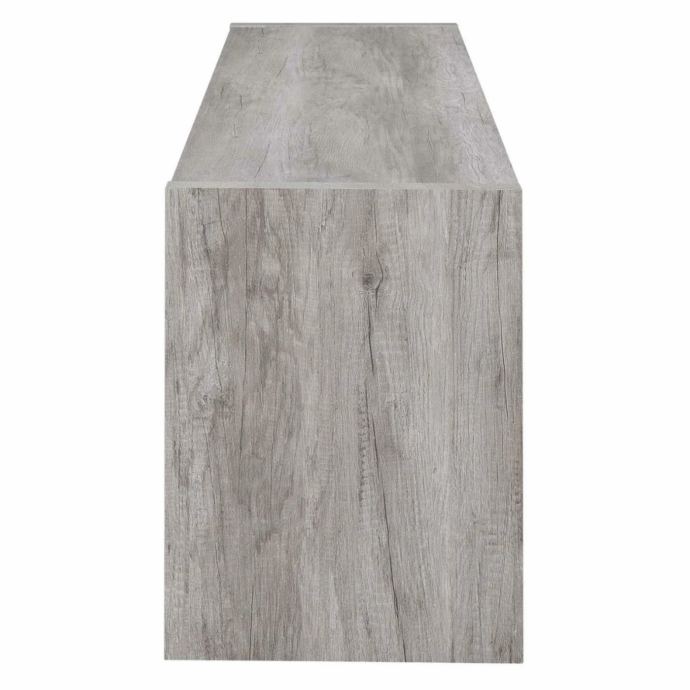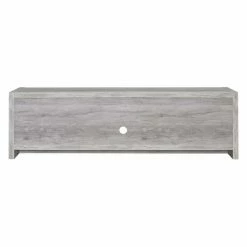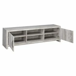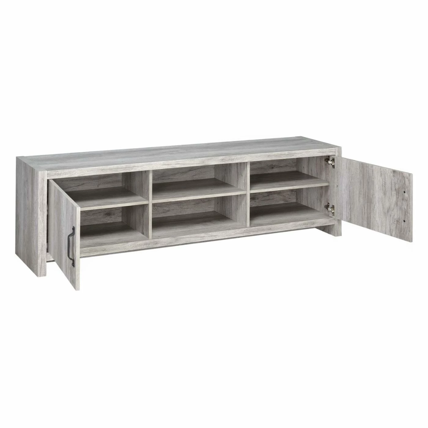Add a touch of updated rustic style to any room with the Coaster Furniture 71 in. Low Profile TV Console – Gray Driftwood. The slim profile and clean lines of this table give it a little edge. Its grainy, graywashed finish keep it rooted in traditional farmhouse style. The open shelves are perfect for stashing electronics, and two capacious cabinets with adjustable interior shelves offer storage for games, movies, and more.