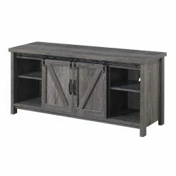 Keep it natural with the Convenience Concepts Blake Barn Door TV Stand. This furniture piece features a rustic style that will not only refresh your home decor but will optimize storage and display space. it is natural looking with a clean lined silhouette. This unit provides 2 sliding doors with metal handles hanging from a metal rod. The sliding doors allow quick and easy access to a total of 6 shelves, enough space for all your entertainment essentials. Place in your living room, den or home office, as this accent piece has endless versatility. Crafted from particle board and finished with a rich melamine veneer, this rectangle furniture was created with longevity and easy maintenance in mind. Stream your favorite TV series right after delivery with its 9 step assembly. Look for additional rustic items by Convenience Concepts. Each sold separately.
