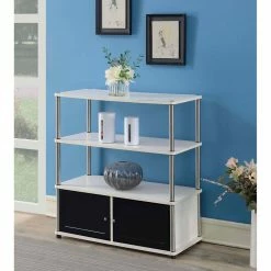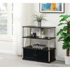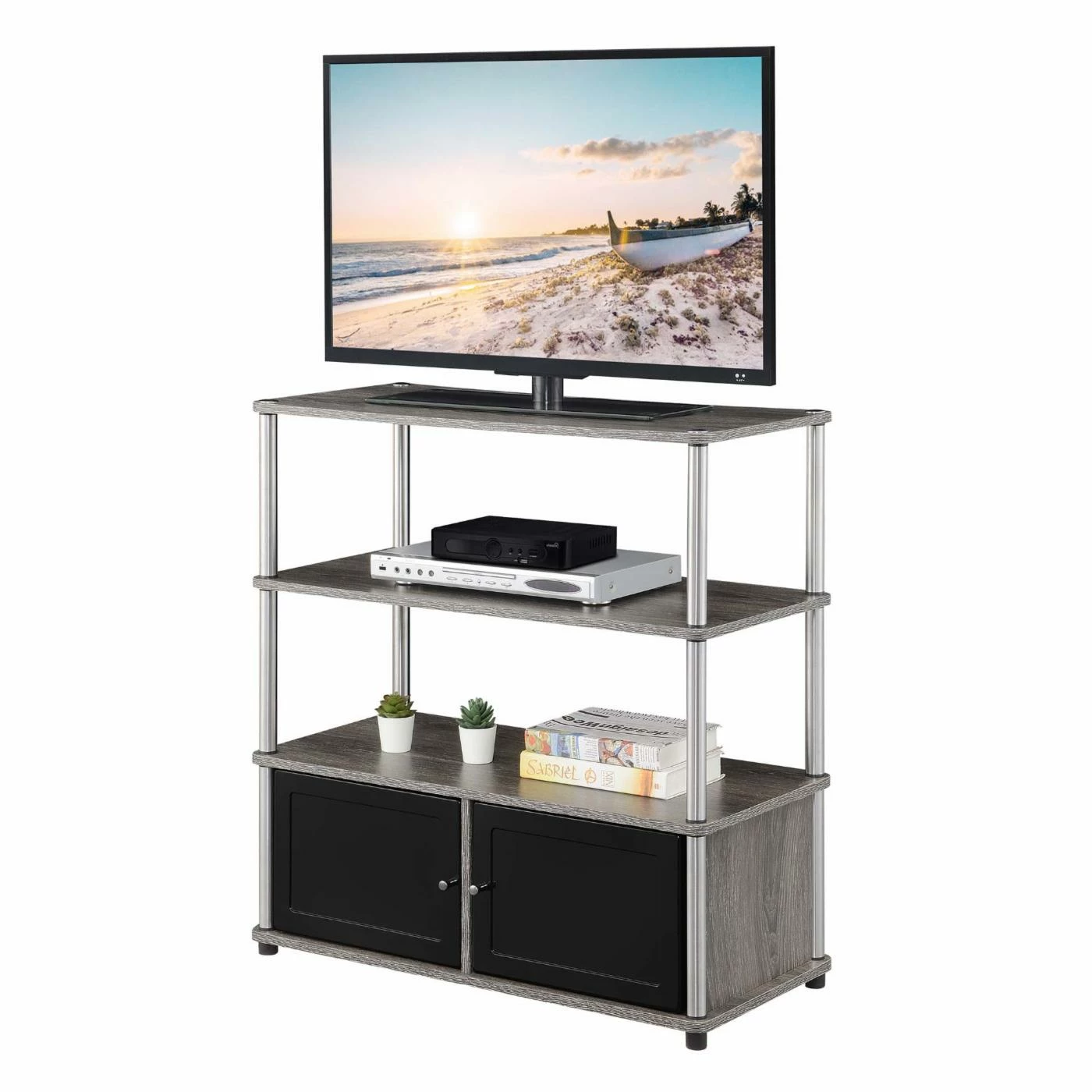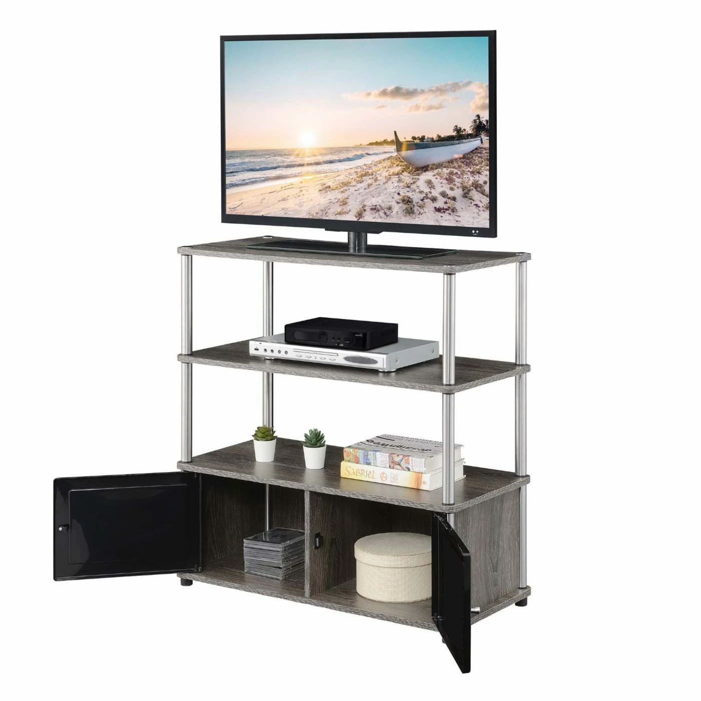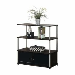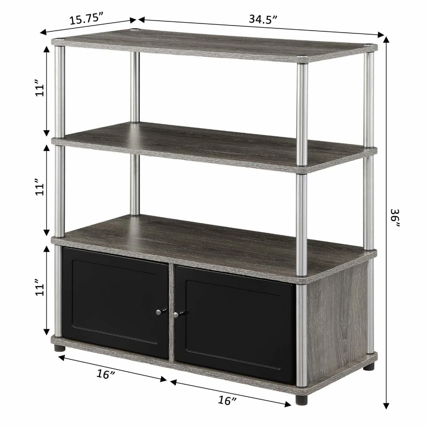 The tall design of the Convenience Concepts Designs2Go Highboy TV Stand gives you plenty of storage and no shortage of style. Stainless steel poles support shelves of warp-free particle board that are finished with veneers in the hue of your choice. Two open shelves let you find the perfect home for you flat-panel TV and all the consoles, cable boxes, and AV components that you need to have right at hand. At the bottom you have a pair of plastic-faced doors covering roomy interior storage.