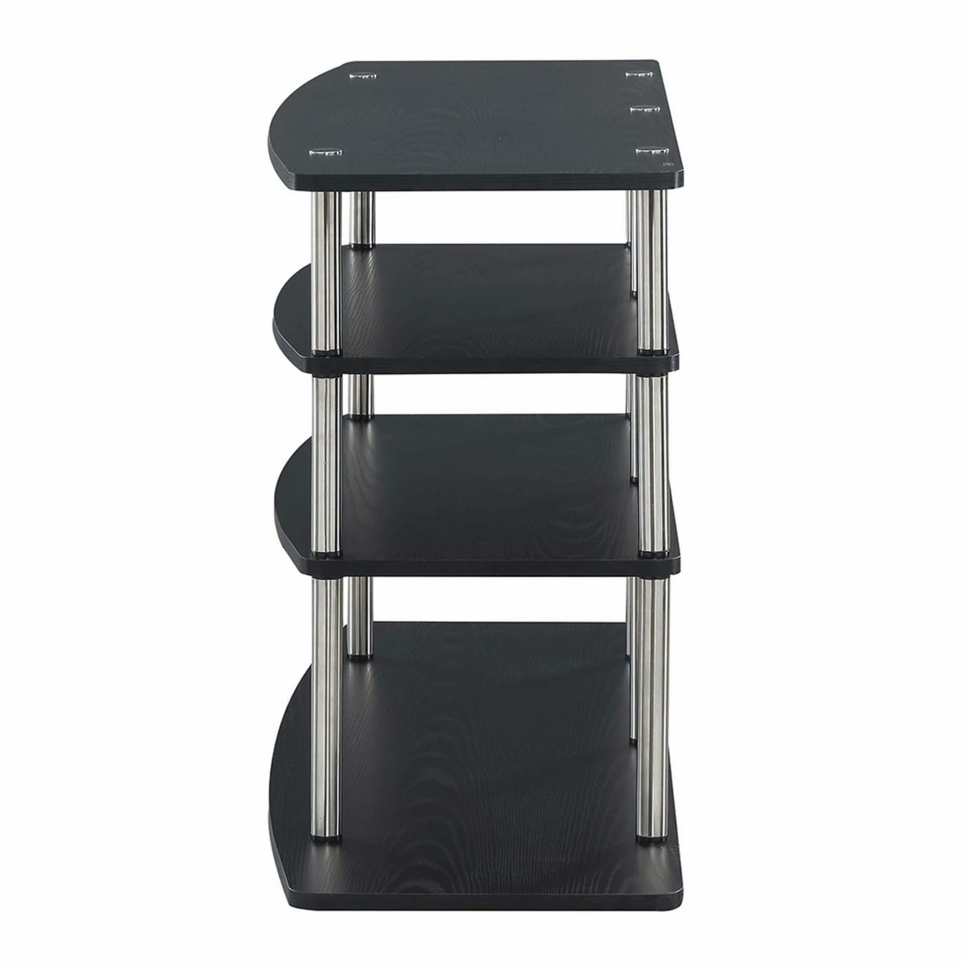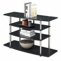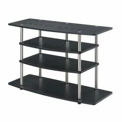 An open concept design makes the Convenience Concepts Designs2Go No Tools Wide Highboy TV Stand a great way to lend a spacious feel to your living room. For added stability, this TV stand features a wider top and lower base shelf plus two open shelves between for electronic components. Industrial style comes from sturdy engineered wood shelves in a black wood grain melamine supported by polished stainless steel posts. You could also use this highboy TV stand as a bookshelf.