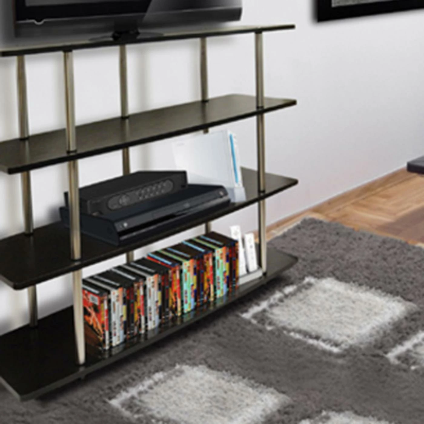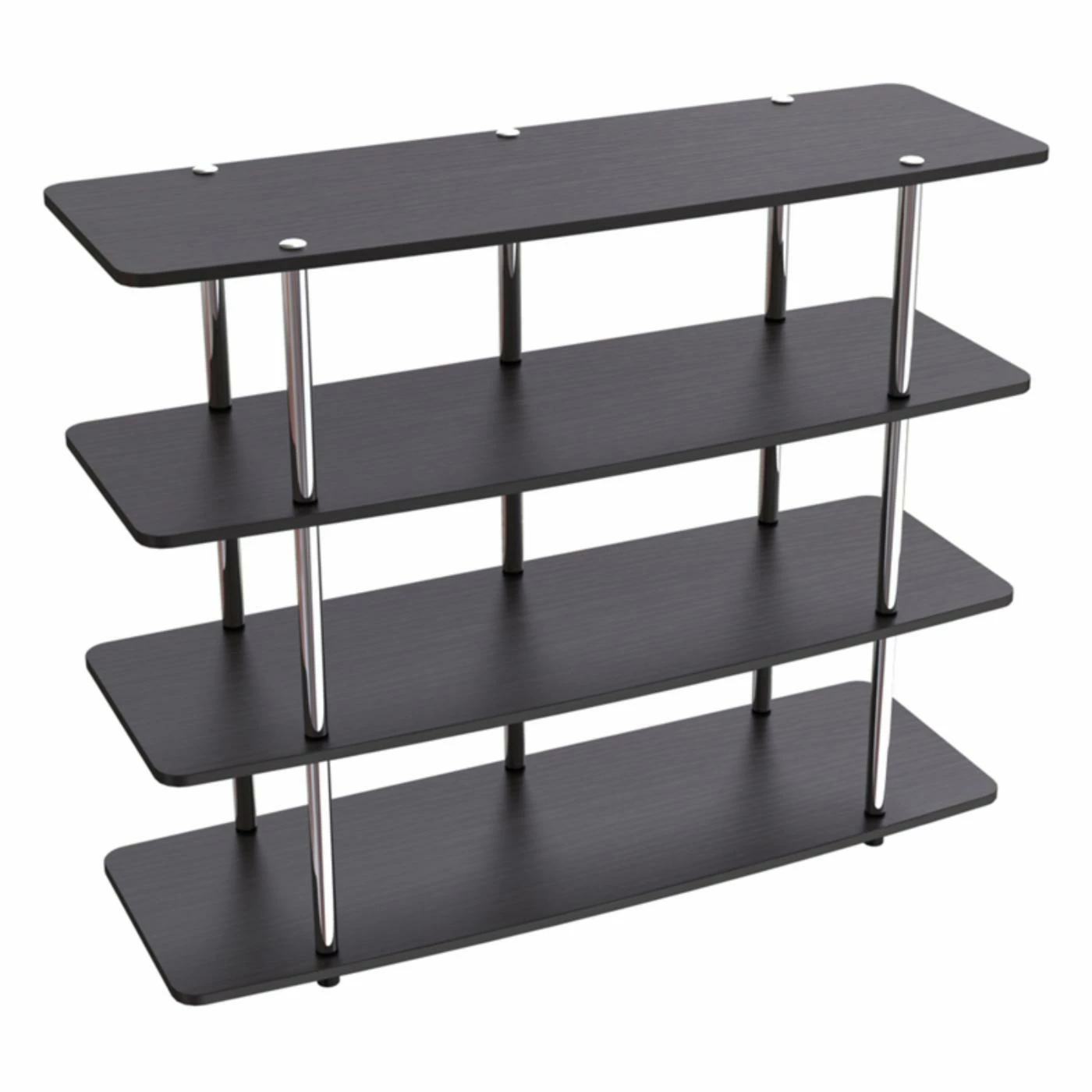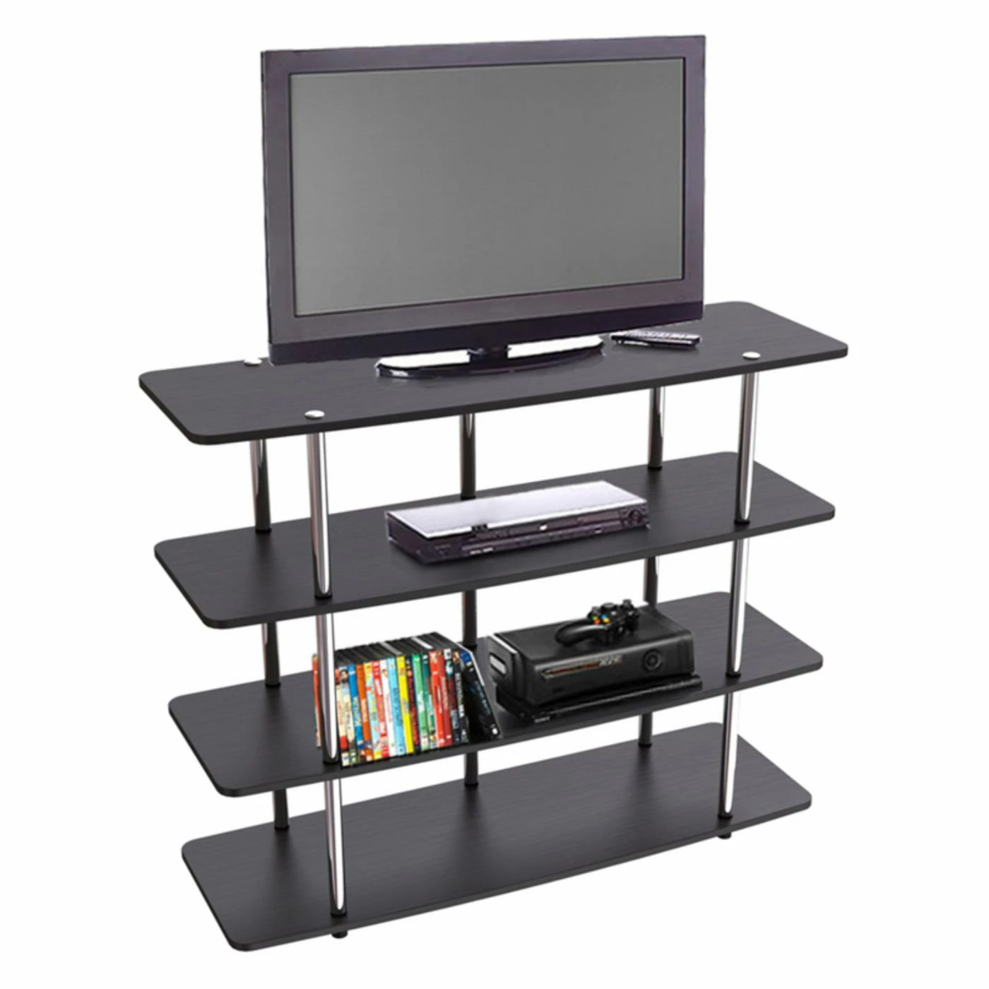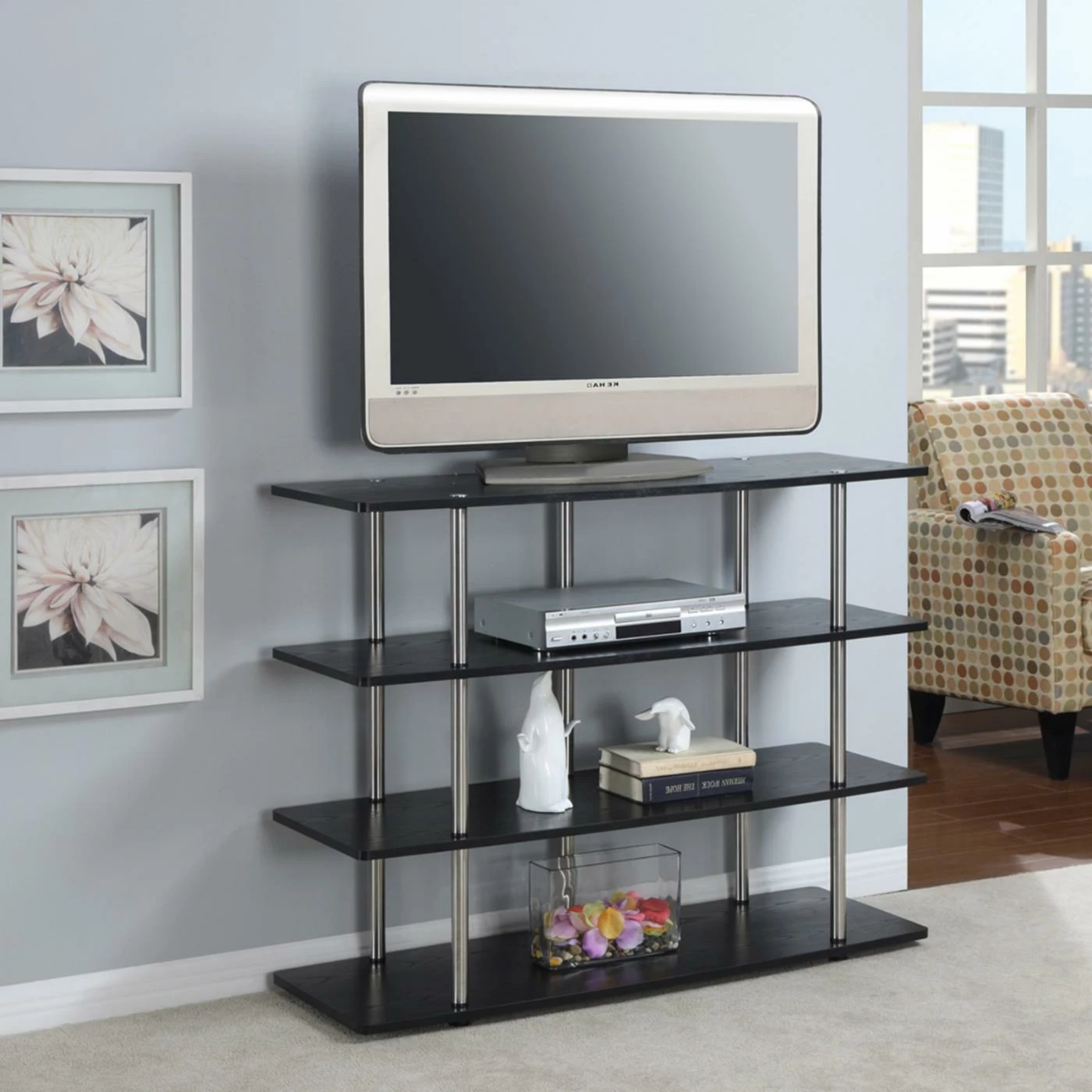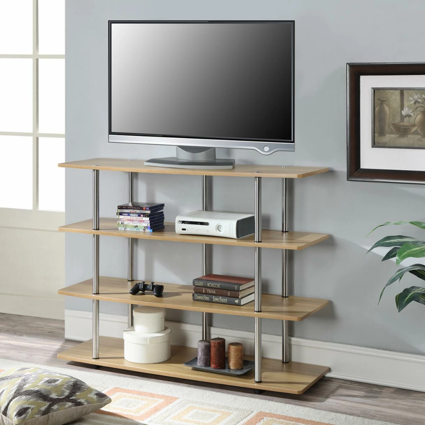 With the Convenience Concepts Designs2Goโข XL Highboy TV Stand, you can enjoy endless hours of entertainment in sleek style. This handsome TV stand has more than enough storage on its four large wood shelves. Its simple and attractive design is all brought together by stainless steel support poles.