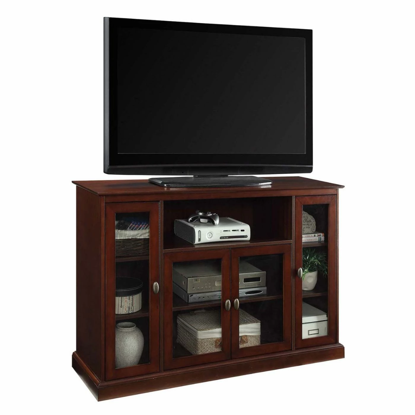 A massive, beautiful addition to your classical furniture set, the Convenience Concepts Summit TV Stand provides a place for all of your television accessories. The frame of this unit is constructed from solid wood and comes overlaid with wood-grain veneers for a handmade feel. A finish of your choosing coats the frame, offering a captivating color. Four cabinet doors offer storage, each fronted by a clear tempered glass panel and featuring plenty of shelf storage. An open center shelf provides a cozy home for your BluRay player or favorite game console.