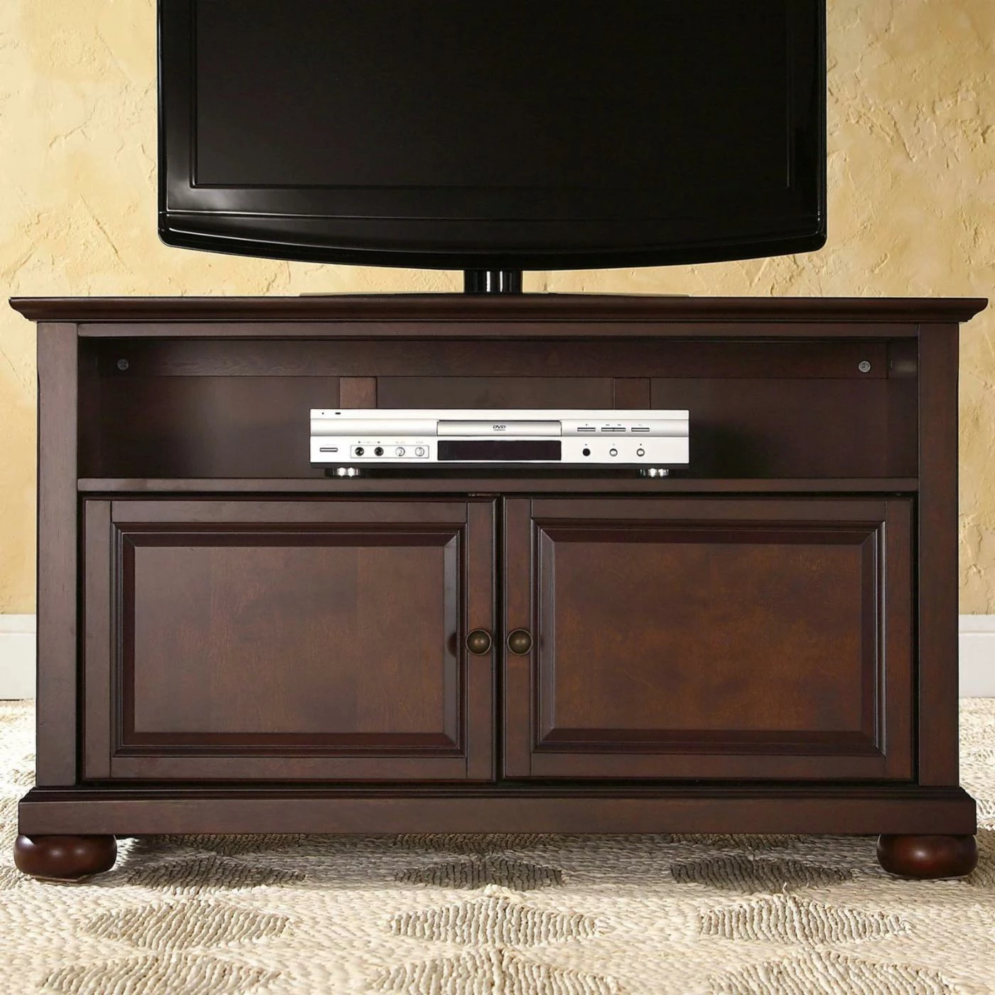 The Crosley Alexandria 42 in. TV Stand – Vintage Mahogany is made of solid wood and high quality veneers and has an elegant, vintage mahogany finish and beautiful antique brass hardware that blends perfectly with both modern and antique furnishings. This TV console has a small footprint but is big on storage options. It accommodates up to a 46-inch wide flat panel TV and has room to store stacks of DVDs, games, and CDs. Storage features include an adjustable shelf behind two raised panel doors and an open shelf for media players. A cord management feature inside keeps wires untangled and hidden. Perfectly sized for the master bedroom!