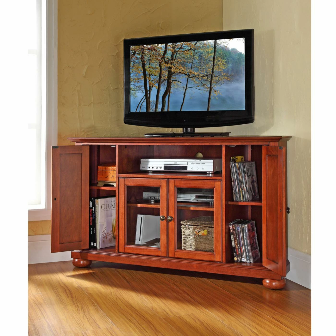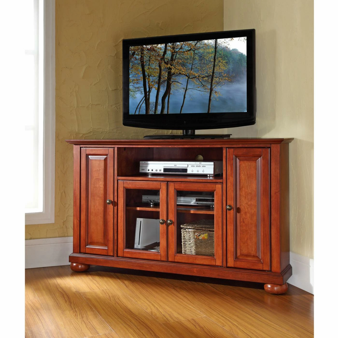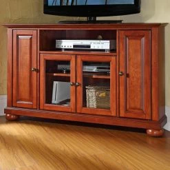 The Crosley Alexandria 48 in. Corner TV Stand – Classic Cherry has traditional bun feet and plenty of storage space to accommodate your modern home. This entertainment console fits into a corner to save space and holds up to a 52-inch wide flat panel TV. It is made of solid hardwood and quality veneers finished in a multi-step, hand rubbed classic cherry. Antique brass hardware accentuates the classic look of this corner TV stand. It has two raised panel doors that each have an adjustable shelf and an extra adjustable shelf tucked behind the two tempered glass doors. An open shelf and cord management feature holds electronics while keeping wires under control.
