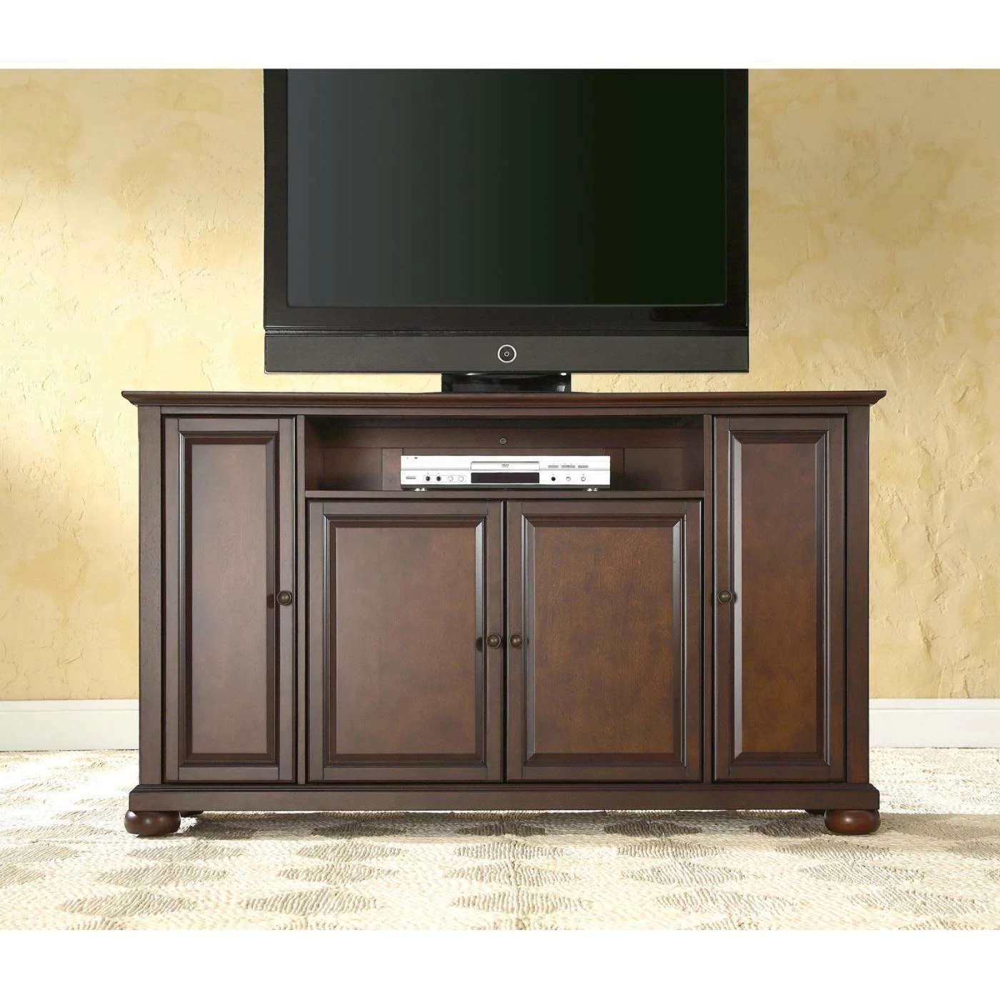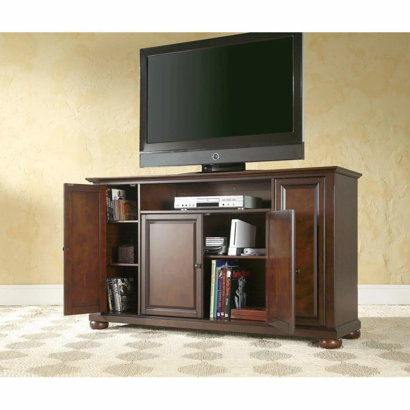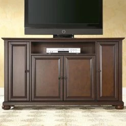 The Crosley Alexandria 60 in. TV Stand – Vintage Mahogany is a lovely addition to your home theater. It is crafted of solid hardwood and veneers with a striking vintage mahogany finish that was hand applied using a multi-step process. Decorative bun feet and simple, antique brass hardware add a distinctive look. This TV stand is loaded with traditional design and smart storage options. It holds up to a 66-inch flat panel TV and has five adjustable shelves, four of which are hidden behind handsome raised panel doors, perfect for storing DVDs, CDs, and games. The fifth shelf is open and sits just below the TV to hold your media player. Cord management keeps wires tidy and leg levelers ensure this TV console stays steady even on thick carpet. A great choice for your home.