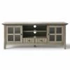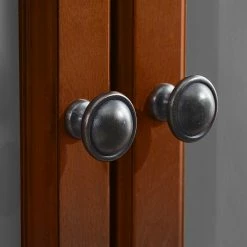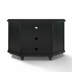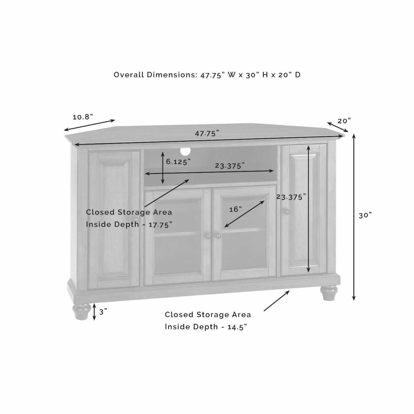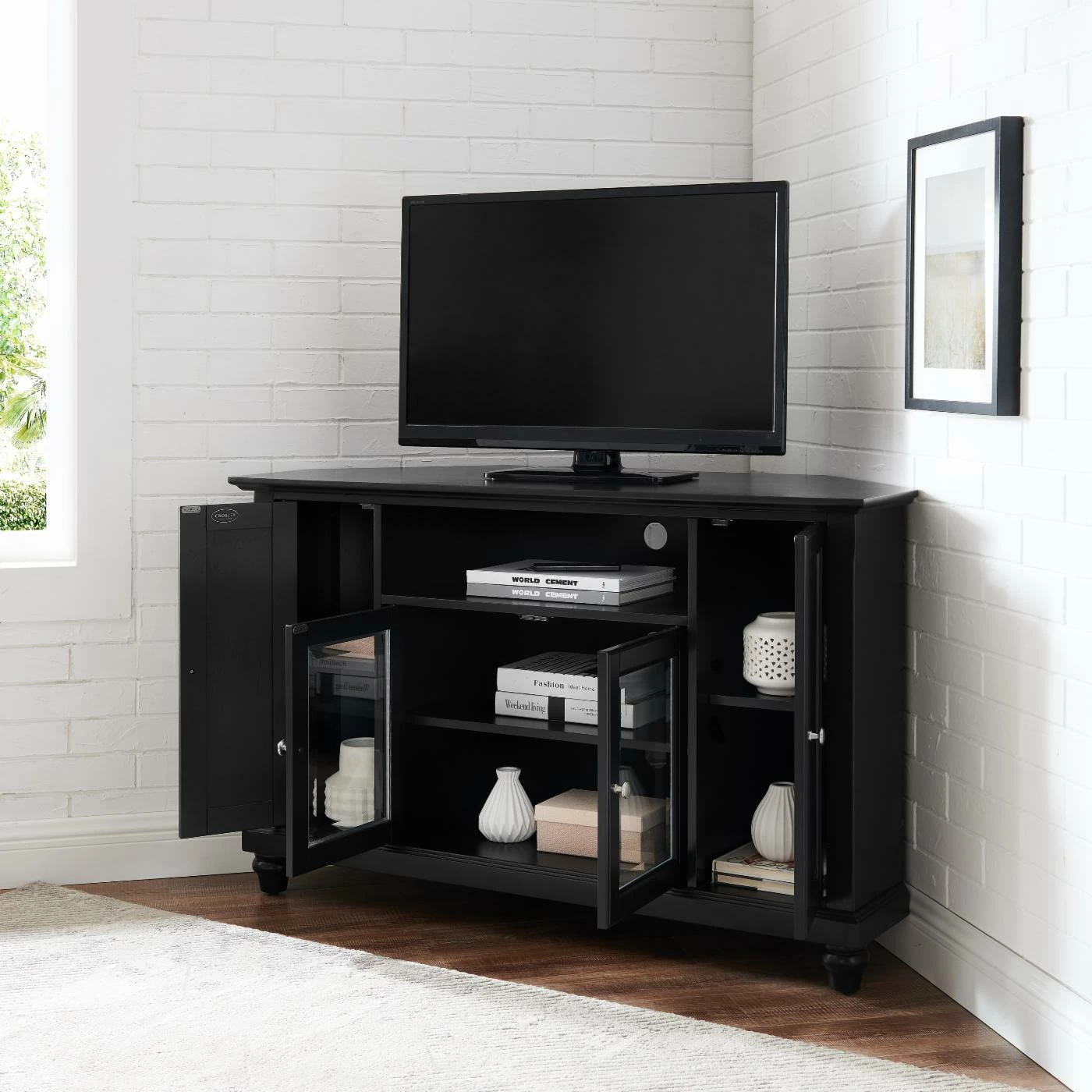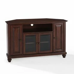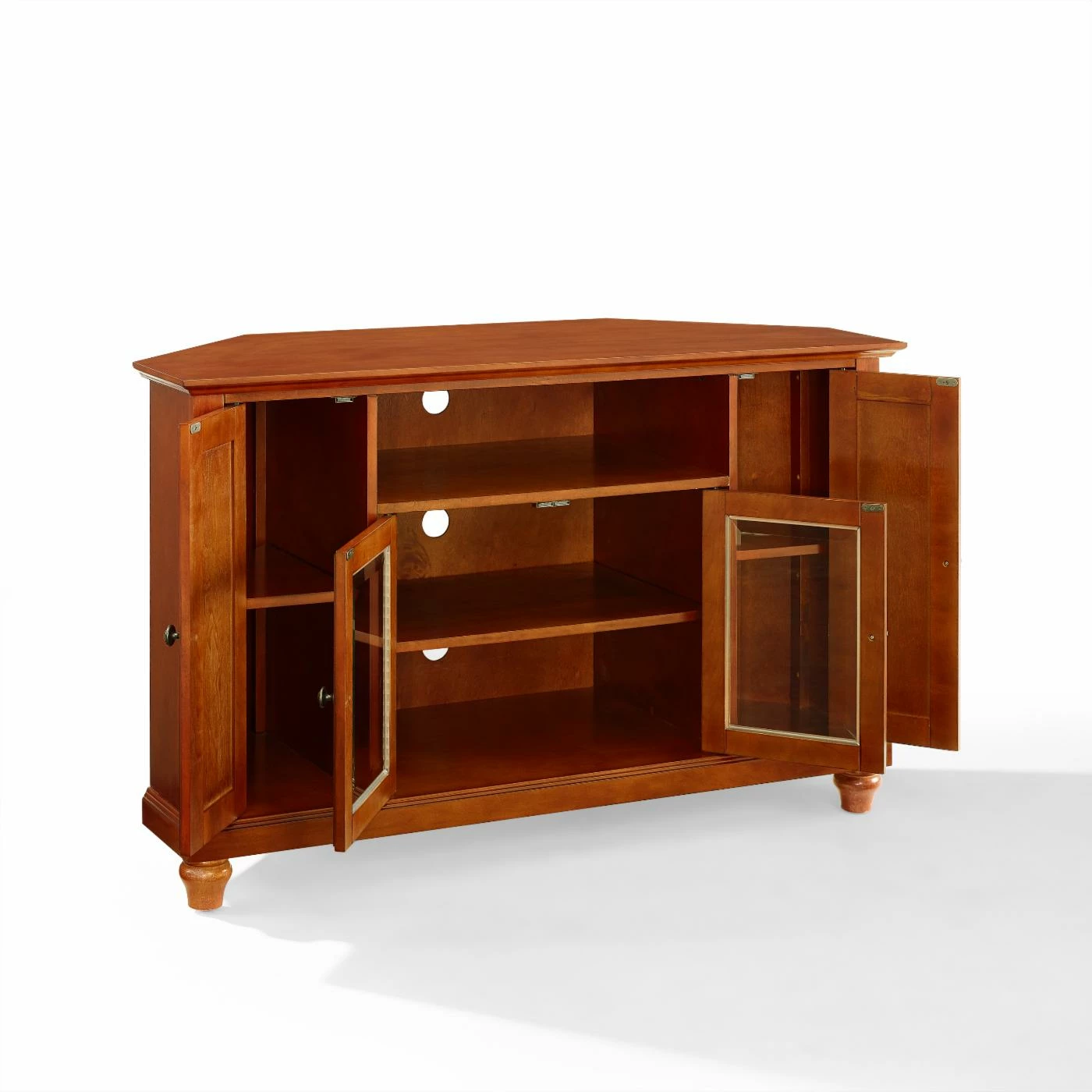 Turned feet and classic good looks define the Crosley Cambridge 48 in. Corner TV Stand. This entertainment console is well-made of solid hardwood and quality veneers finished in a multi-step, hand-rubbed finish. Brushed nickel hardware adds a touch of modern shine. This TV console fits into any corner and has ample storage space for your video library and electronic components. It has two raised panel doors that each have an adjustable shelf and an extra adjustable shelf tucked behind the two tempered glass doors. An open shelf and cord management feature holds electronics while keeping wires under control.
