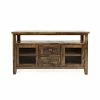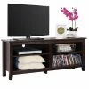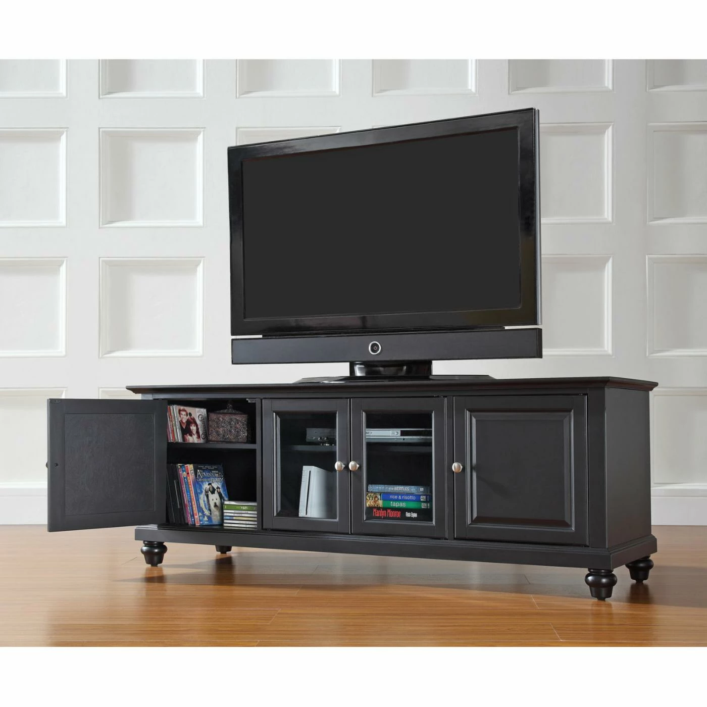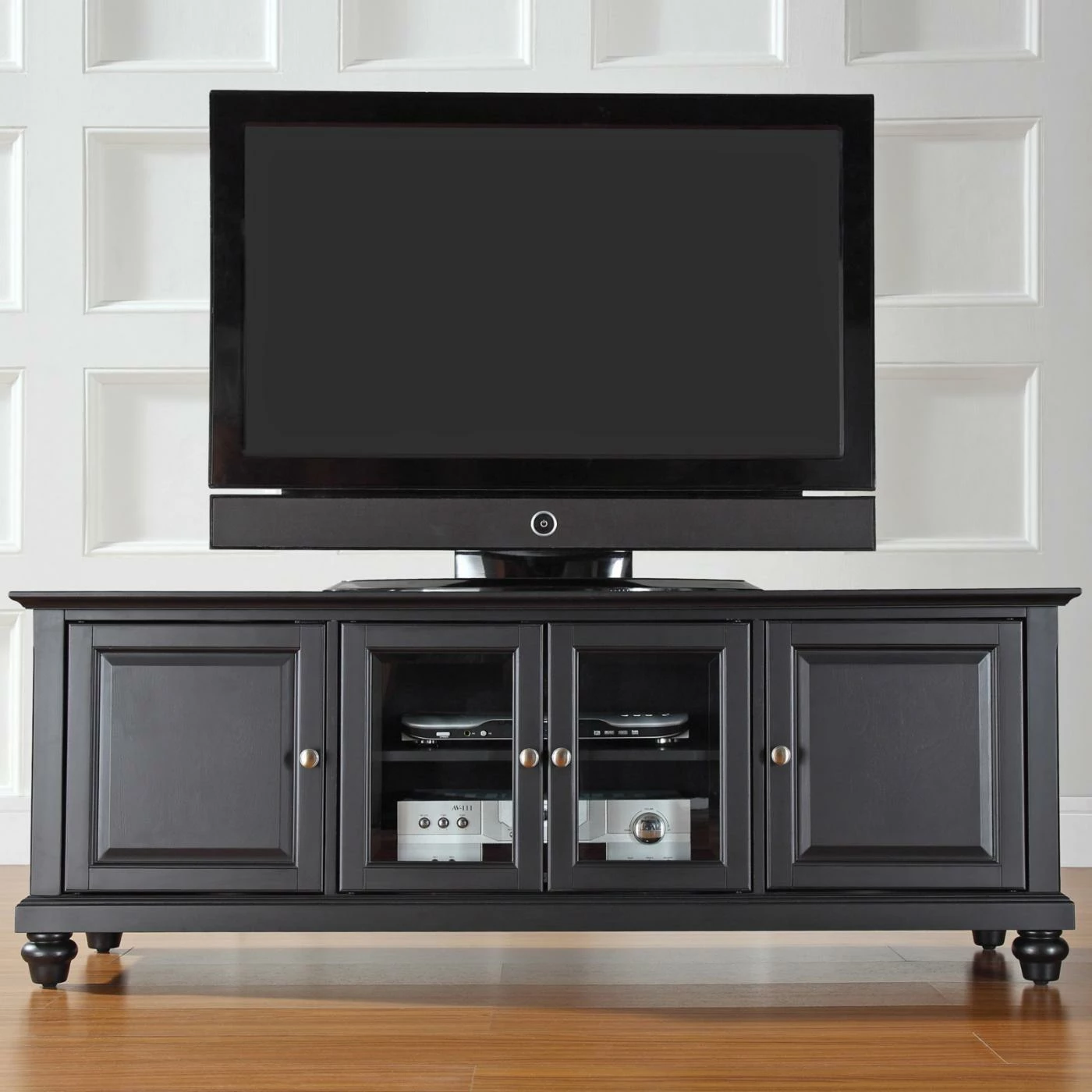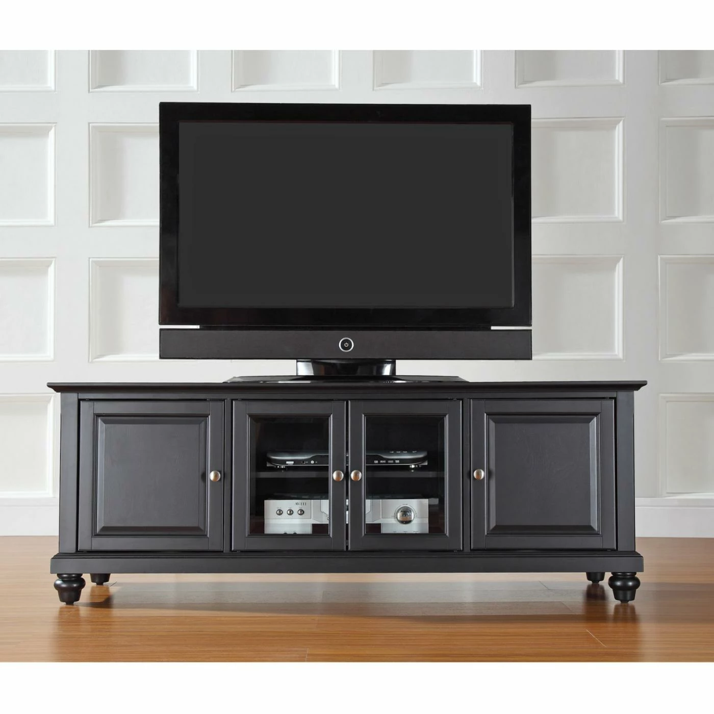 The Crosley Cambridge 60 in. Low Profile TV Stand blends modern storage with traditional style. This low profile entertainment cabinet accommodates most 66-inch flat panel screens and is just the right size to accommodate contemporary homes. It is made of hardwood and quality veneers with a hand rubbed, multi-step finish accentuated by brushed nickel hardware. Three adjustable shelves offer plenty of versatile storage while the cord management feature tames the unsightly mess of tangled wires. Two raised panel doors conceal stacks of DVDs, games, and media components while tempered glass doors protect electronic components from dust and allow remote control access. Elegantly turned feet lend a spacious feel.