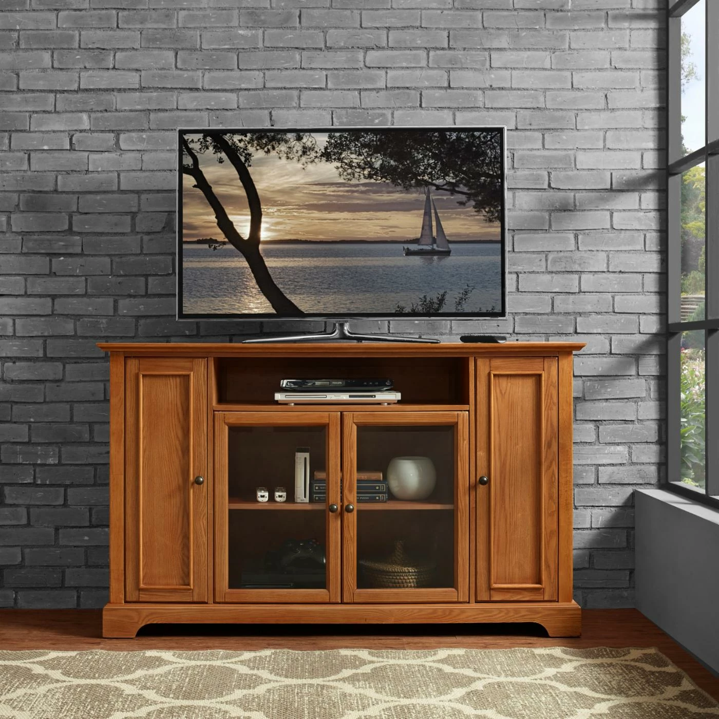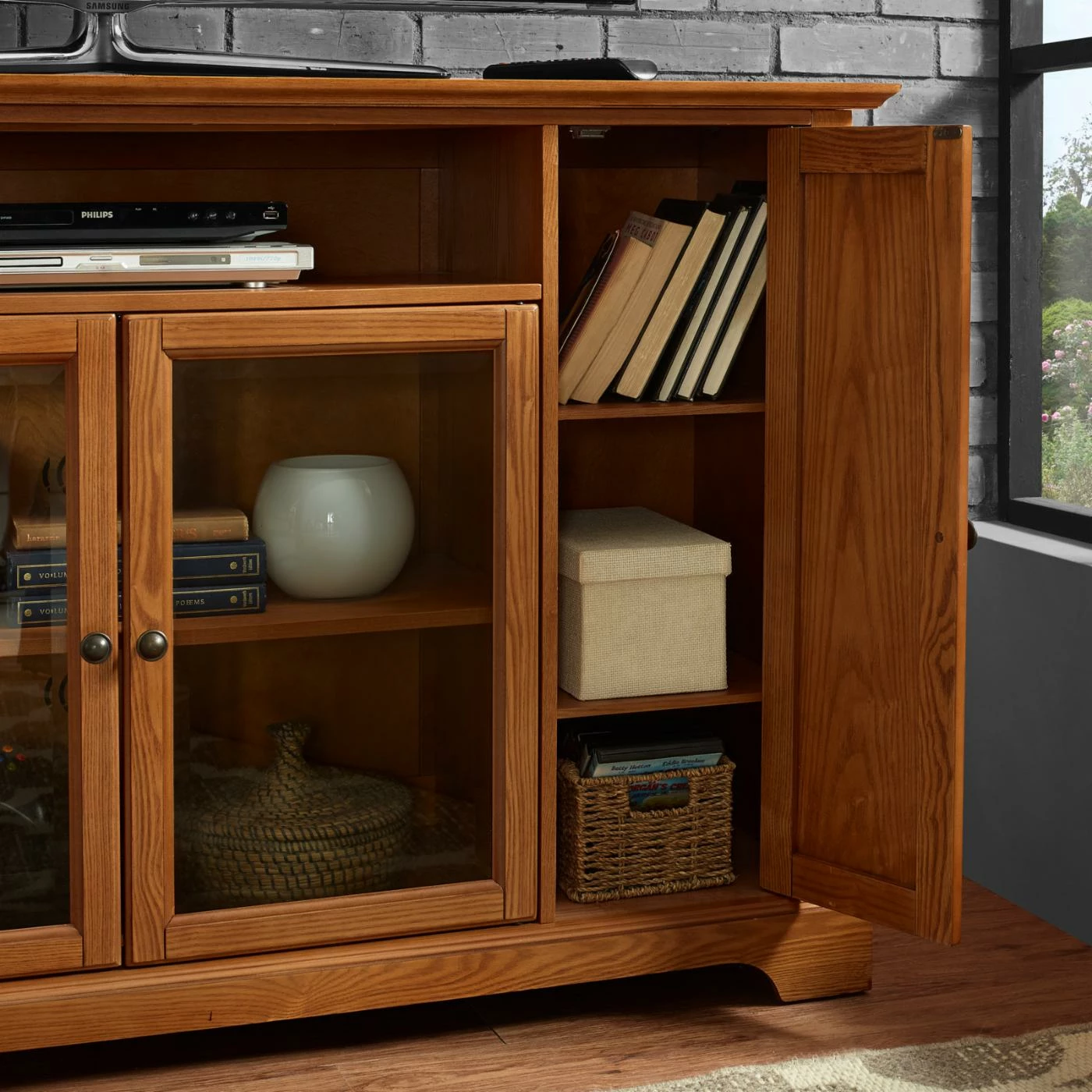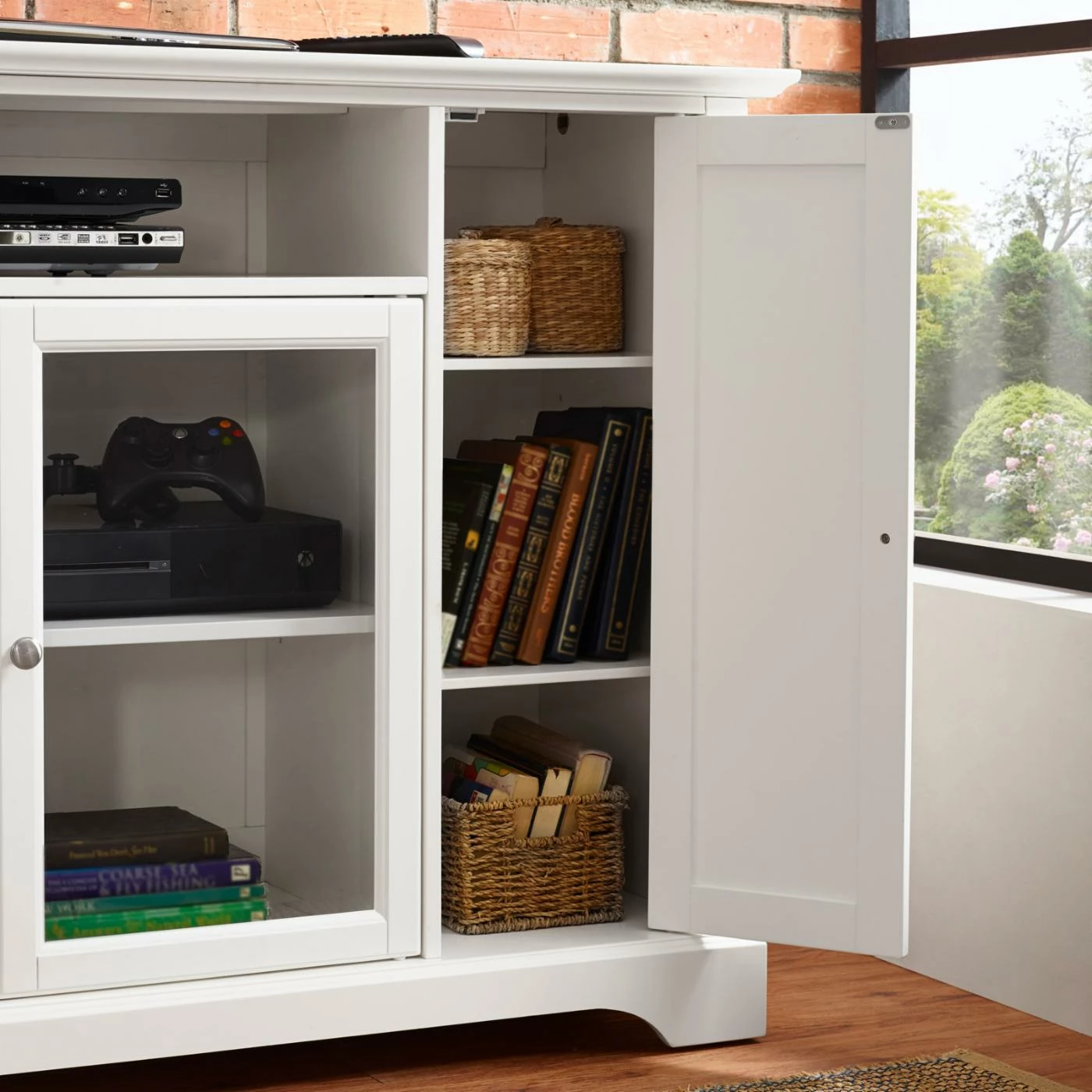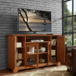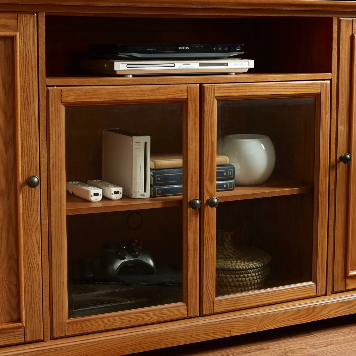 Picture frame moldings and classic bracket feet ensure this Crosley Campbell 60 in. TV Stand will work with any living room or home theater decor. Smart storage features include one media opening, cord management holes, and two wood cupboard doors that each house two adjustable shelves. The two center tempered glass doors are remote control-friendly and open to reveal one adjustable shelf. This TV stand is crafted from a collection of hardwoods and veneers in your choice of available finishes.