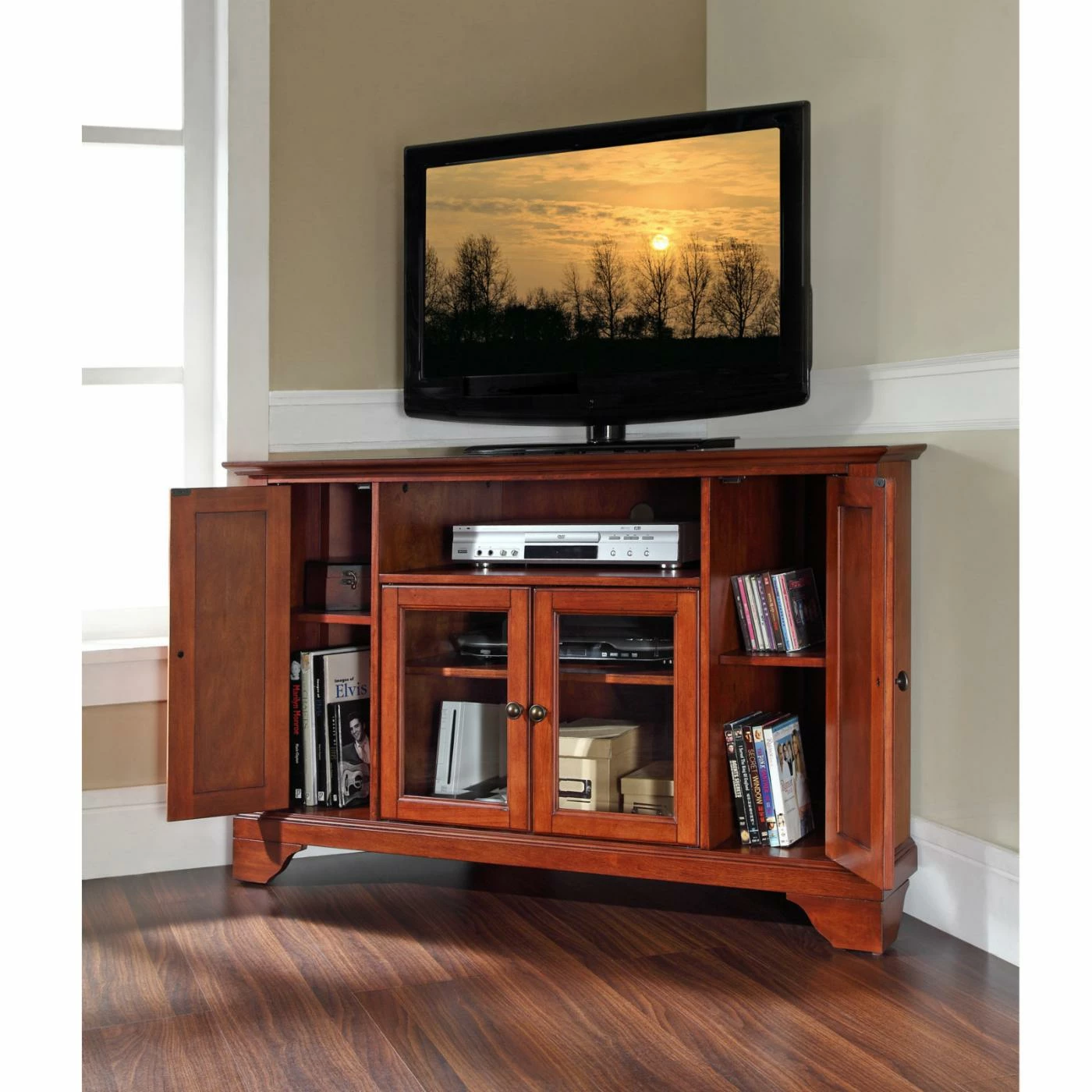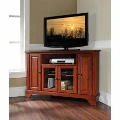 The Crosley LaFayette 48 in. Corner TV Stand is no wallflower. This classic entertainment console does snuggle into the corner, but does it stylishly. It is made of solid hardwood and veneers and is finished in warm color with antique brass hardware that gets noticed. It has two raised panel doors on either side (each with an adjustable shelf inside) and an extra adjustable shelf tucked behind the two tempered glass doors. An open shelf and cord management feature holds electronics and keeps wires out of sight.